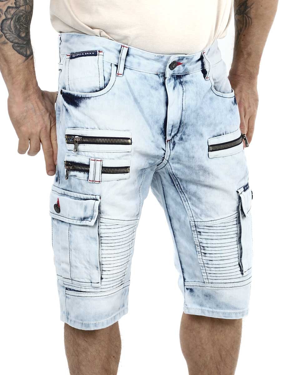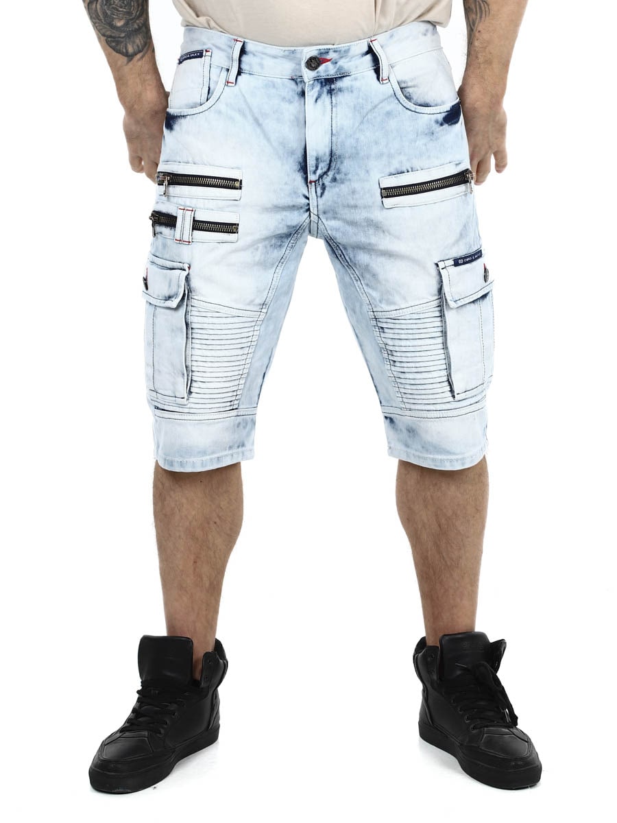 Cargoshorts i stentvättad denim. Knälång modell med fem klassiska fickor samt två lårfickor. Dragkedjorna framtill är enbart en designdetalj.