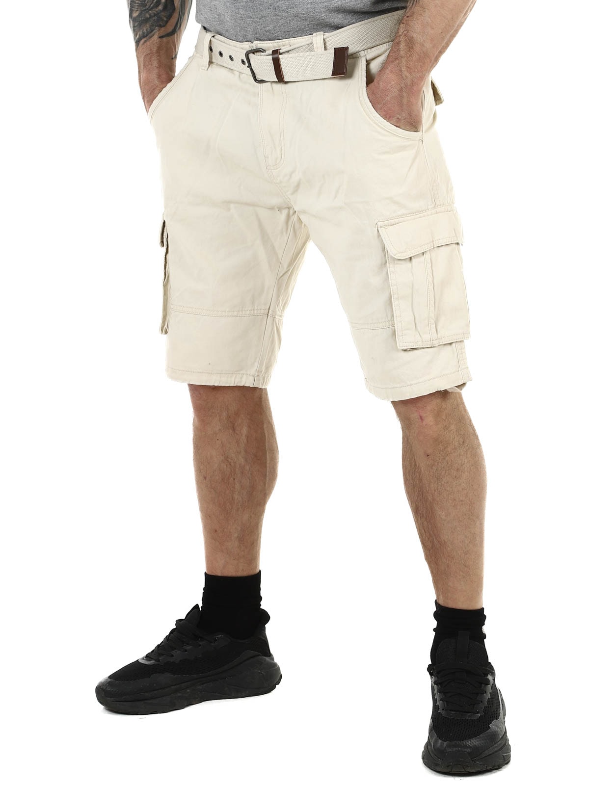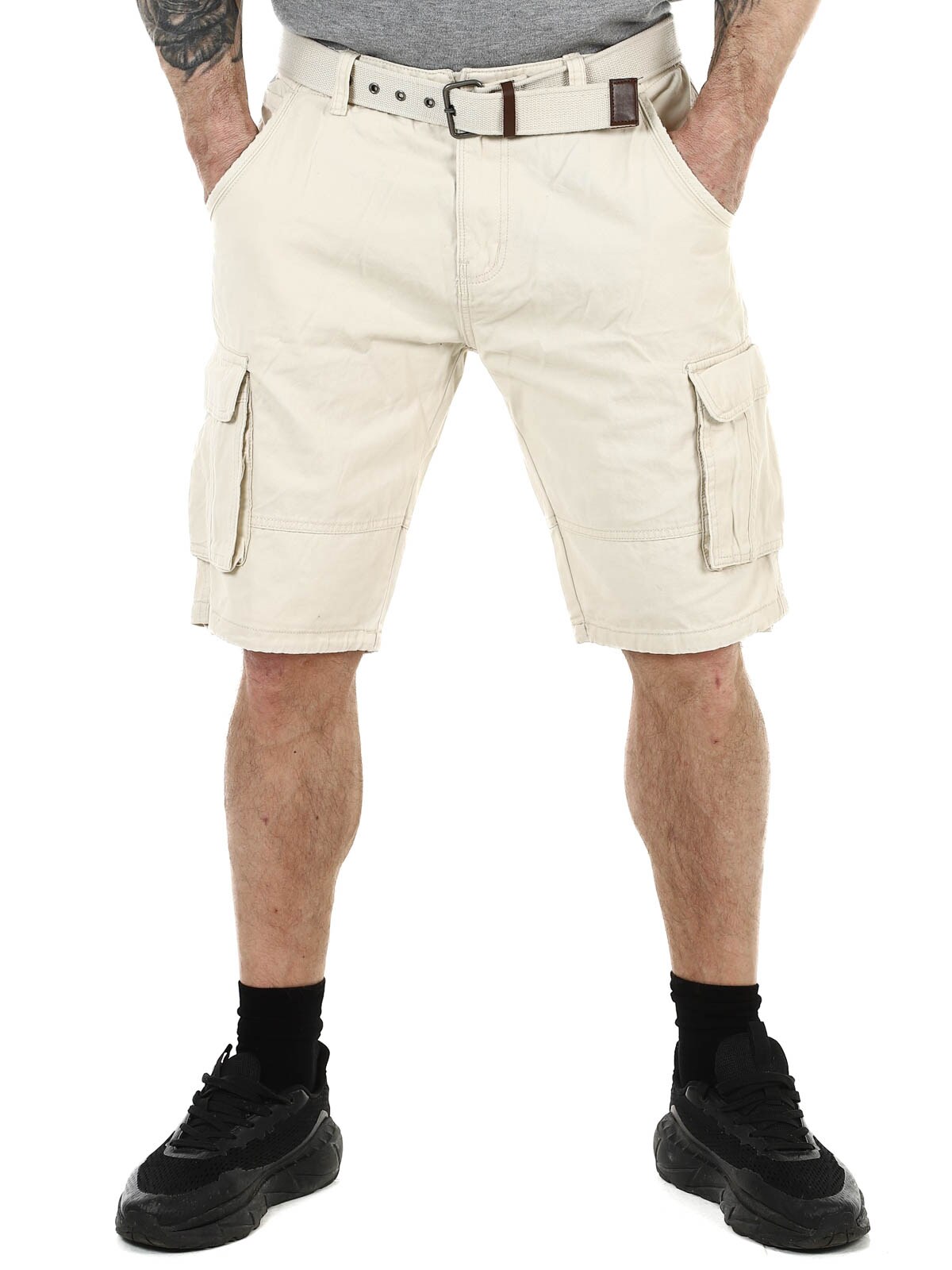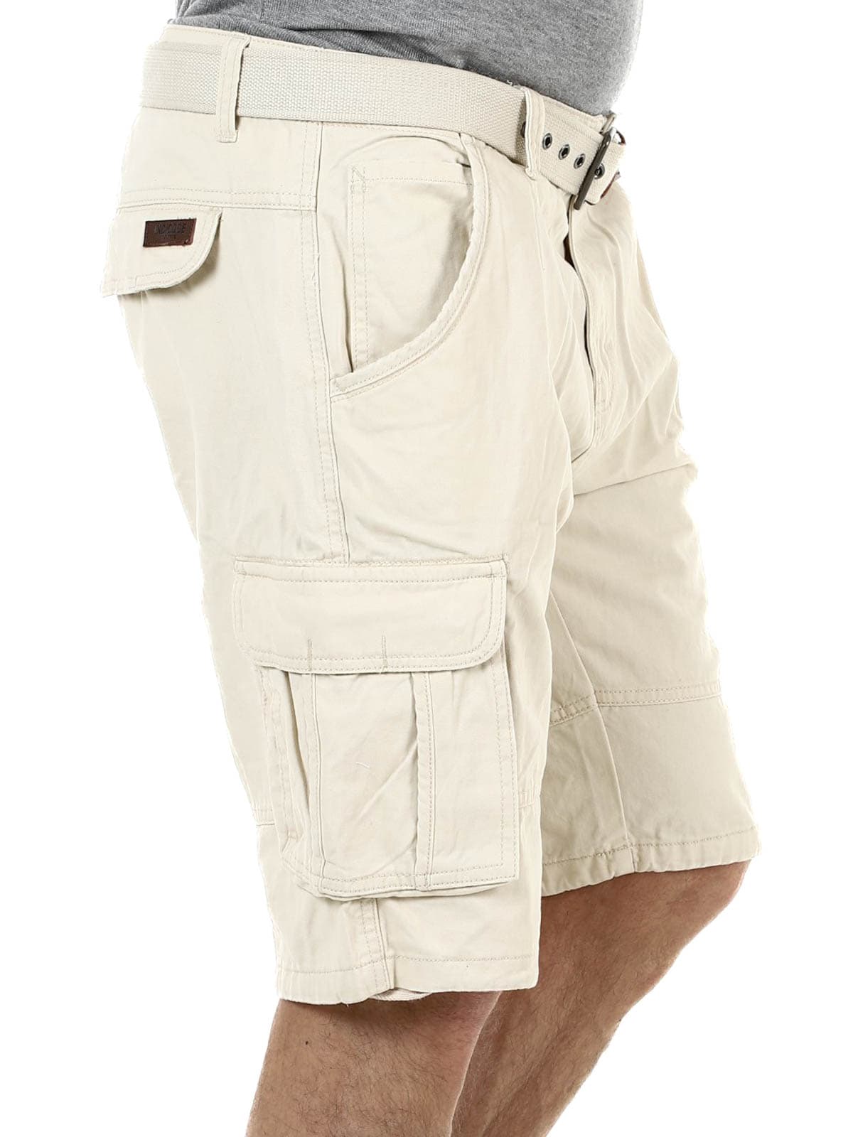 Snygga shorts i slitstark bomull. De har gott om fickor där flera är stängbara. Mellanlång modell med medföljande skärp.