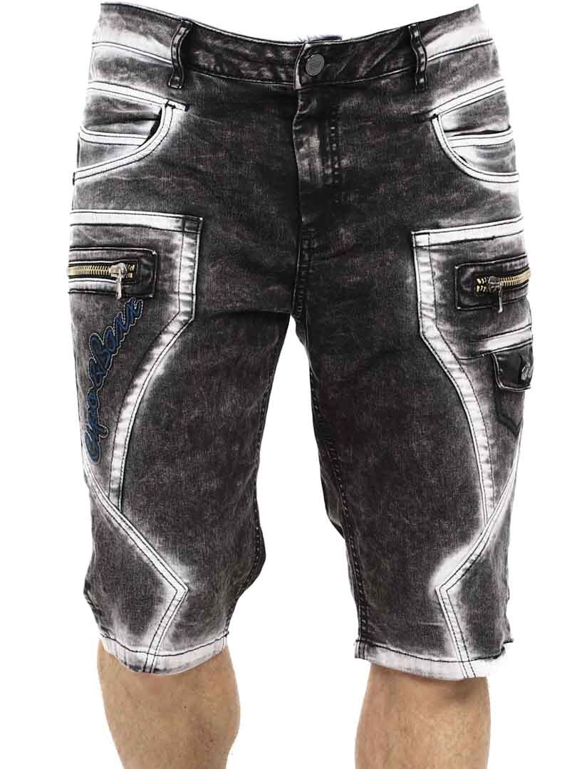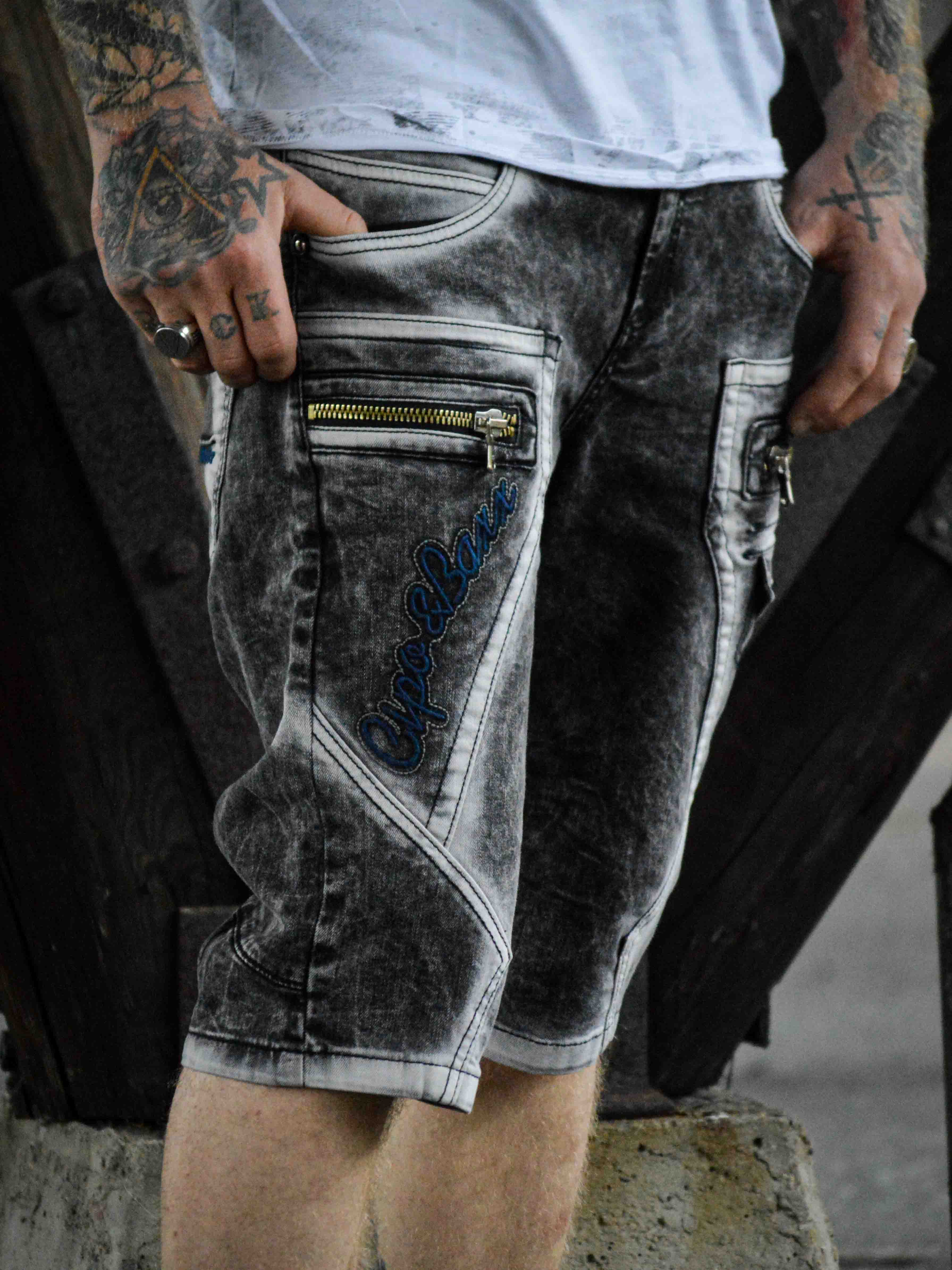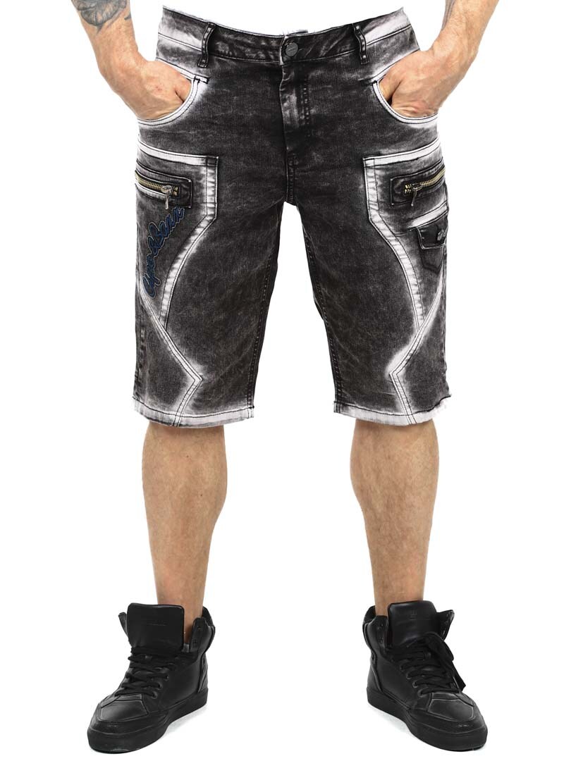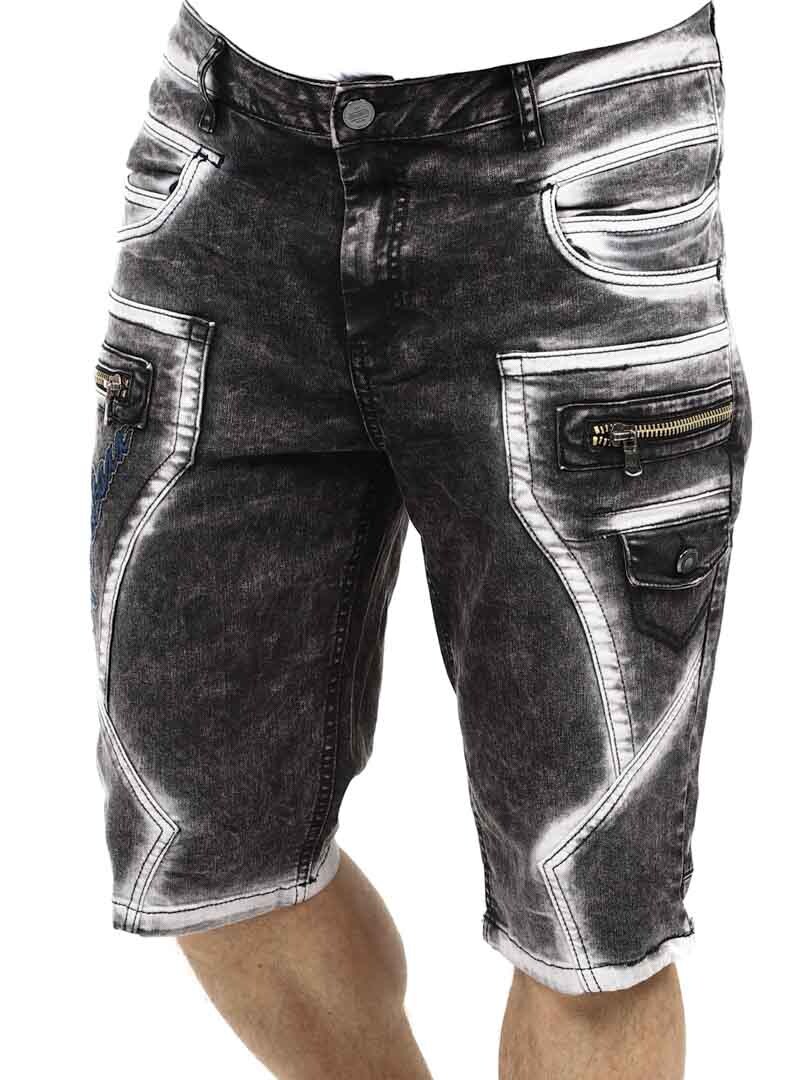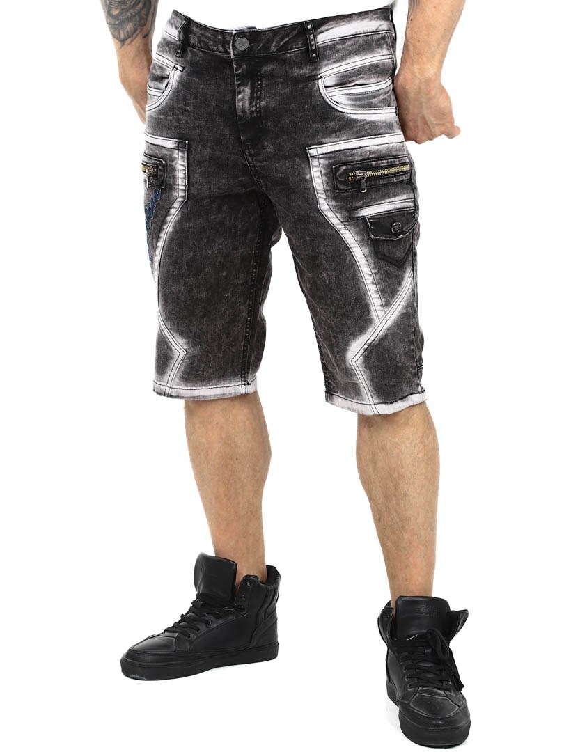 Ge din streetwear-stil en uppgradering med dessa unika shorts. Tillverkade i slitstark denim med en kraftigt tvättad finish som ger ett tufft utseende. De har flera funktionella fickor, broderad logotyp och grova sömmar för extra edge. Dragkedjorna framtill är endast för dekoration och inte funktionella.