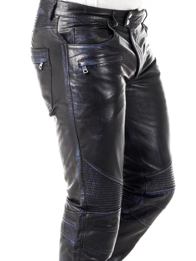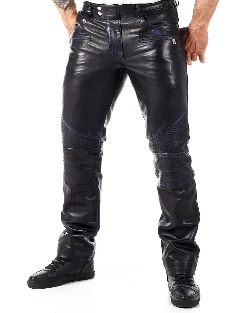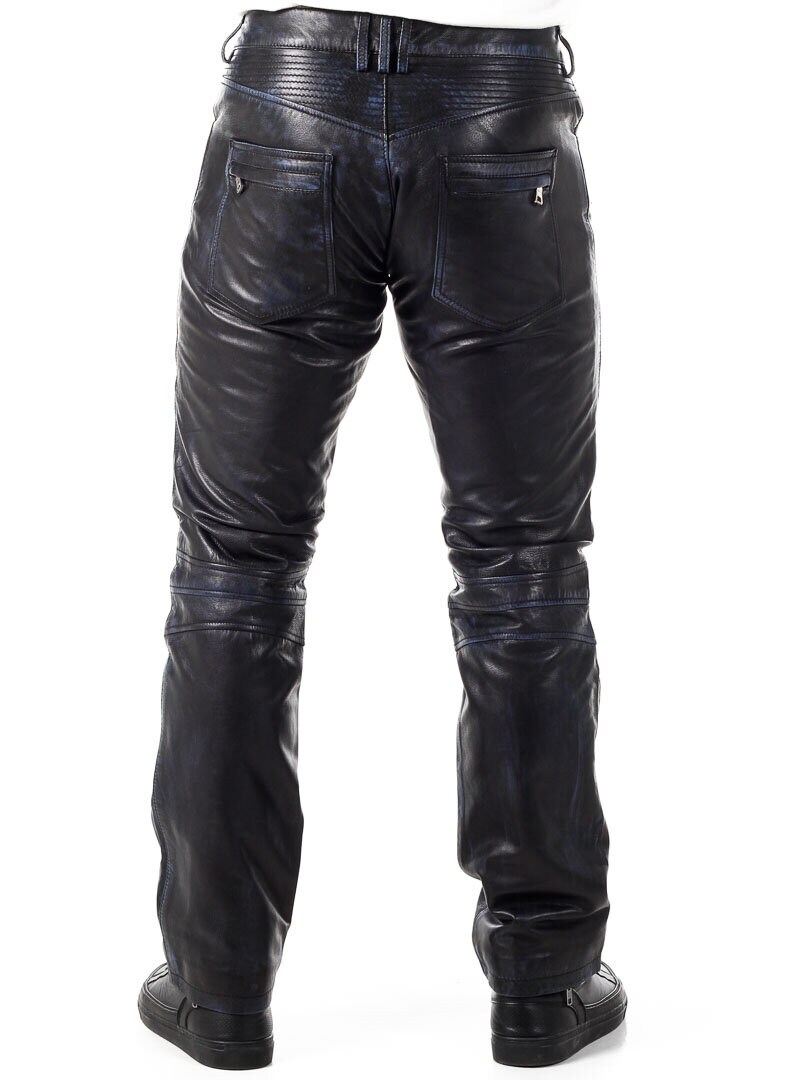 Svarta skinnbyxor med blåa inslag. De har flera fickor, både öppna och stängbara. Biker-inspirerad design med klassisk passform. Tillverkade i mjukt läder och finns endast hos Rockdenim!