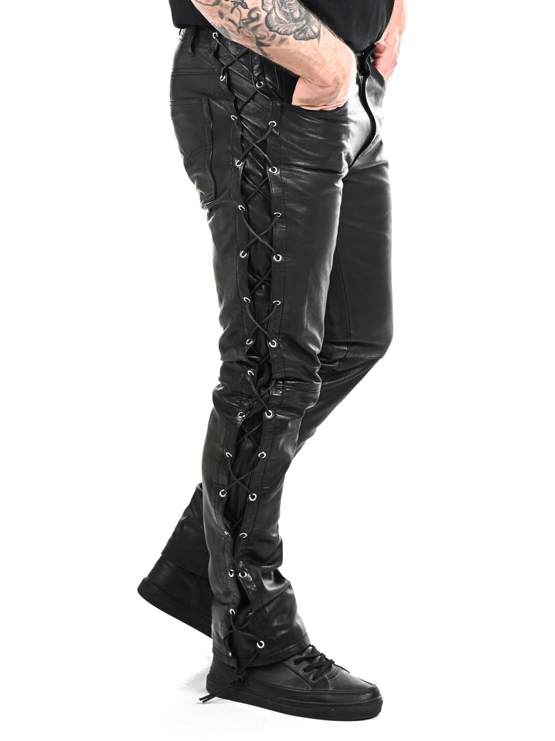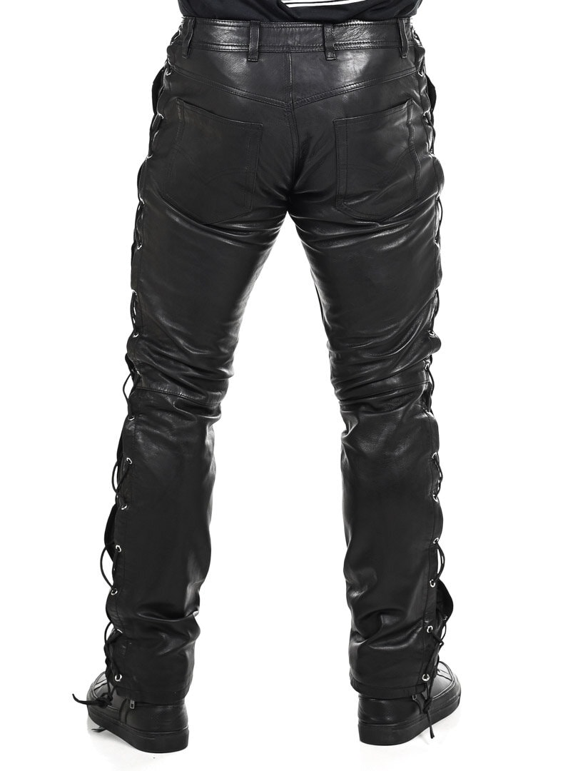 Byxor i äkta läder med tunt foder och snörning på sidorna som reglerar vidden. De har tre fickor fram, två fickor bak och hällor i midjan. Stängs med blixtlås och metallknapp.
