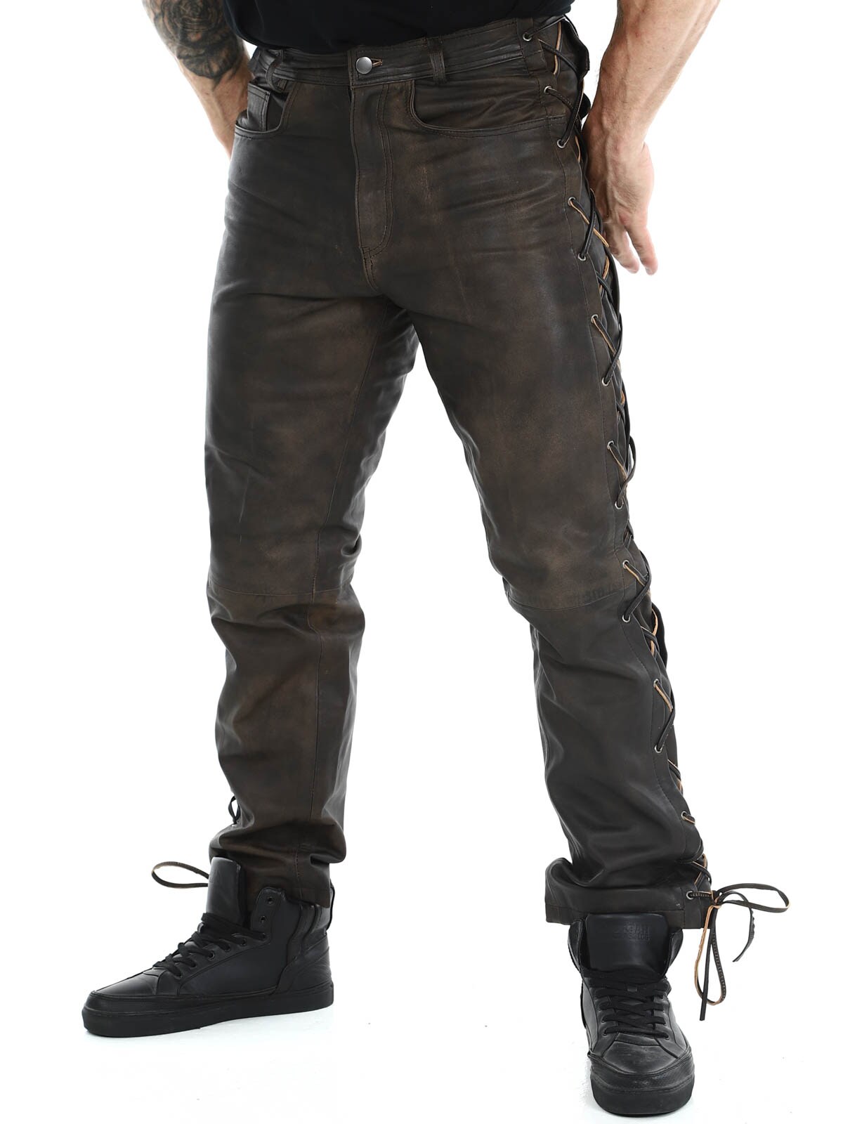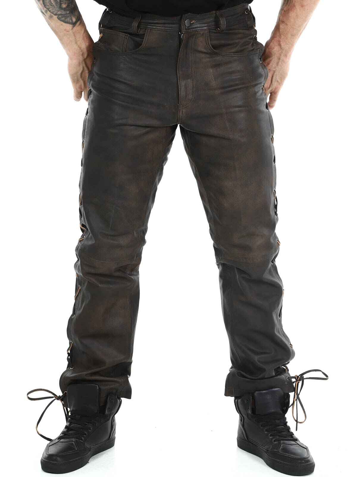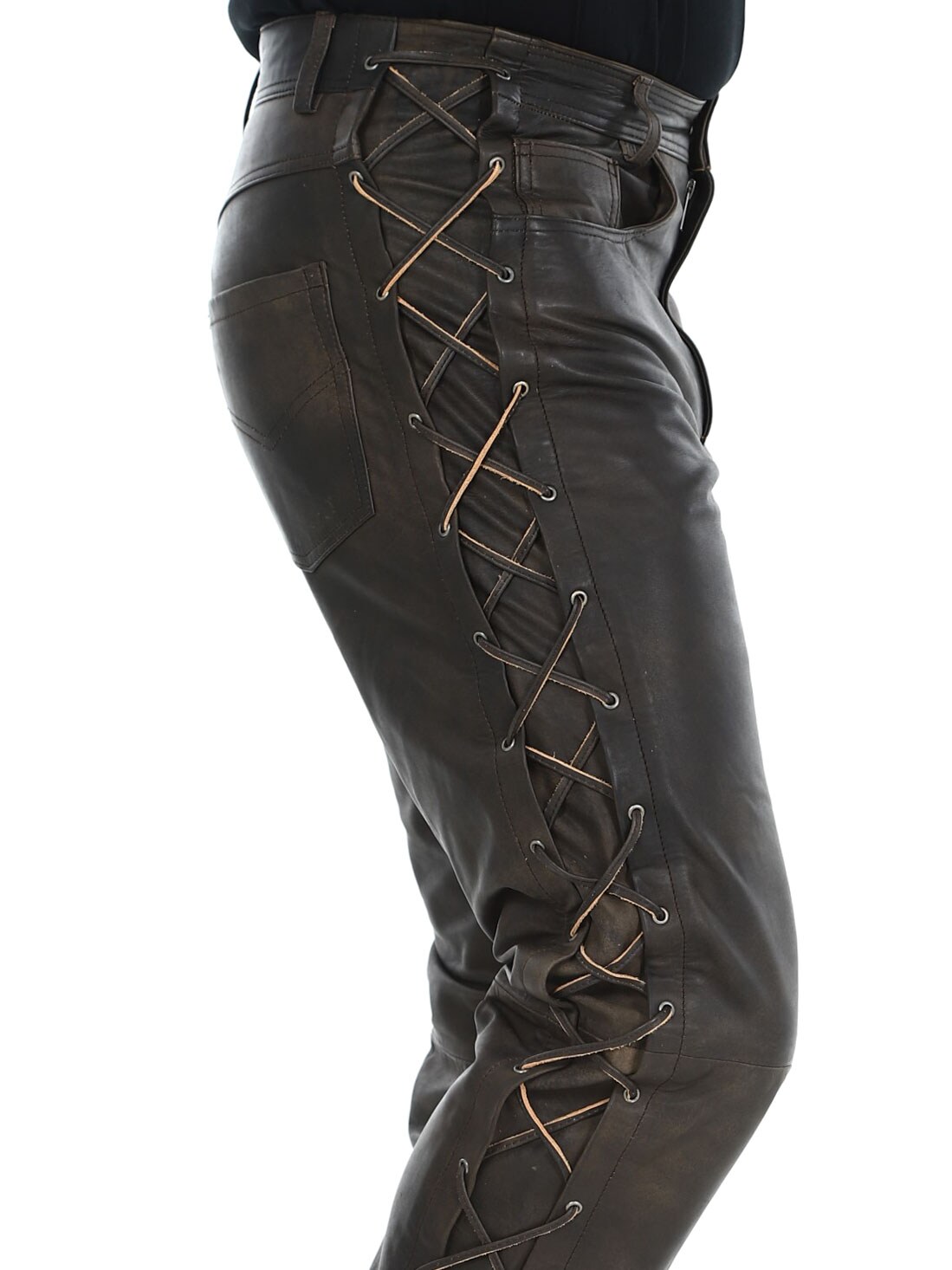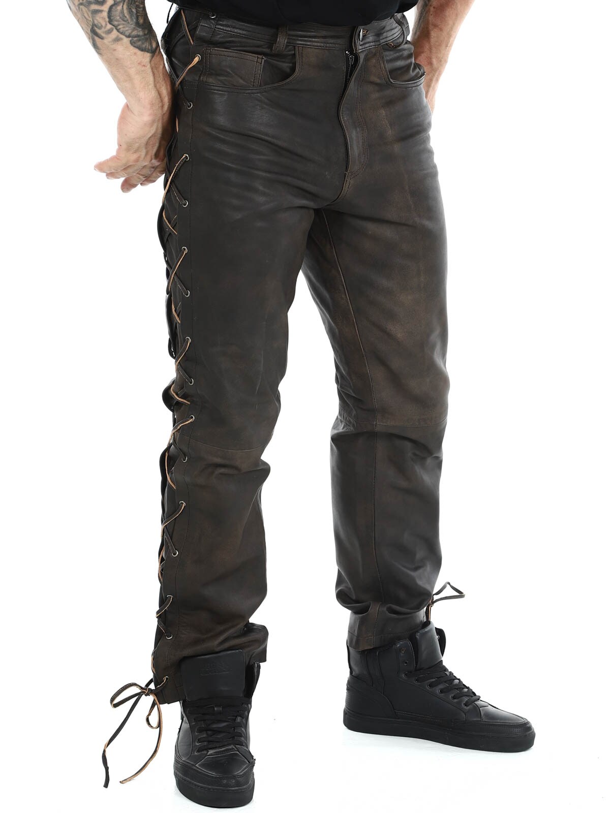 Byxor i äkta läder med tunt foder och snörning på sidorna som reglerar vidden. De har tre fickor fram, två fickor bak och hällor i midjan. Stängs med blixtlås och metallknapp.