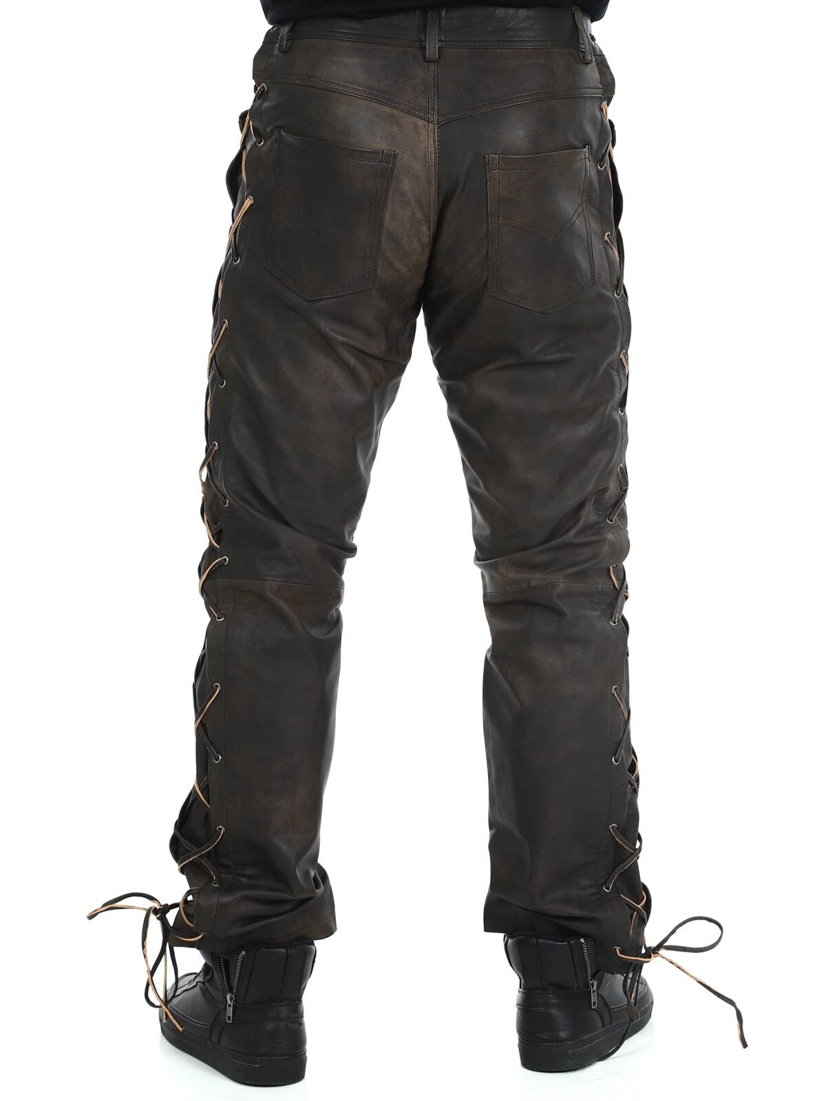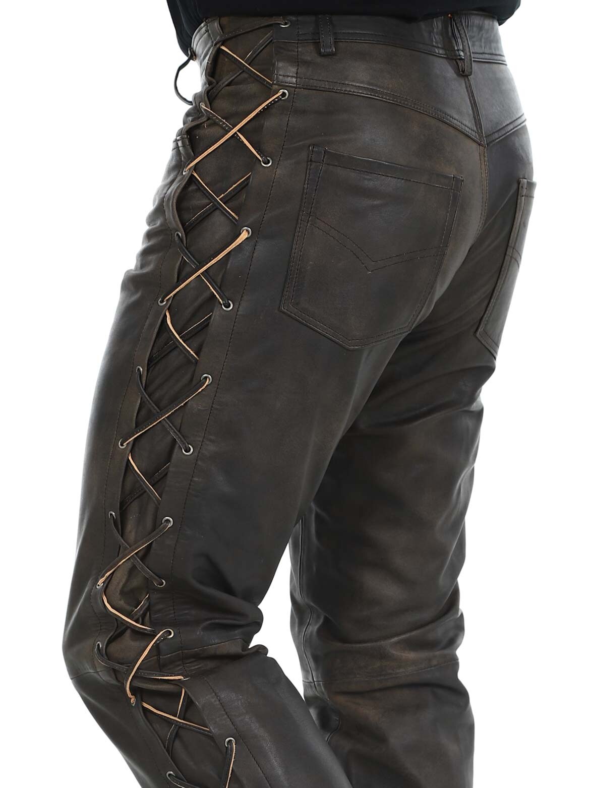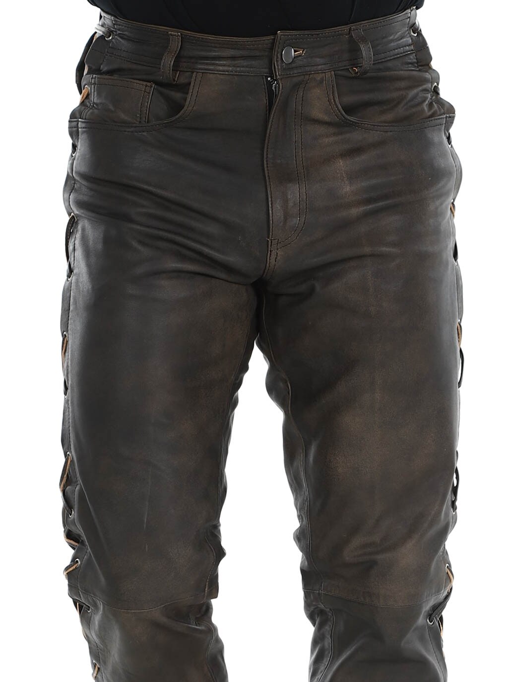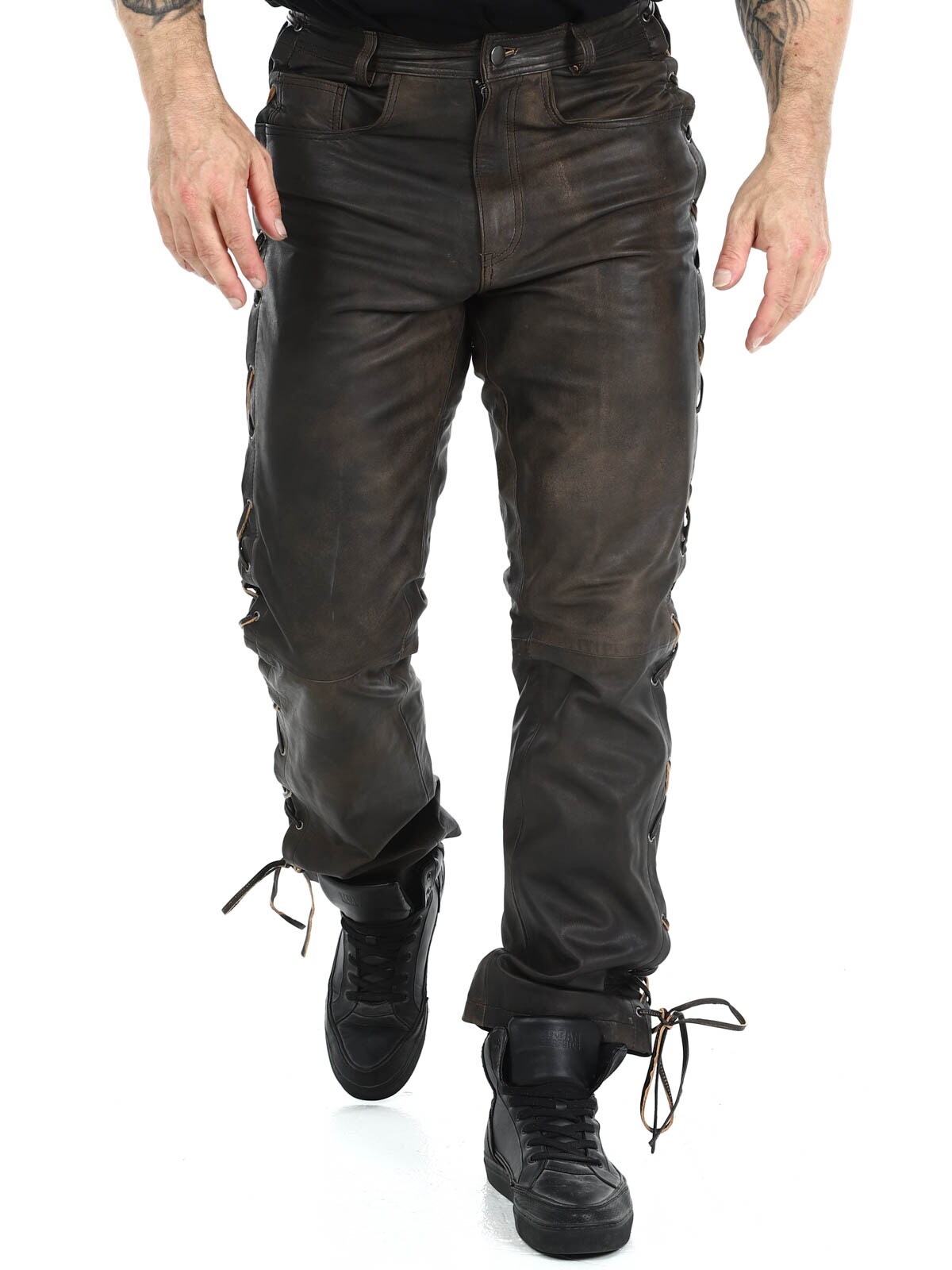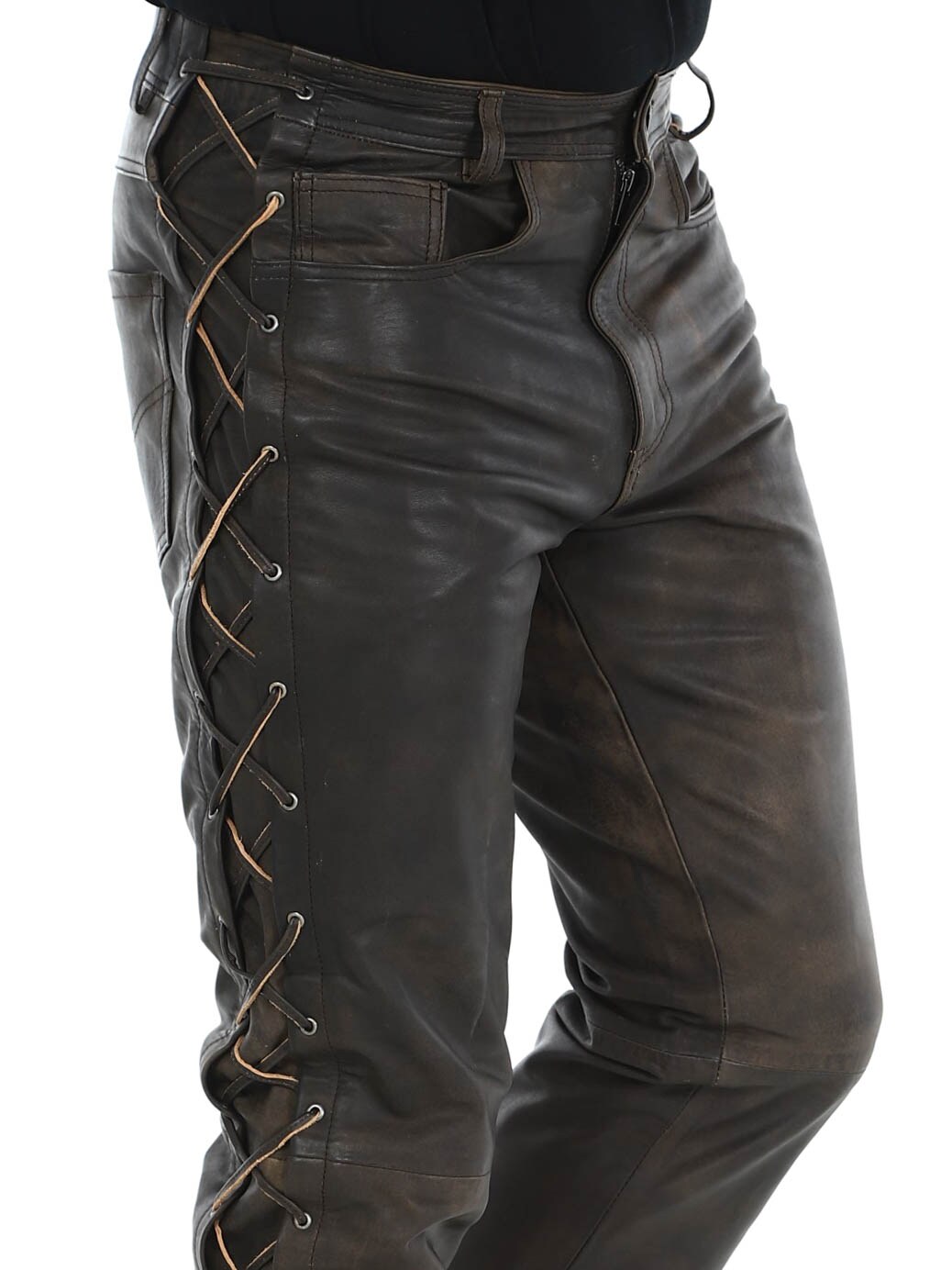 Byxor i äkta läder med tunt foder och snörning på sidorna som reglerar vidden. De har tre fickor fram, två fickor bak och hällor i midjan. Stängs med blixtlås och metallknapp.