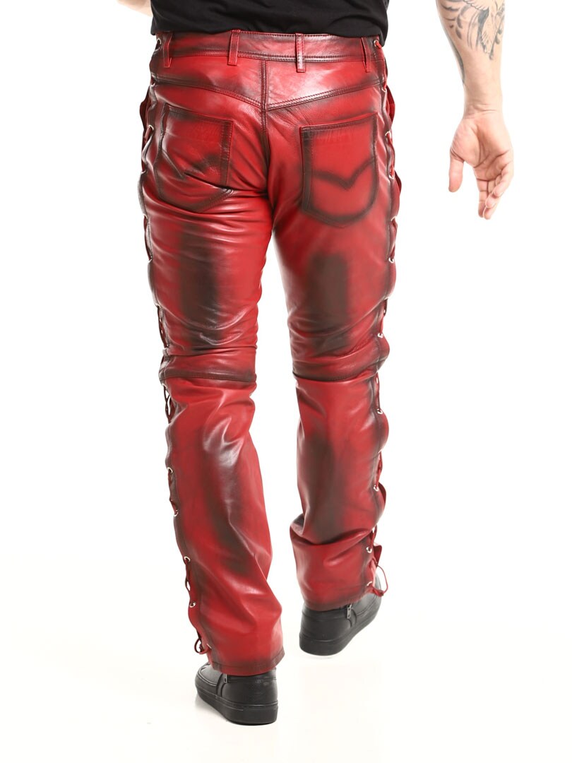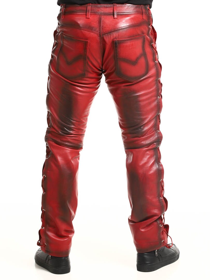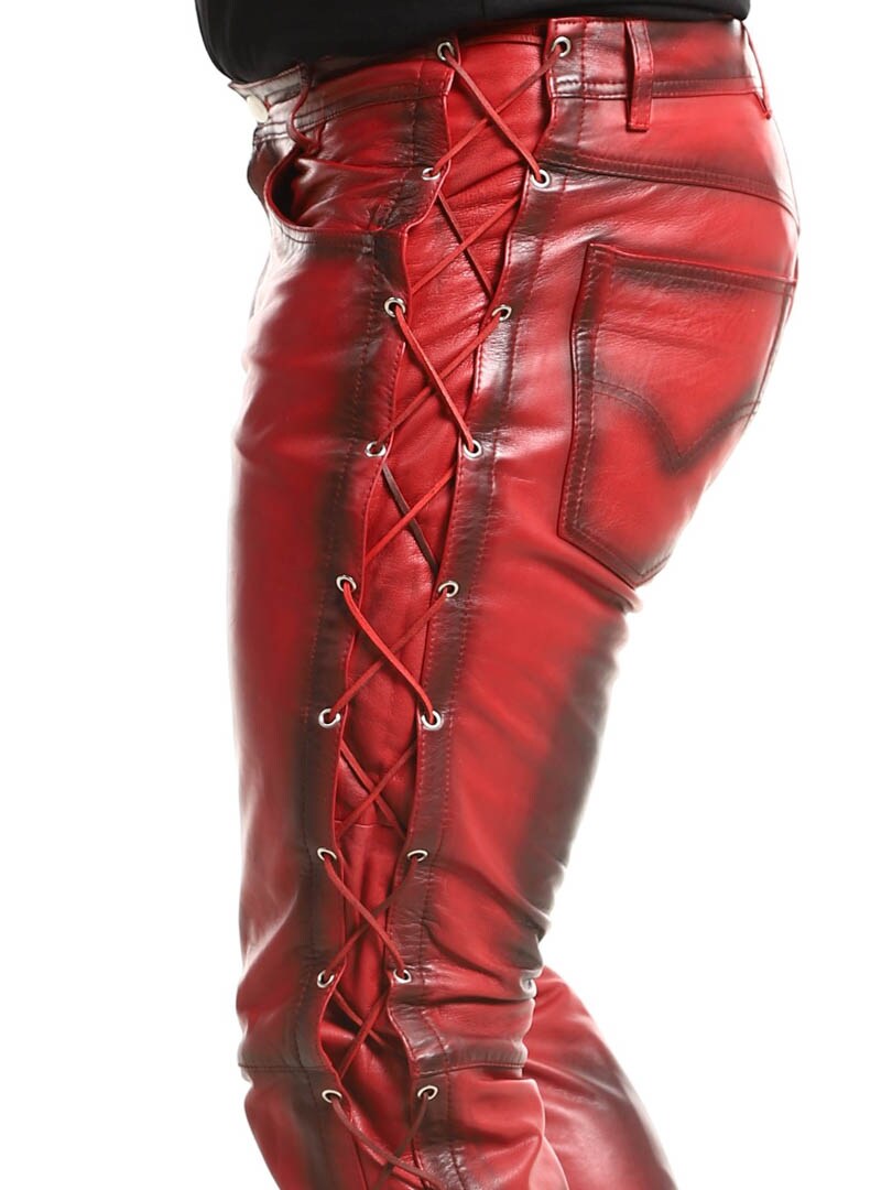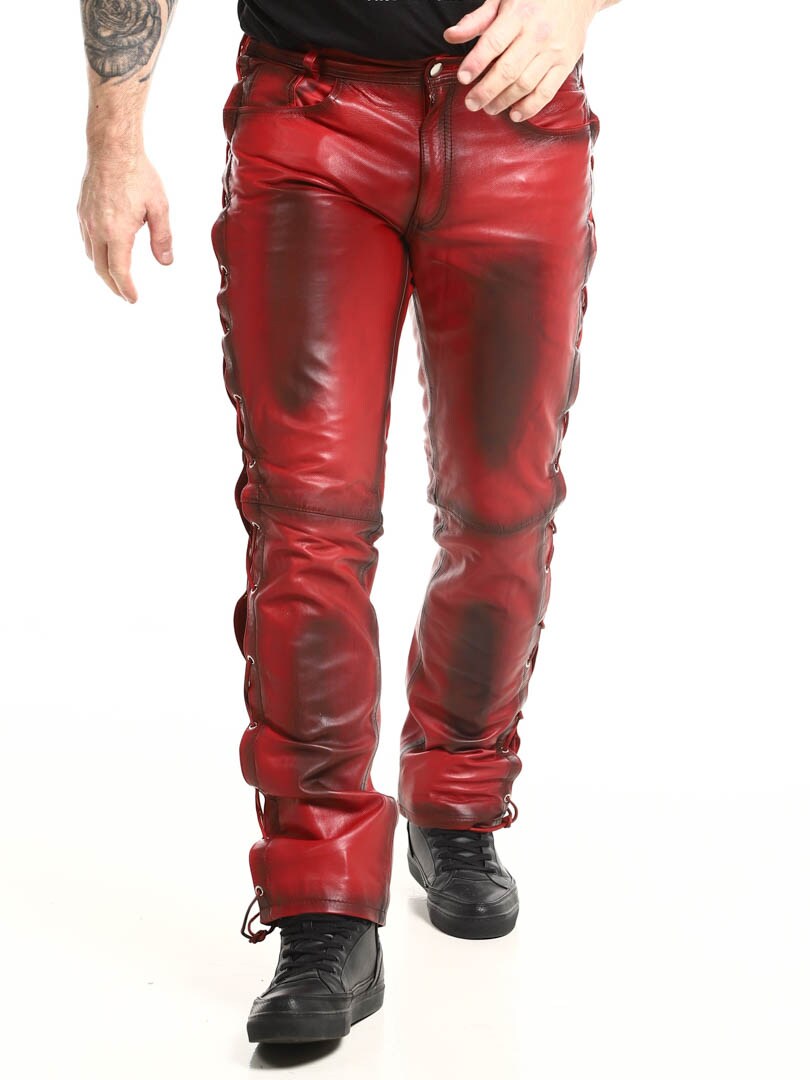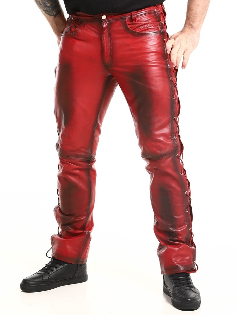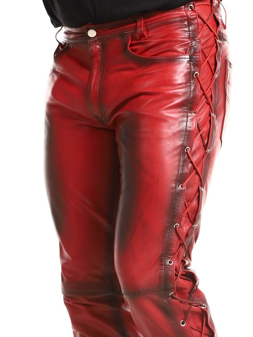 Byxor i äkta läder med tunt foder och snörning på sidorna som reglerar vidden. De har tre fickor fram, två fickor bak och hällor i midjan. Stängs med blixtlås och metallknapp.