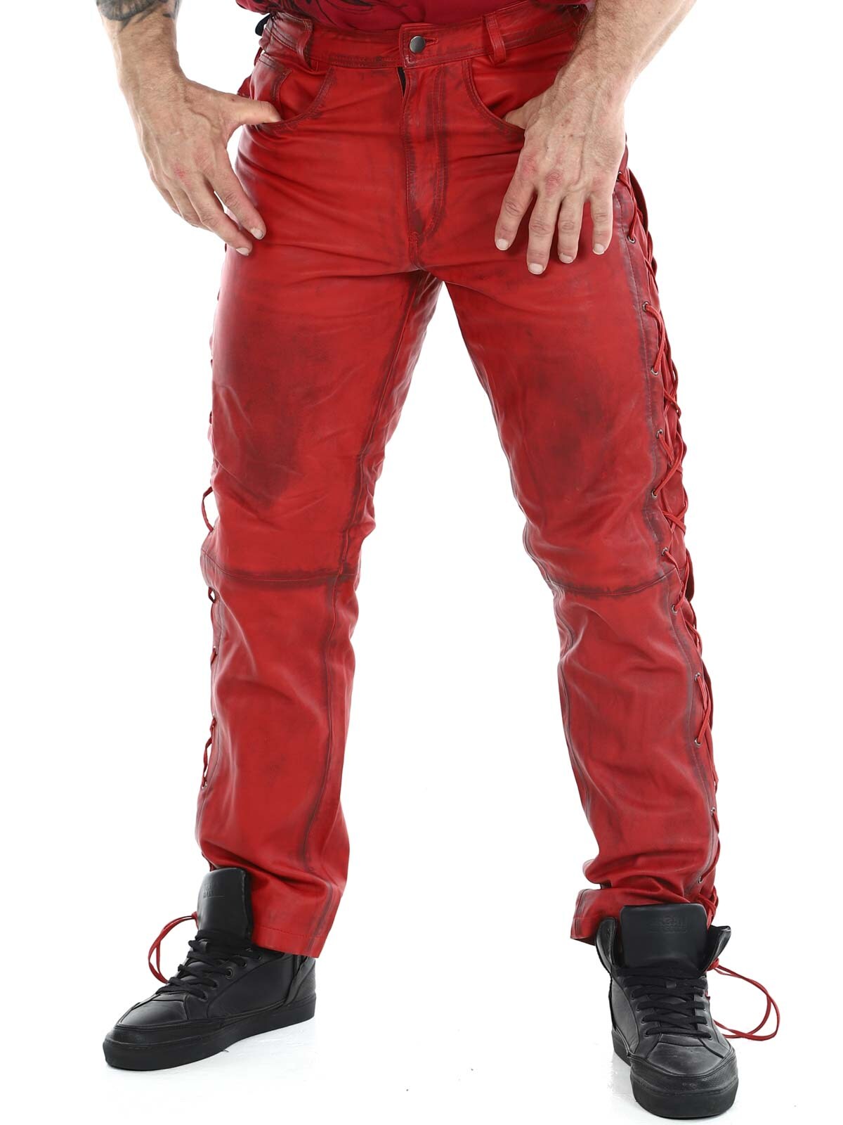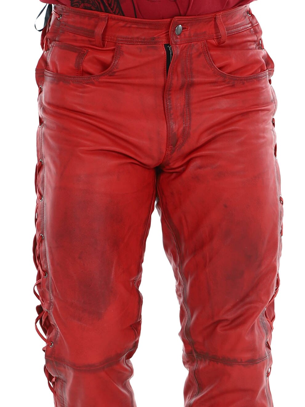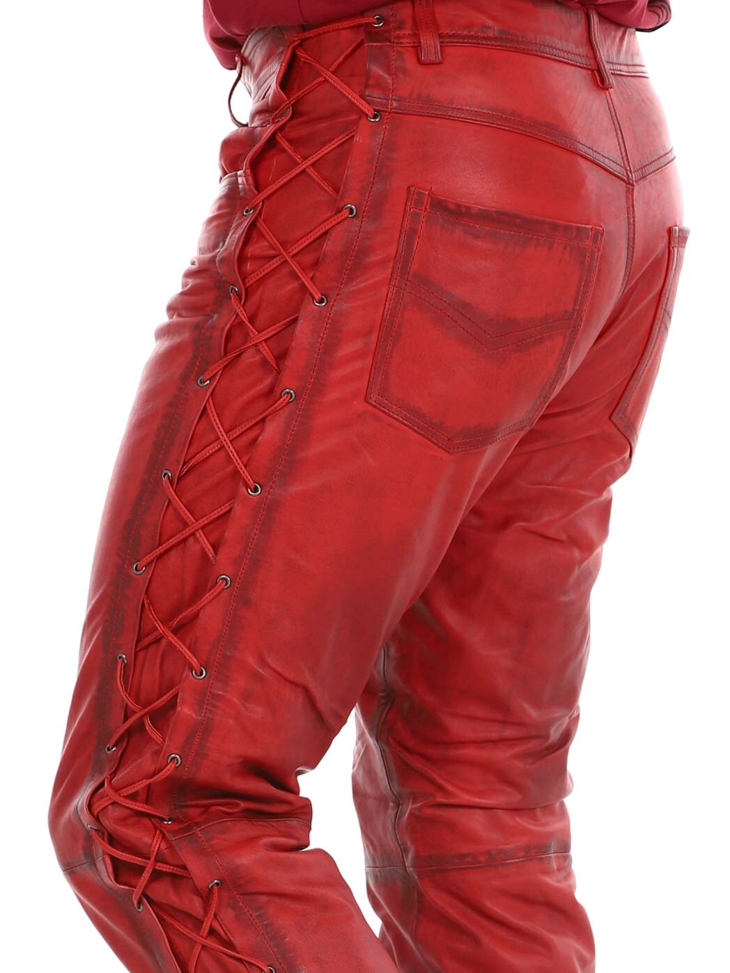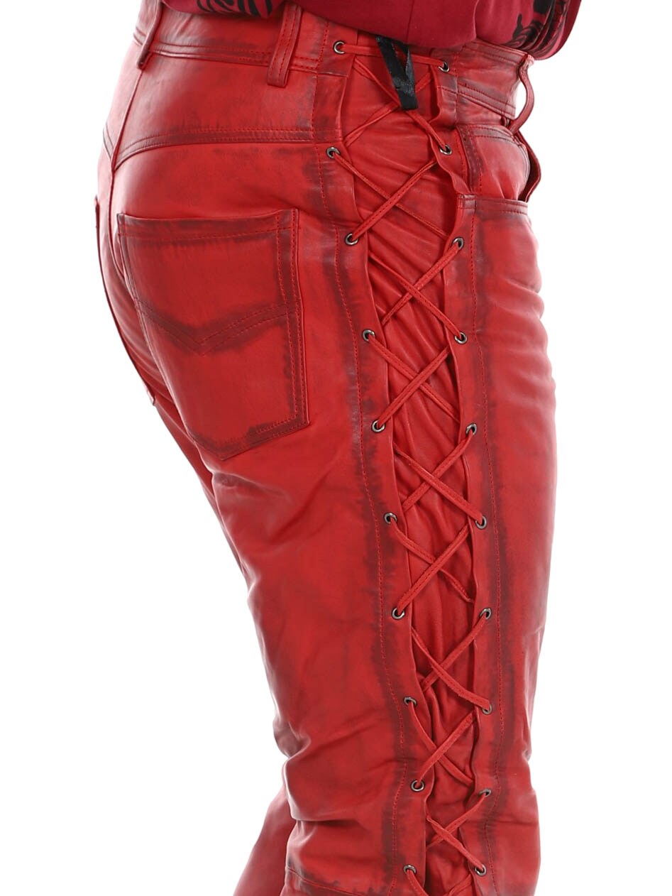Byxor i äkta läder med tunt foder och snörning på sidorna som reglerar vidden. De har tre fickor fram, två fickor bak och hällor i midjan. Stängs med blixtlås och metallknapp.