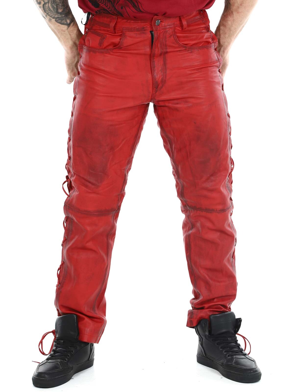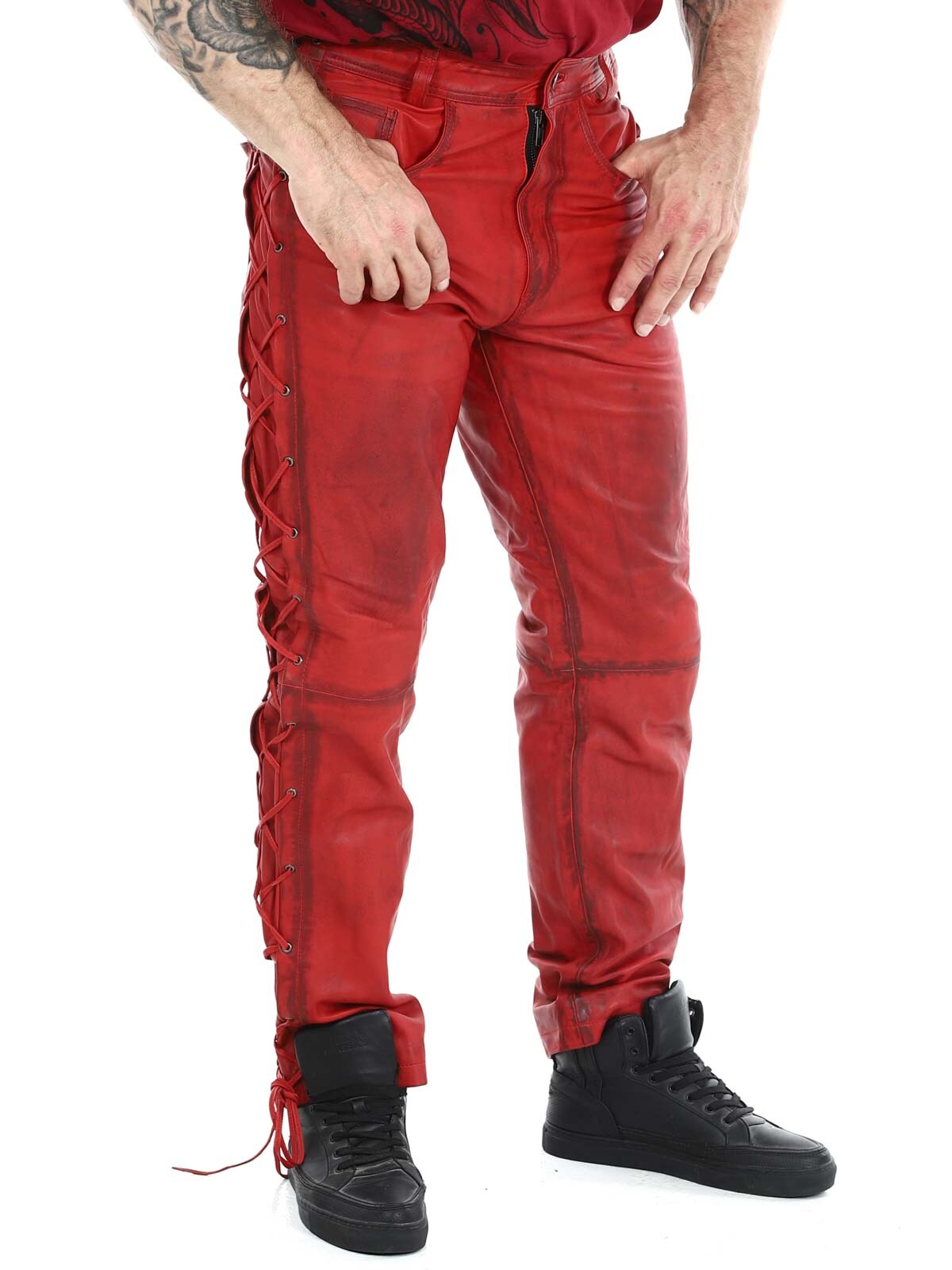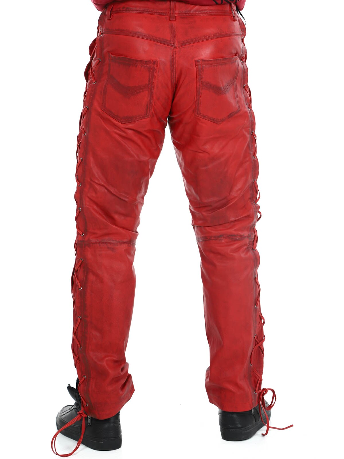 Byxor i äkta läder med tunt foder och snörning på sidorna som reglerar vidden. De har tre fickor fram, två fickor bak och hällor i midjan. Stängs med blixtlås och metallknapp.