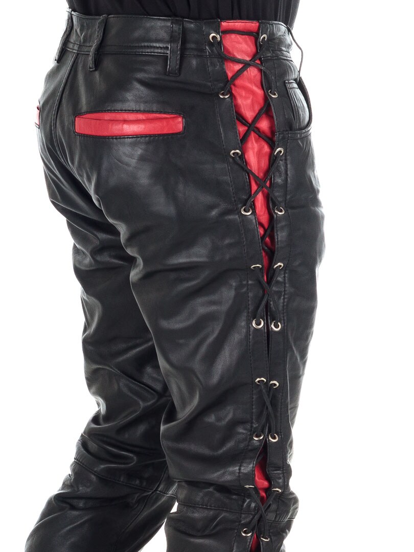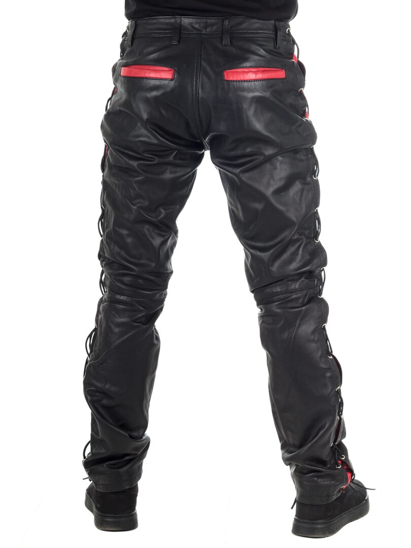 Byxor i äkta läder med tunt foder och snörning på sidorna som reglerar vidden. De har tre fickor fram, två fickor bak och hällor i midjan. Stängs med blixtlås och metallknapp.