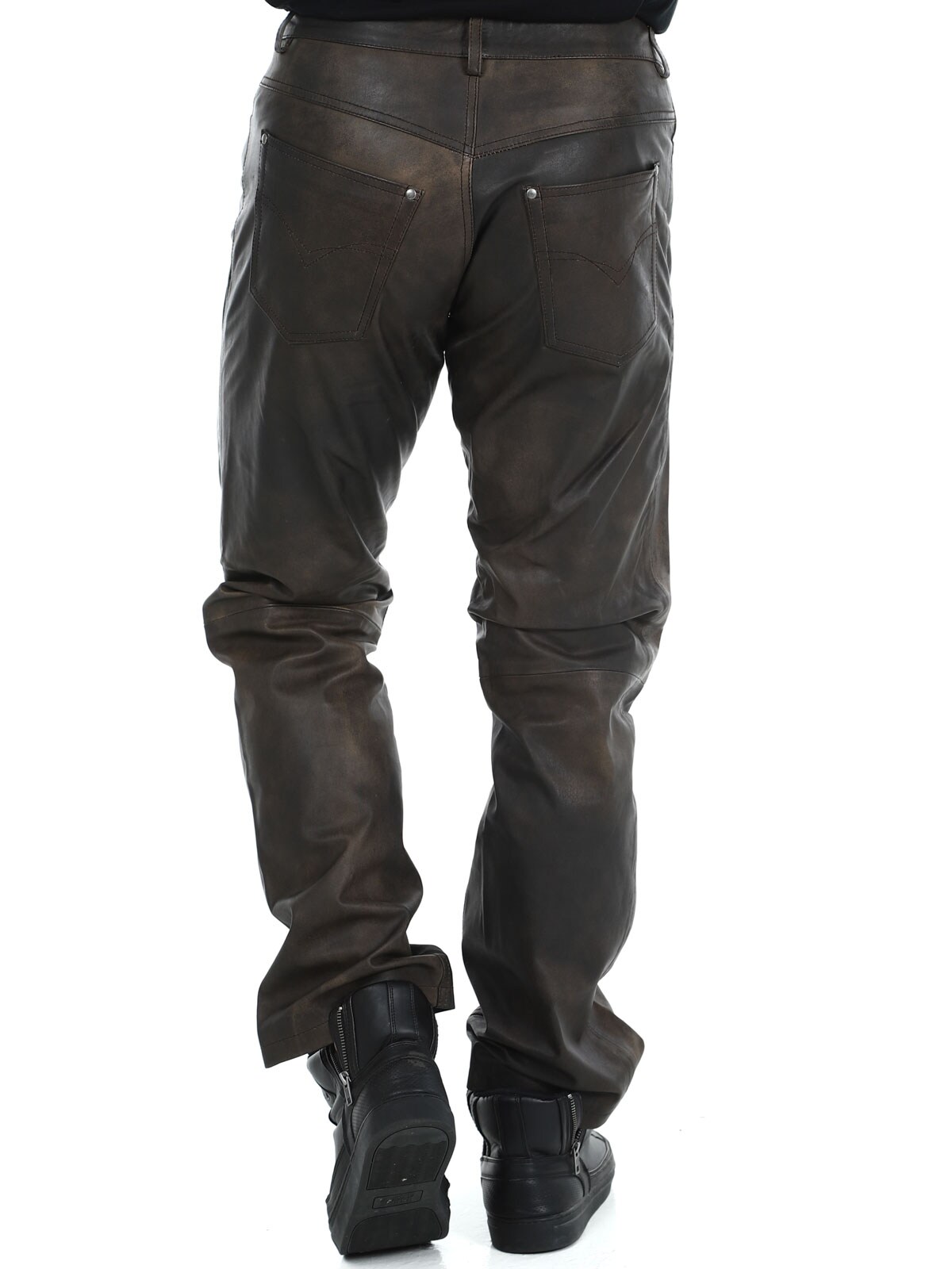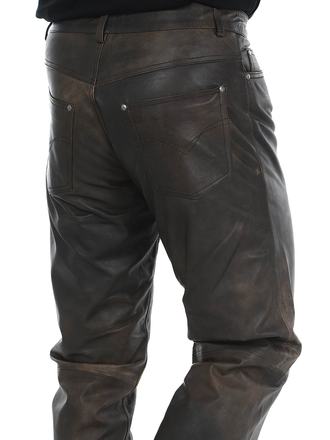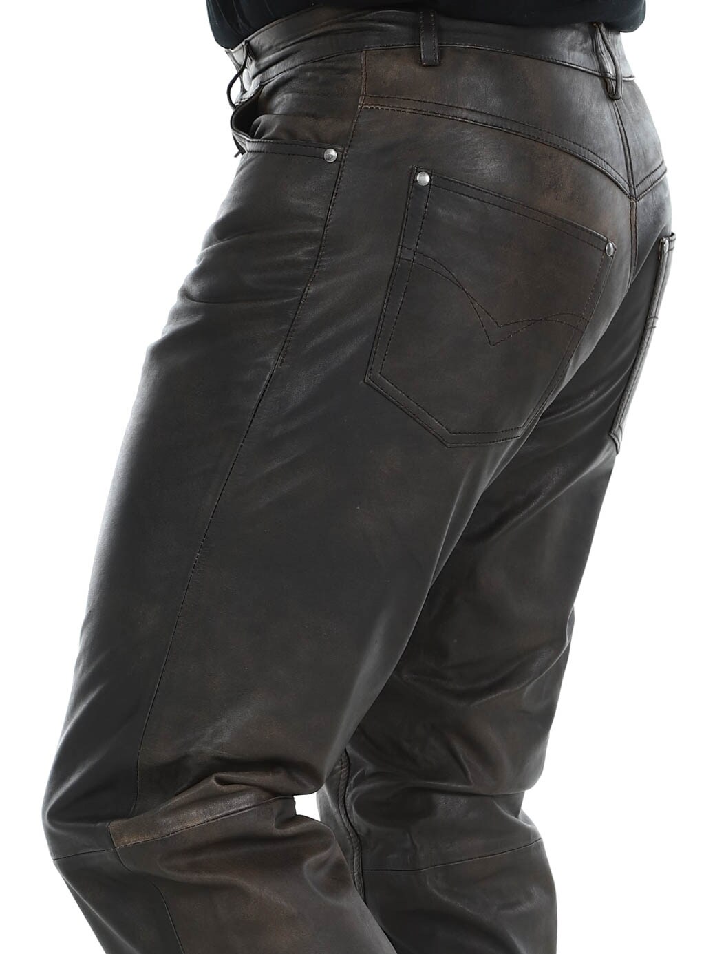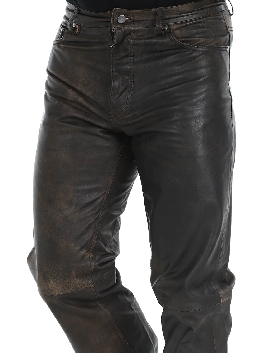 Bruna byxor i äkta läder med klassisk 5-ficks design. Tillverkad i mjukt läder med insida i polyester som gör att dem sitter bekvämt på kroppen. Vill du ha en skön byxa med attityd så har du hittat rätt!