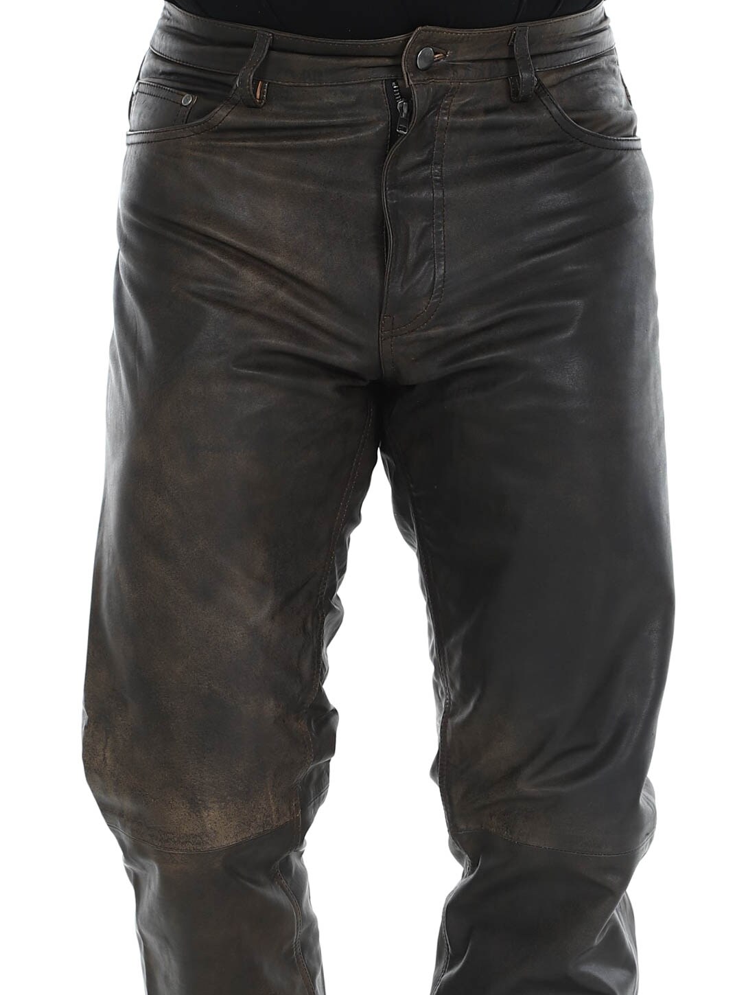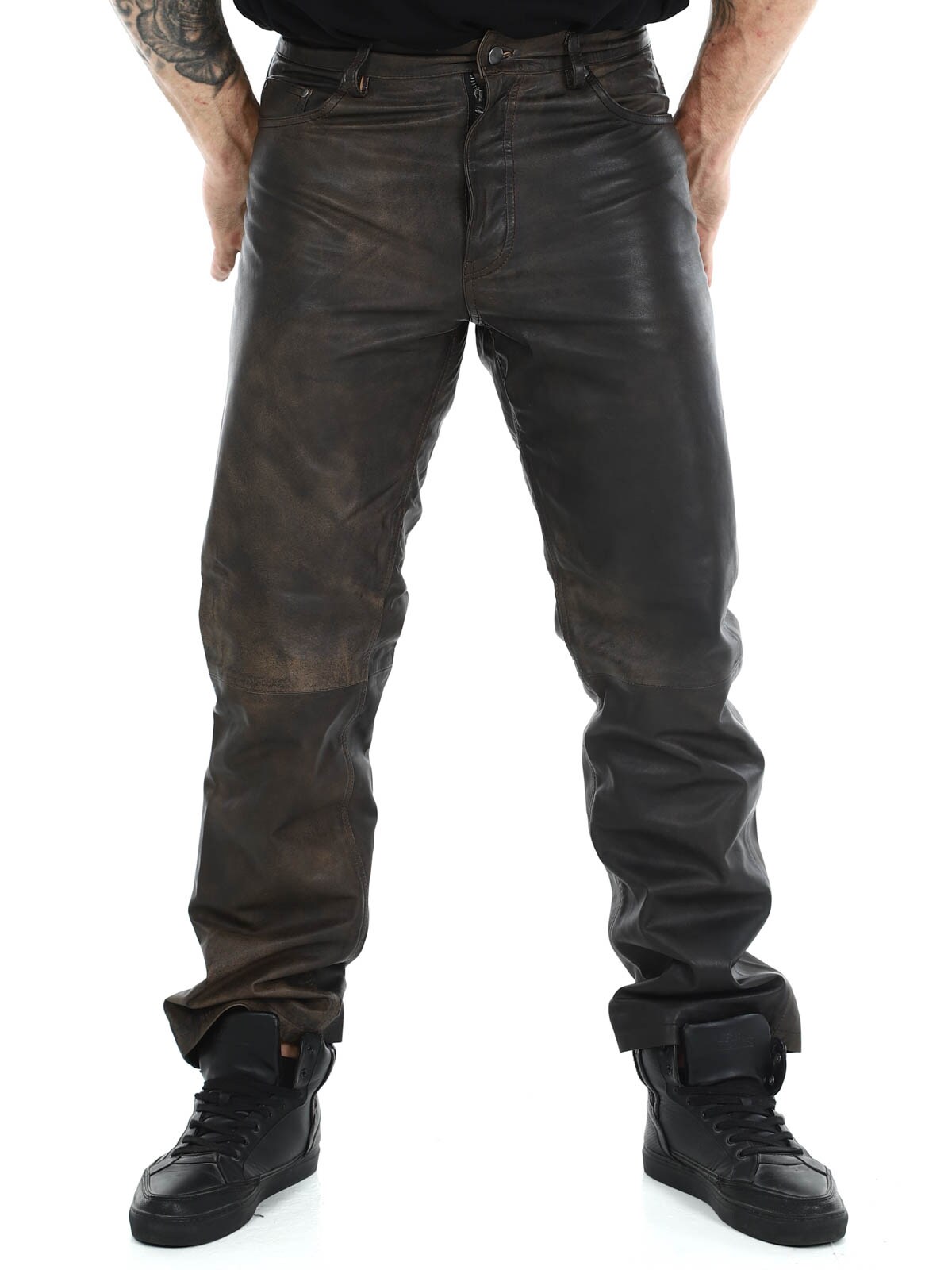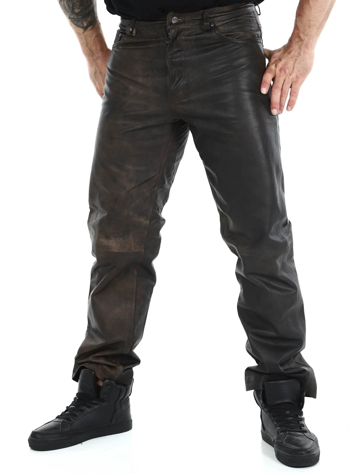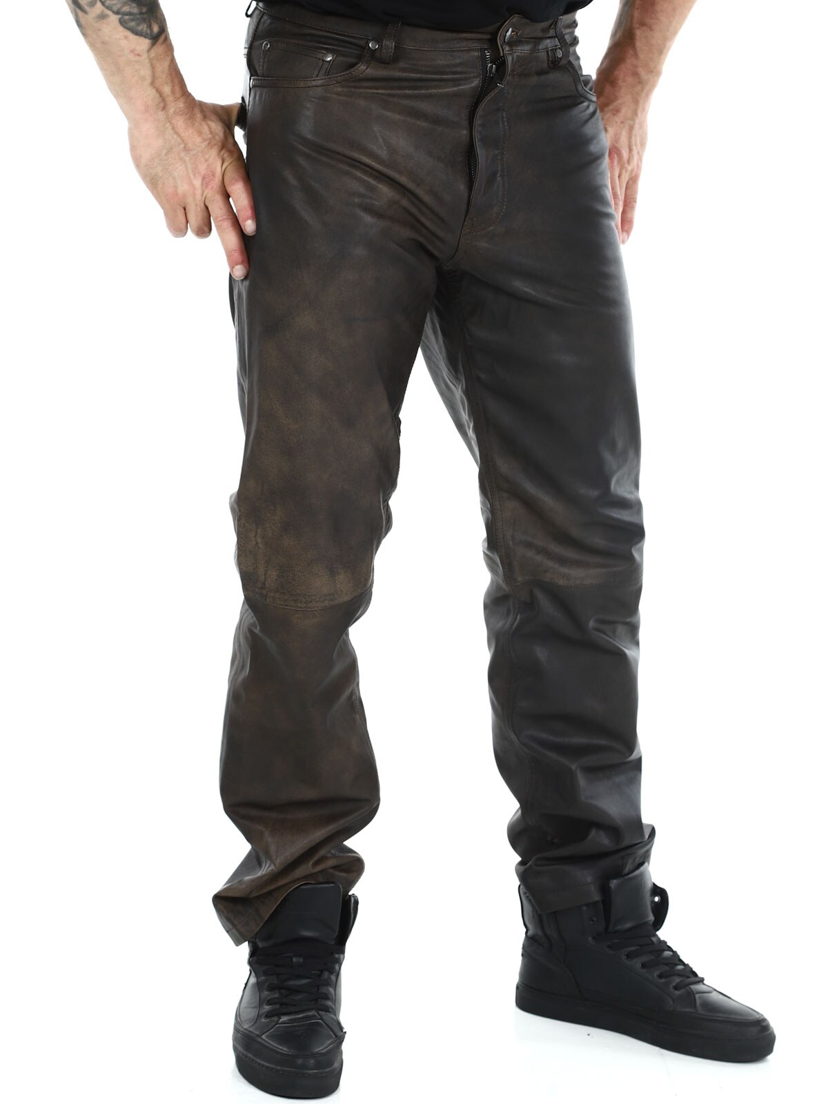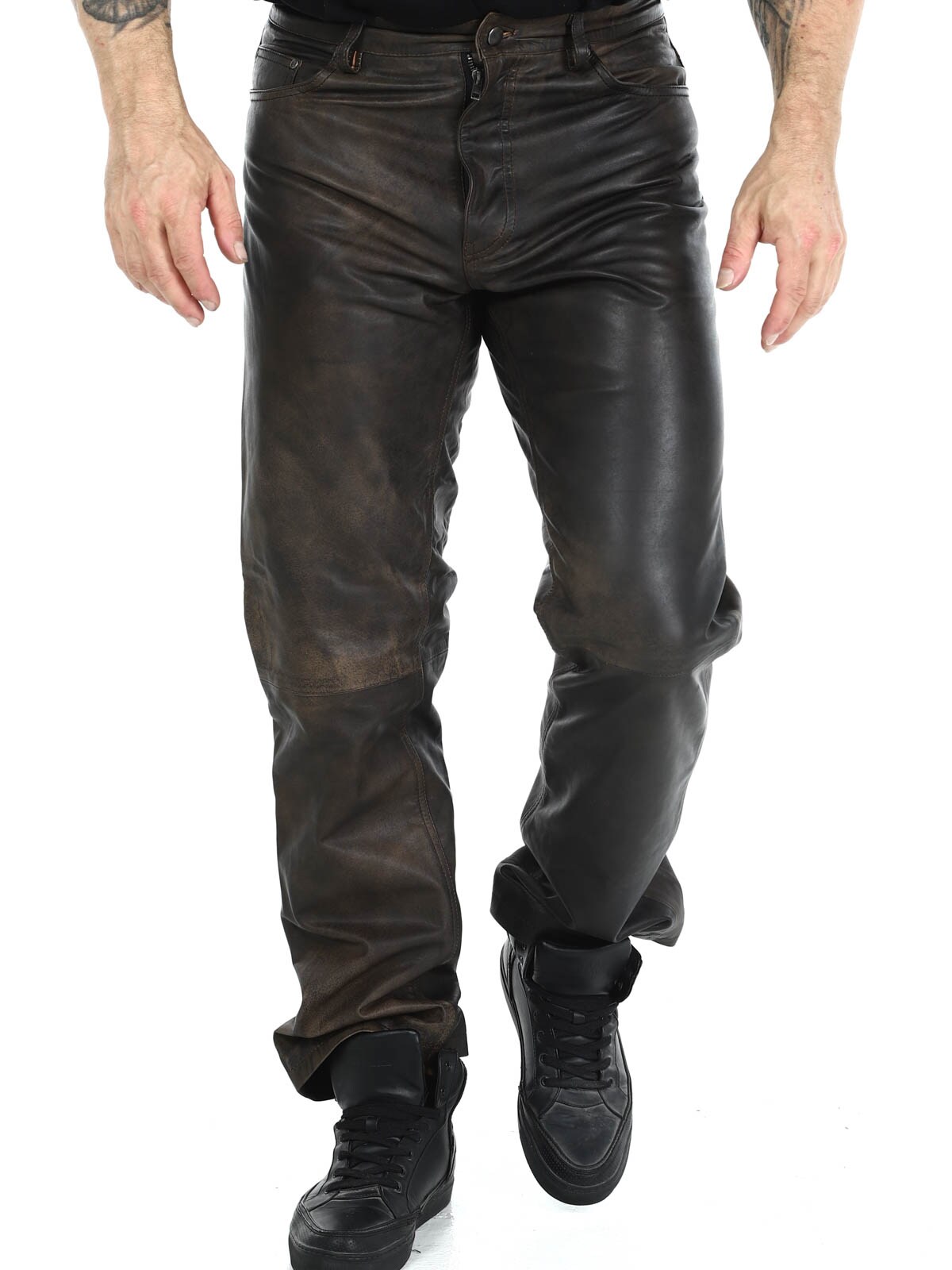 Bruna byxor i äkta läder med klassisk 5-ficks design. Tillverkad i mjukt läder med insida i polyester som gör att dem sitter bekvämt på kroppen. Vill du ha en skön byxa med attityd så har du hittat rätt!