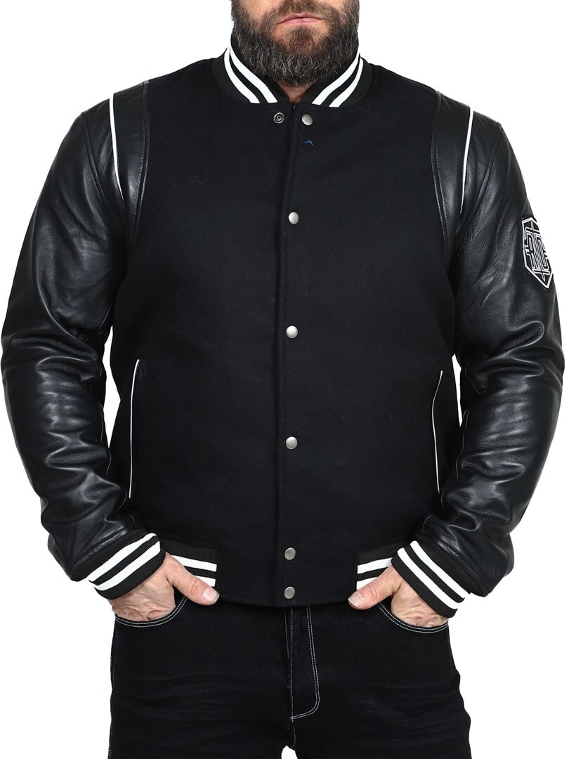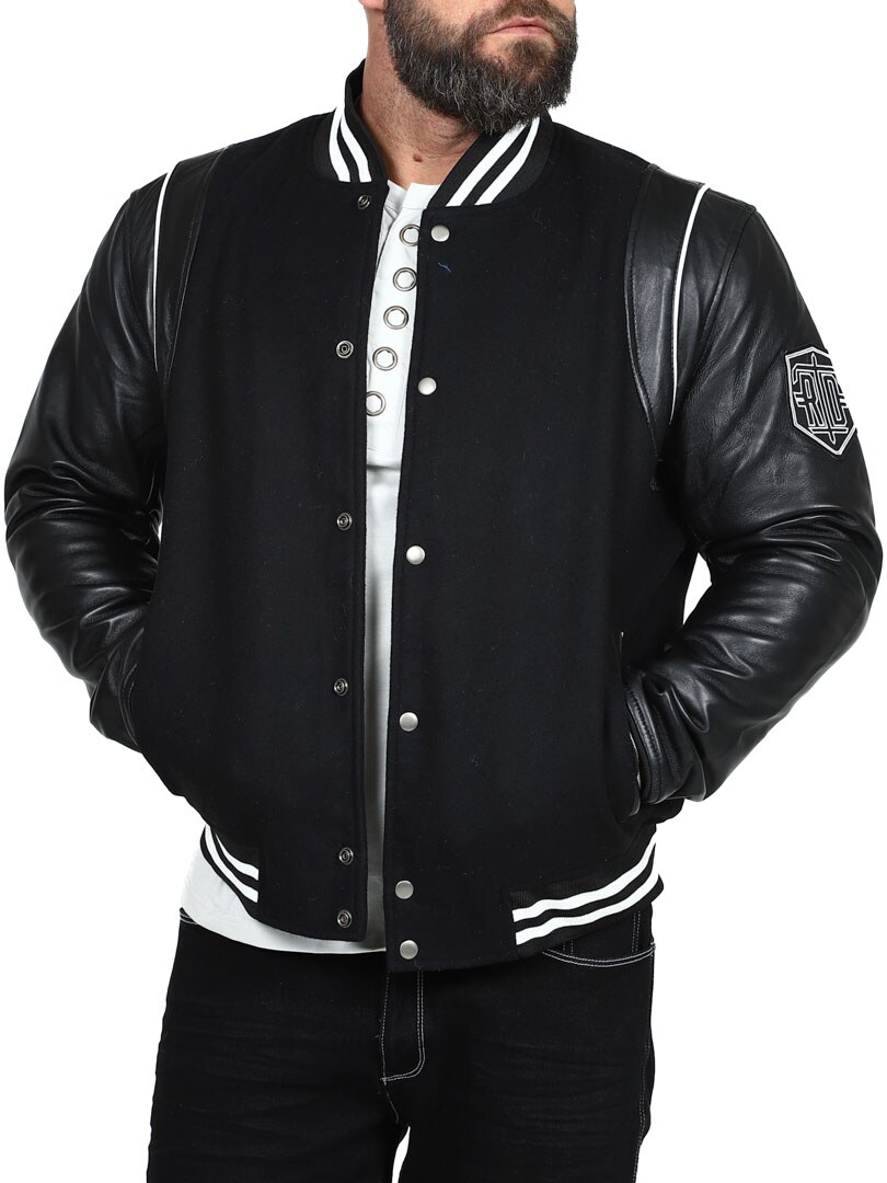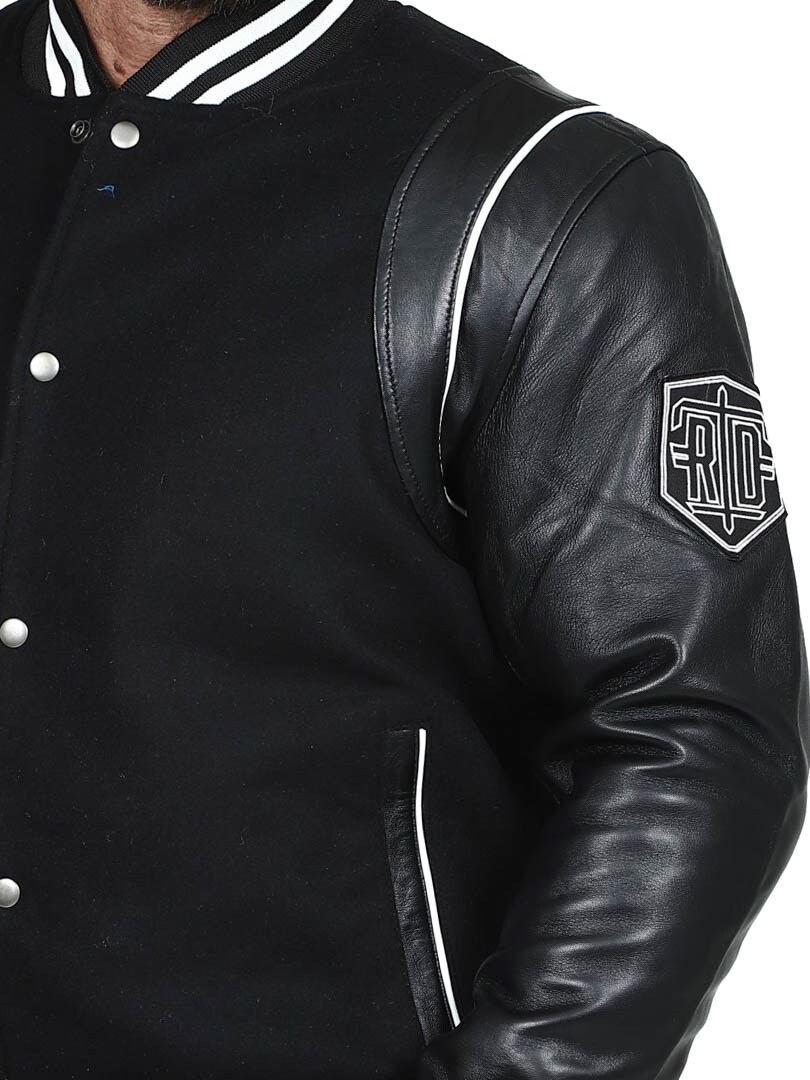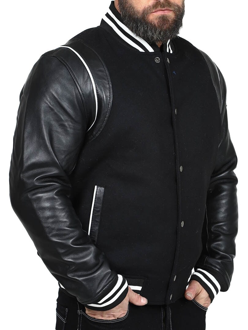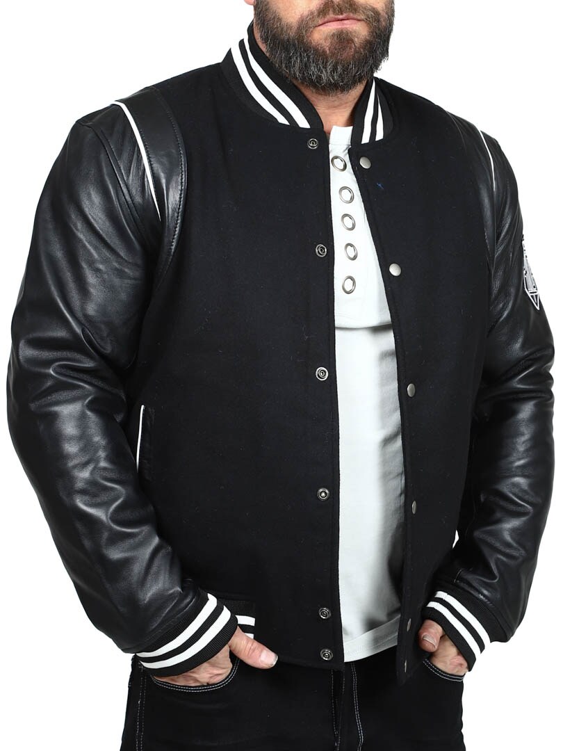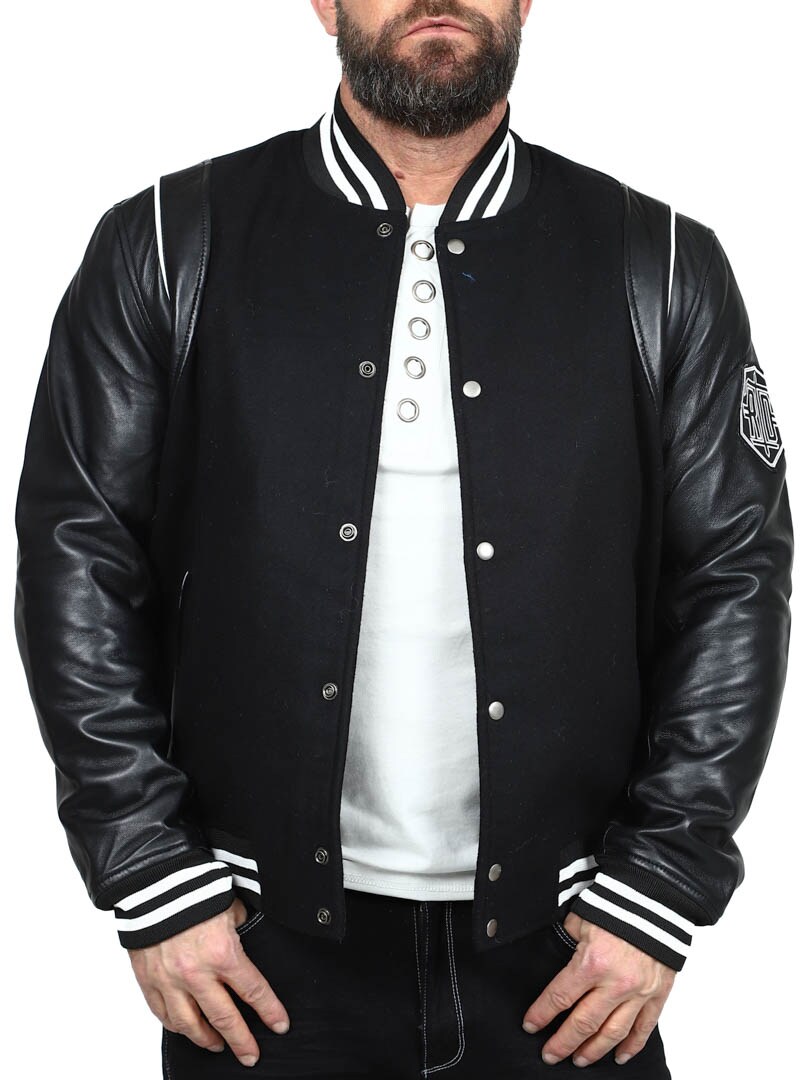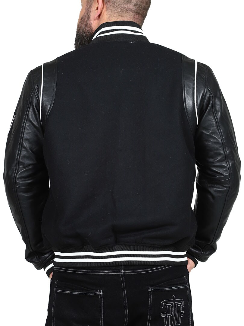 Denna collegejacka är en perfekt blandning av klassiskt och modernt. Designad med överdel i mjukt filtad ull och ärmar i äkta skinn för en exklusiv känsla och hållbar kvalitet. Ribbstickade muddar vid krage, ärmslut och nederkant med klassiska ränder. Två framfickor och två innerfickor. Jackan är ett självklart val för dig som vill kombinera stil och komfort med ett tidlöst uttryck!