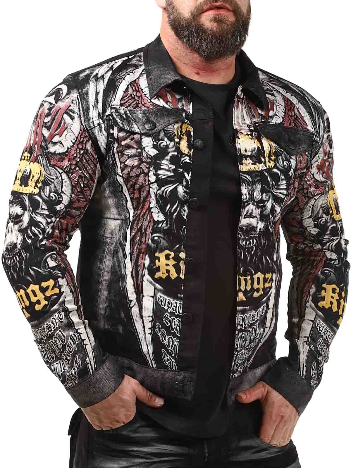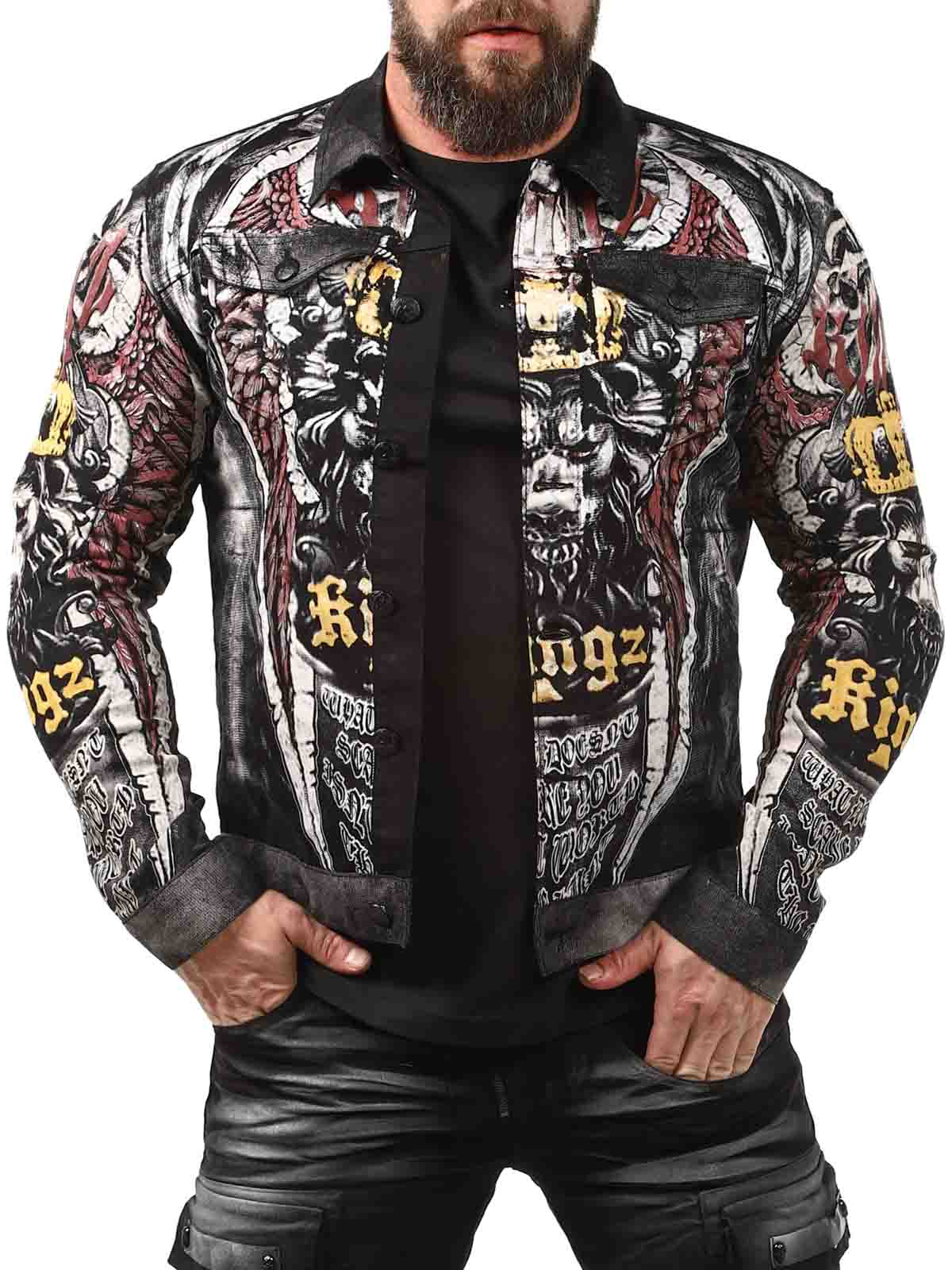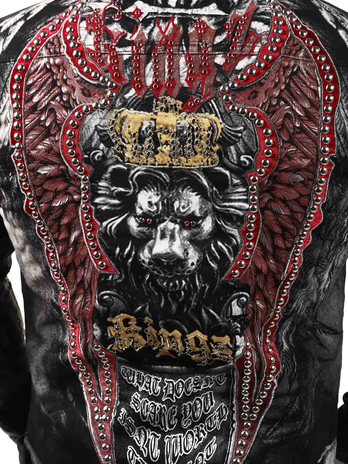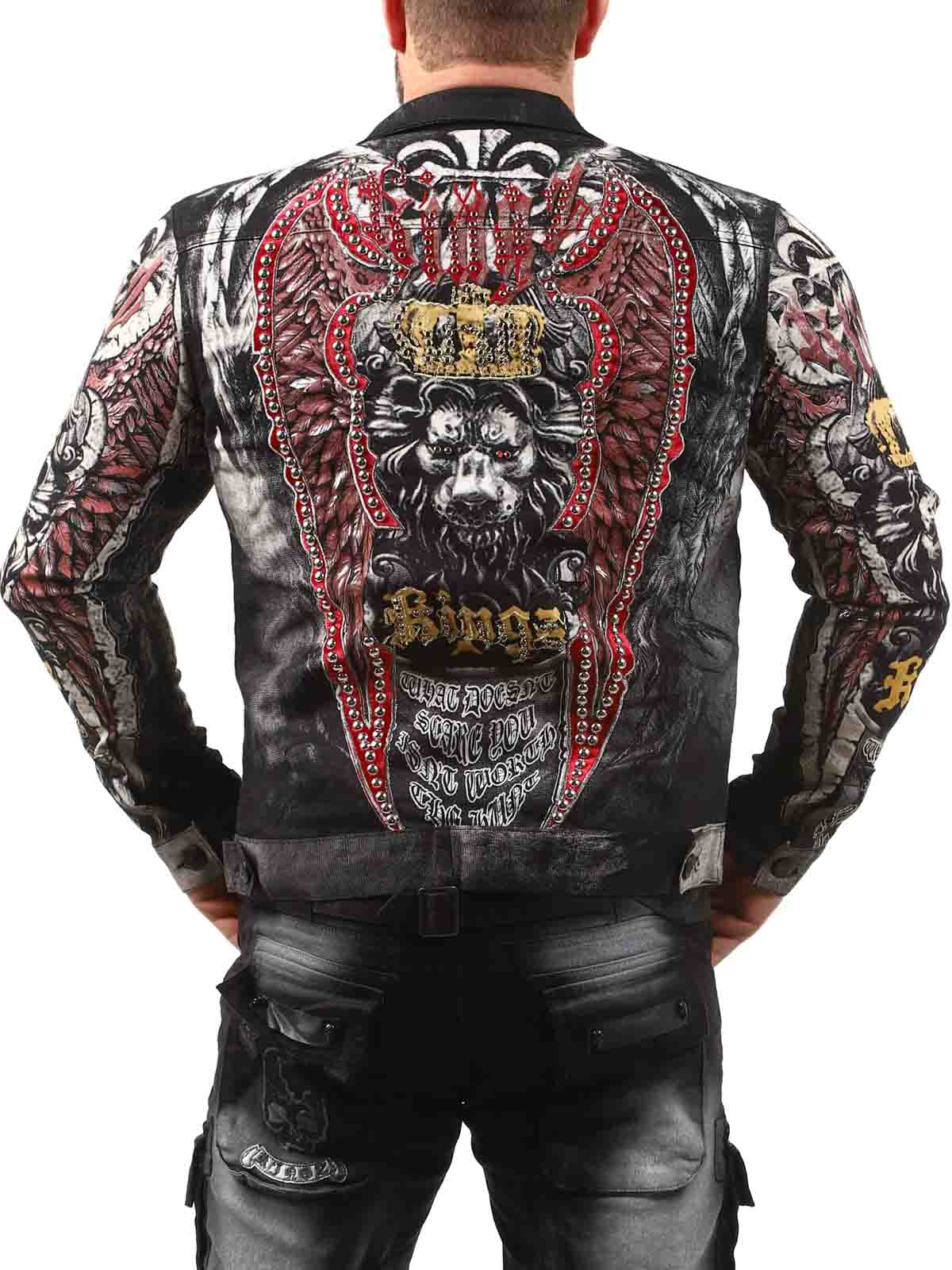 Tuff jacka designad med tryck och nitar i flera färger. Den har krage ,två stängbara bröstfickor och två öppna framfickor. Jackan stängs med knappar och har reglerbara ärmslut med knapp.