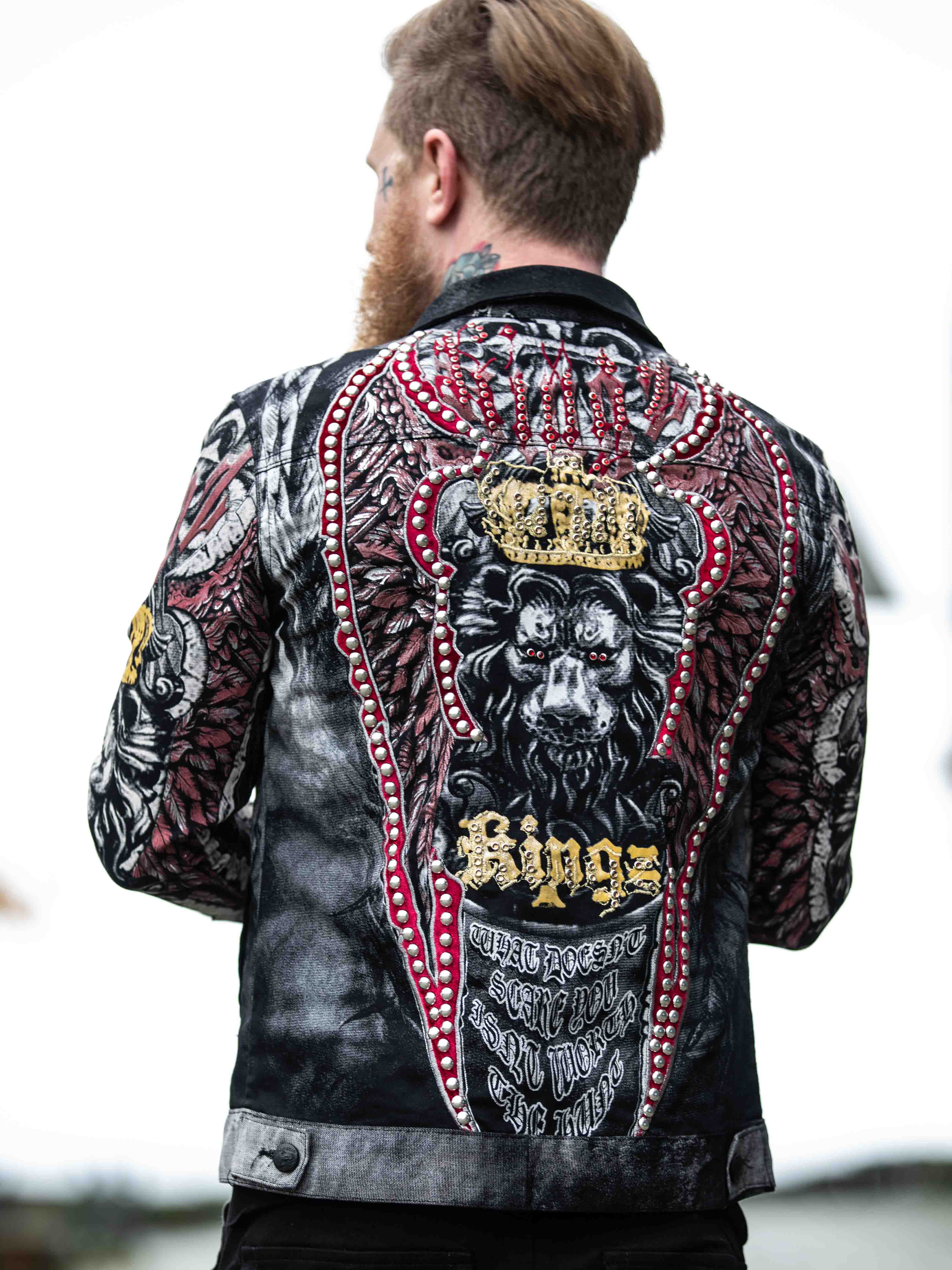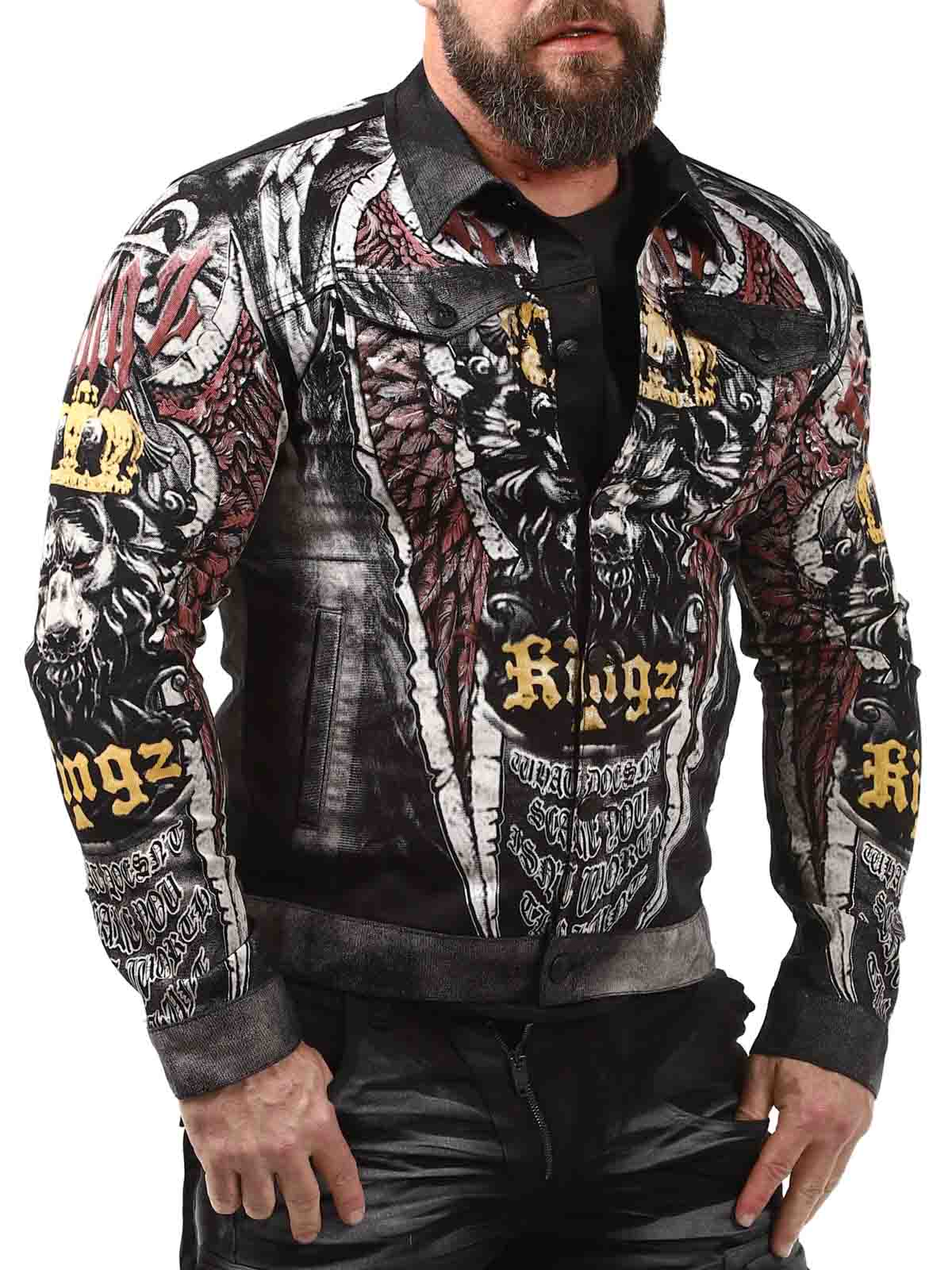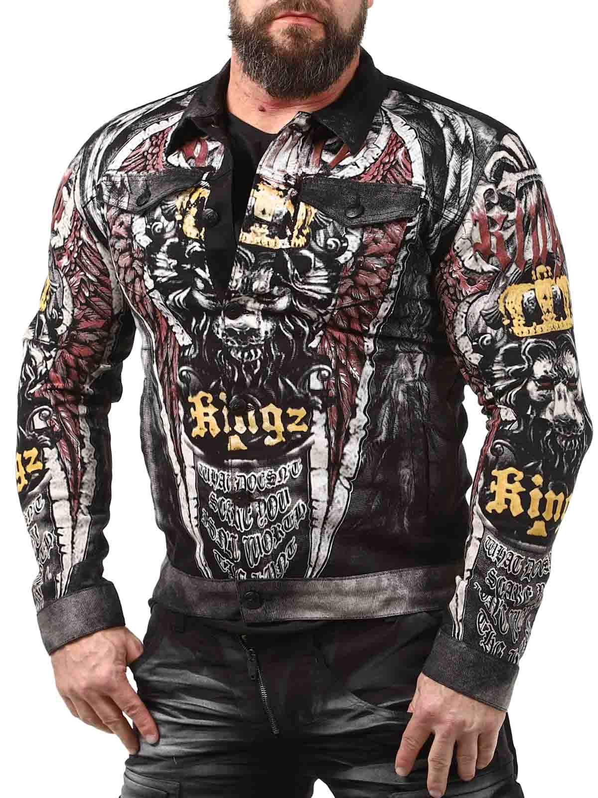 Tuff jacka designad med tryck och nitar i flera färger. Den har krage ,två stängbara bröstfickor och två öppna framfickor. Jackan stängs med knappar och har reglerbara ärmslut med knapp.