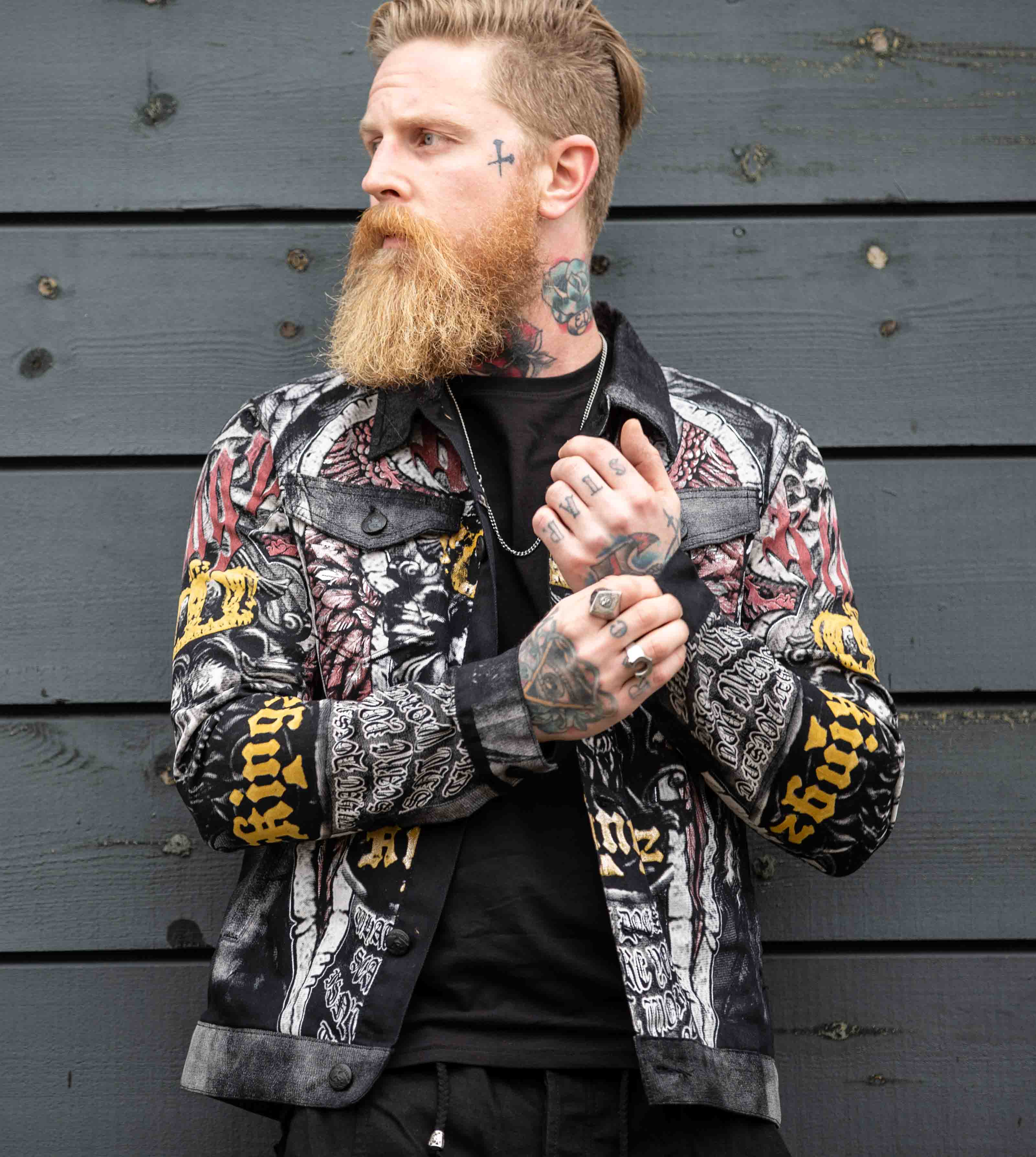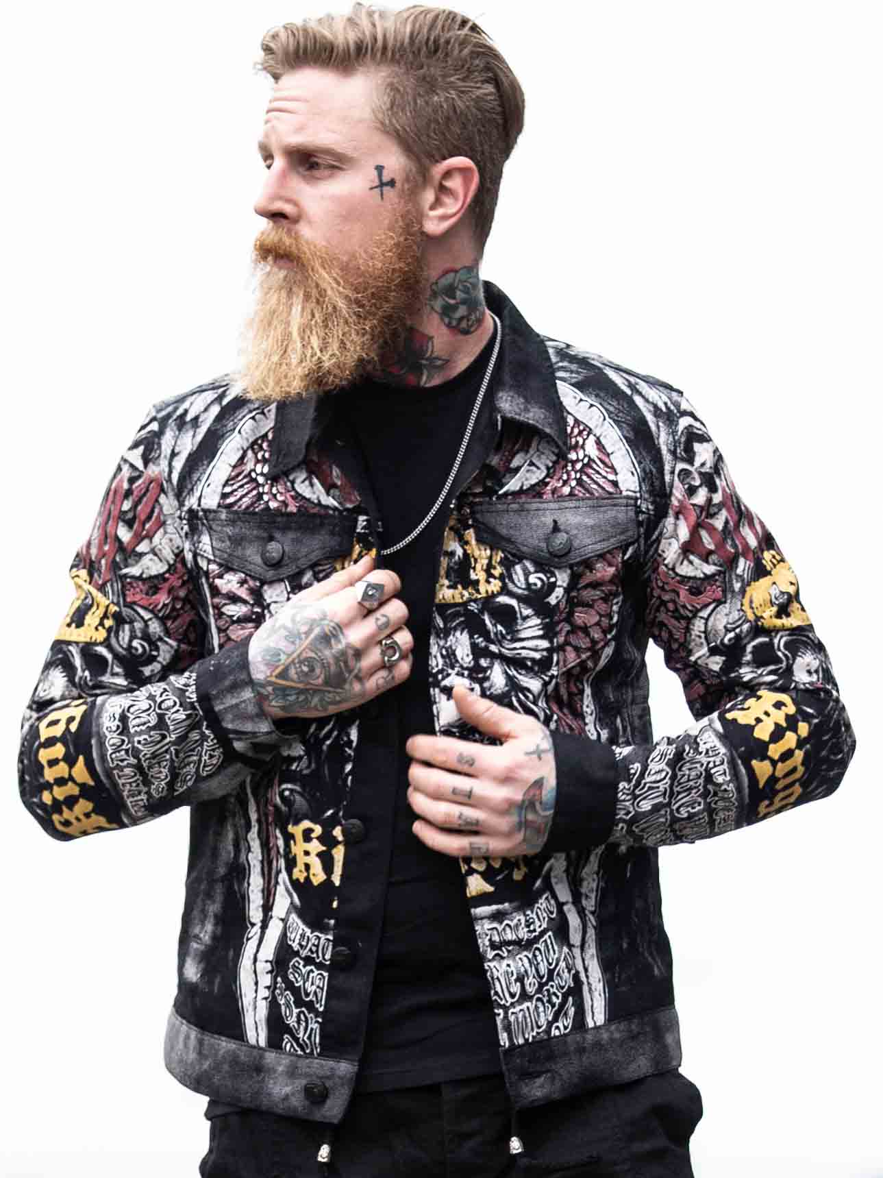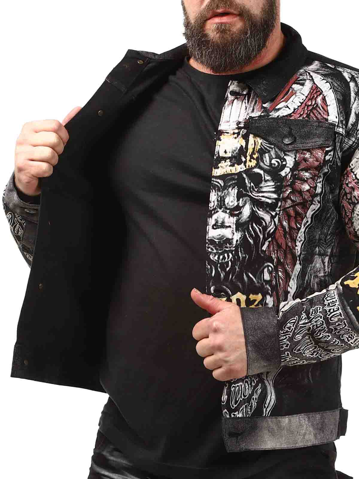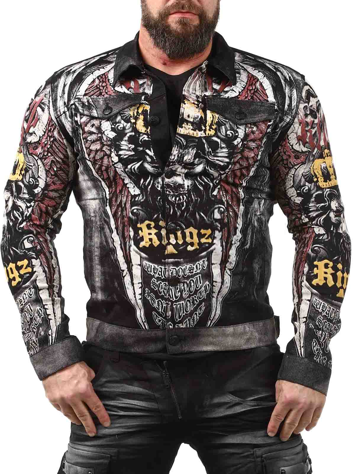 Tuff jacka designad med tryck och nitar i flera färger. Den har krage ,två stängbara bröstfickor och två öppna framfickor. Jackan stängs med knappar och har reglerbara ärmslut med knapp.