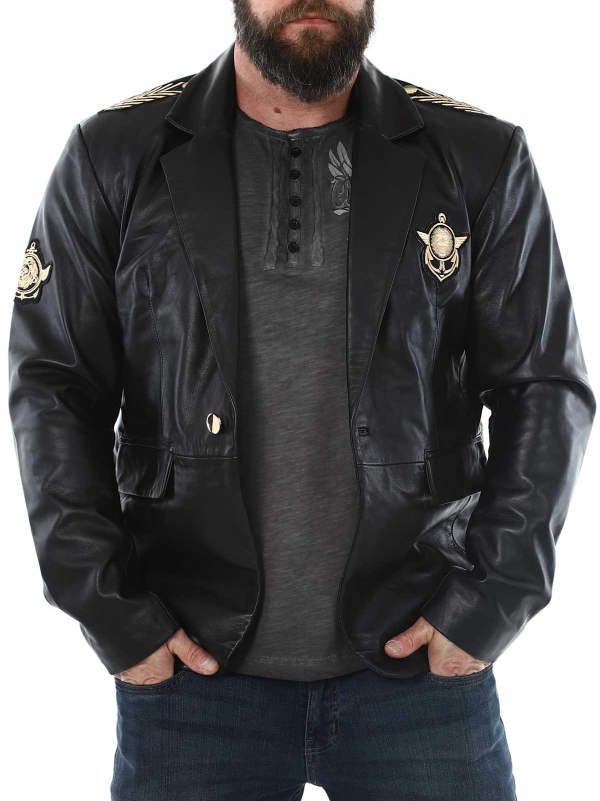 Svart kavaj med guldfärgade tygpatches. Enkelknäppt modell med krage och två framfickor, samt två innerfickor. Denna kavaj är tillverkad i mjukt läder för bästa komfort och finns endast hos RockDenim!
