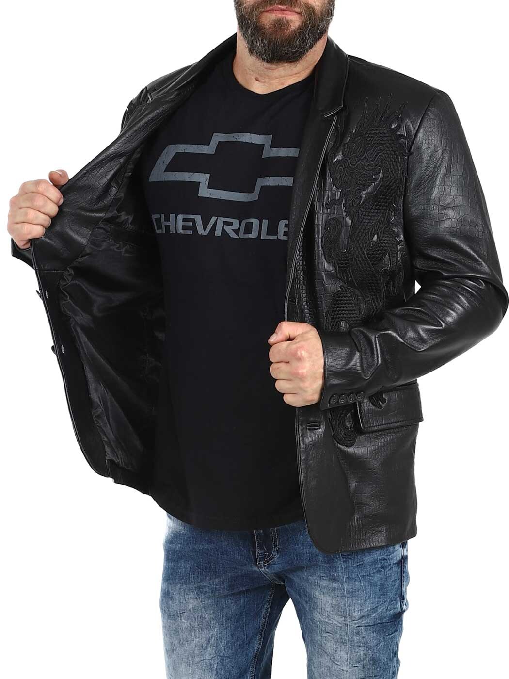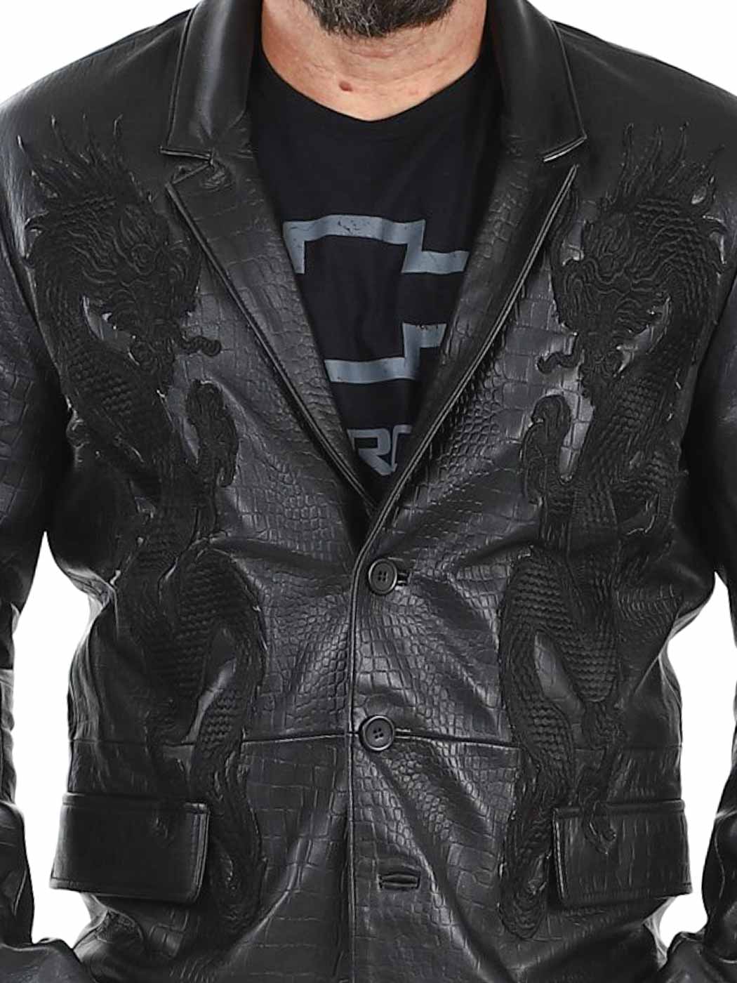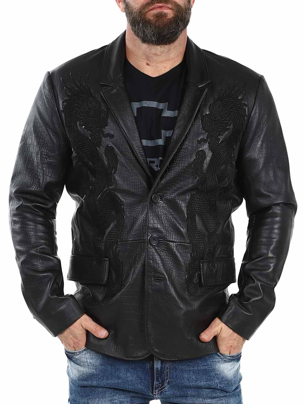 Stil möter attityd i denna exklusiva kavaj. Tillverkad i 100% äkta fårskinn med präglad reptilstruktur och ton-i-ton broderade drakar på framsidan. Den har två ytterfickor, två innerfickor och stängs med knappar. Finns endast hos Rockdenim!