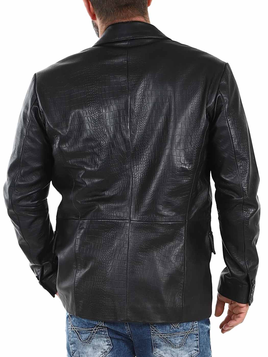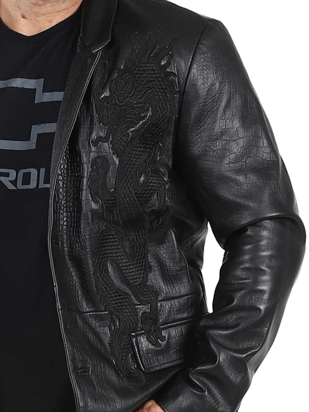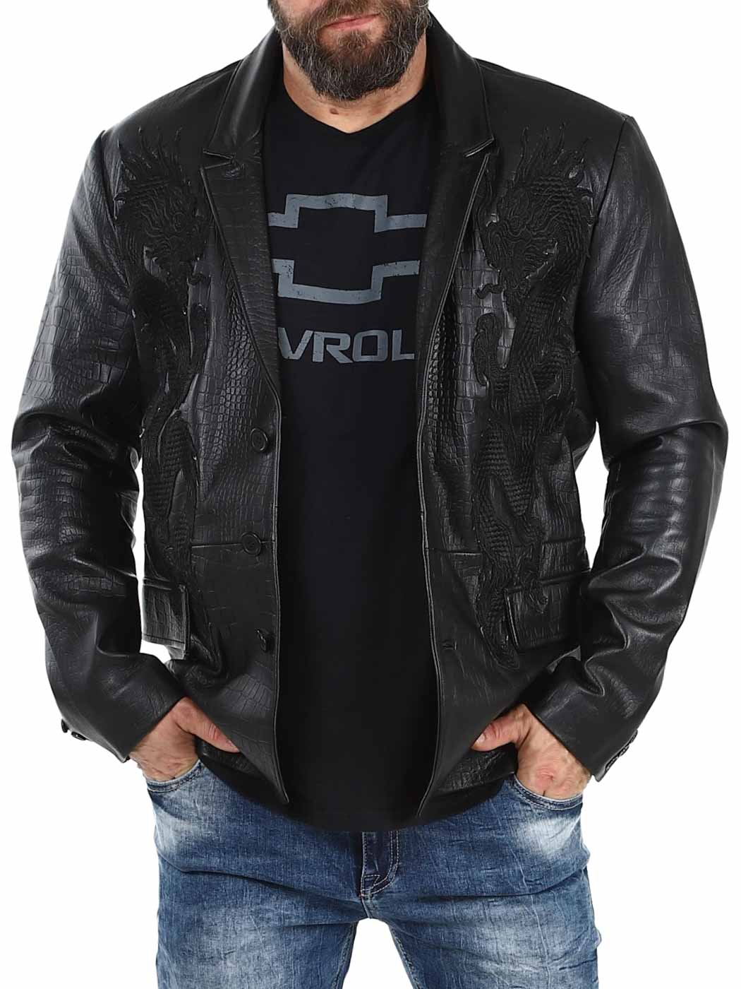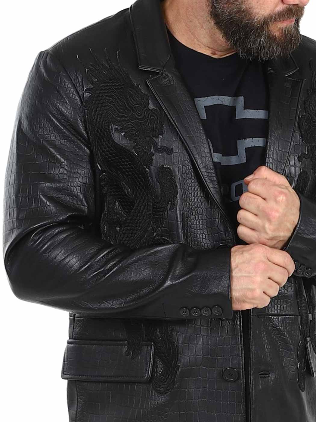 Stil möter attityd i denna exklusiva kavaj. Tillverkad i 100% äkta fårskinn med präglad reptilstruktur och ton-i-ton broderade drakar på framsidan. Den har två ytterfickor, två innerfickor och stängs med knappar. Finns endast hos Rockdenim!