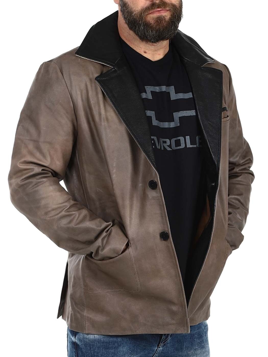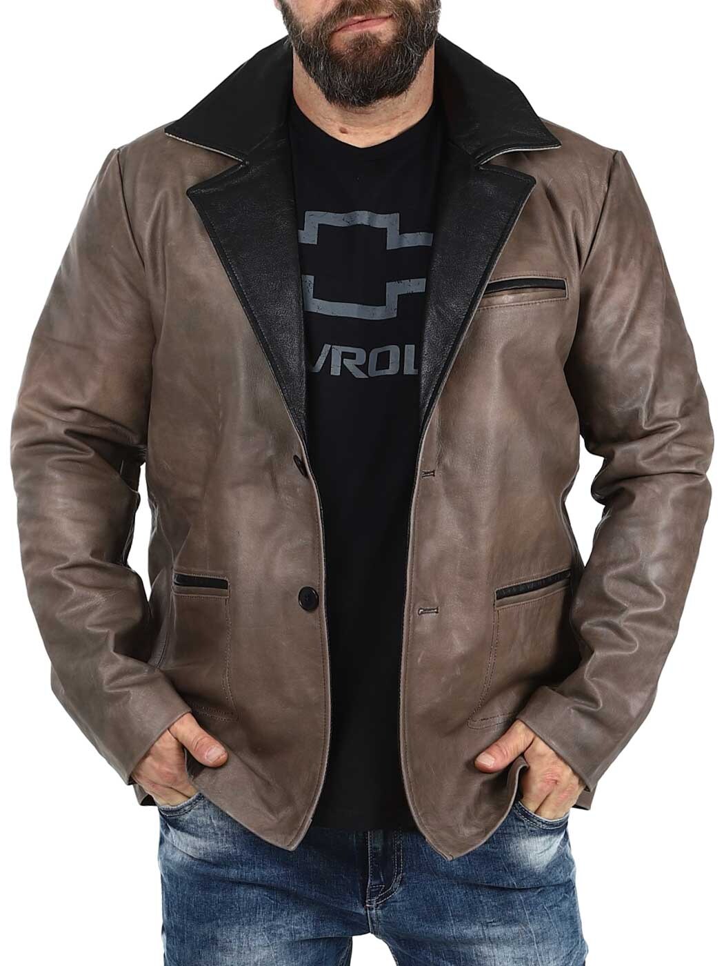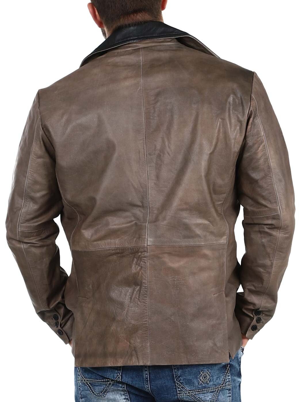 Brun kavaj i slitstarkt läder med vintage look och svarta kontrastdetaljer. Enkelknäppt modell med klassisk krage och tre framfickor samt två innerfickor. Finns endast hos RockDenim!
