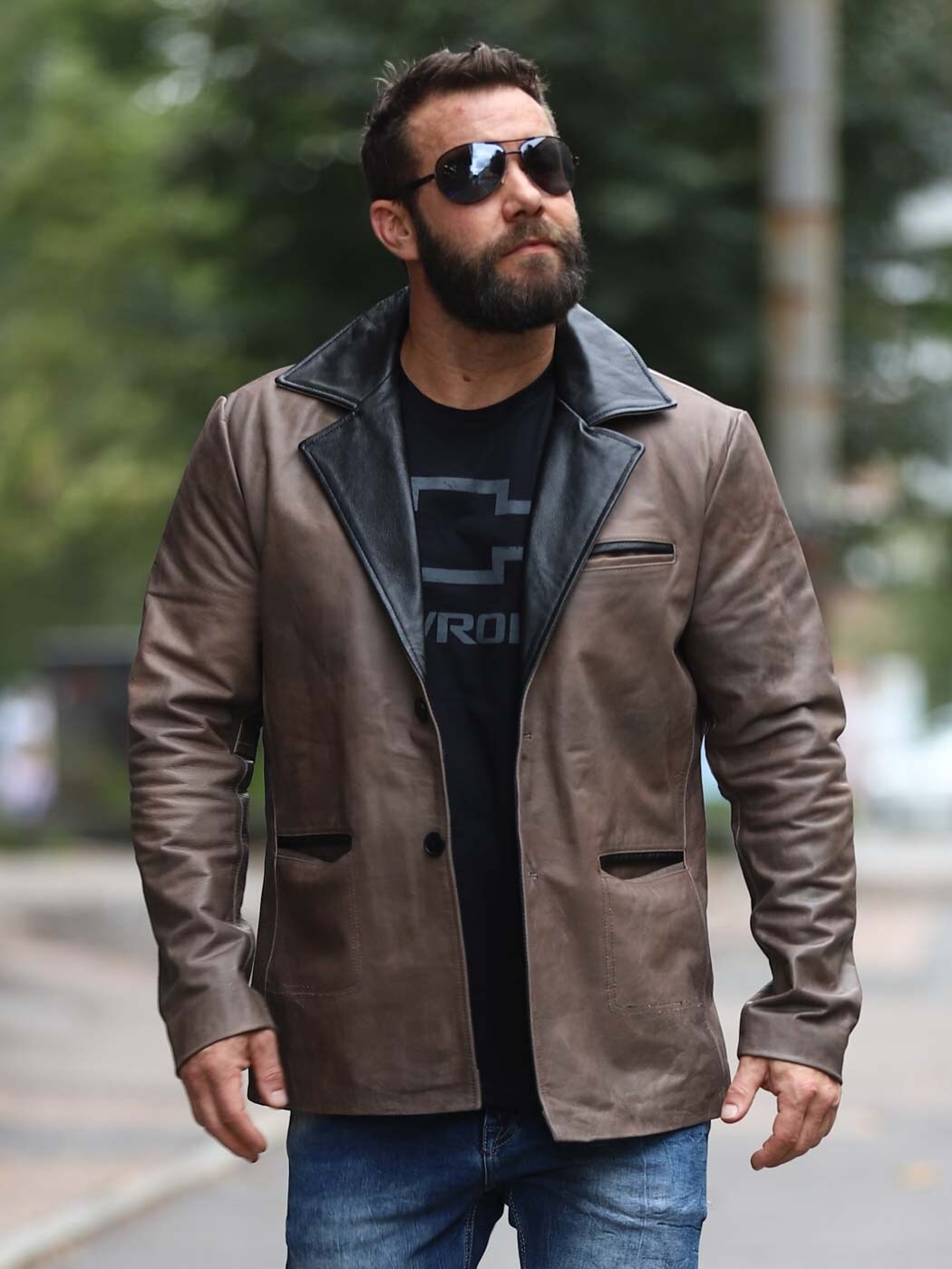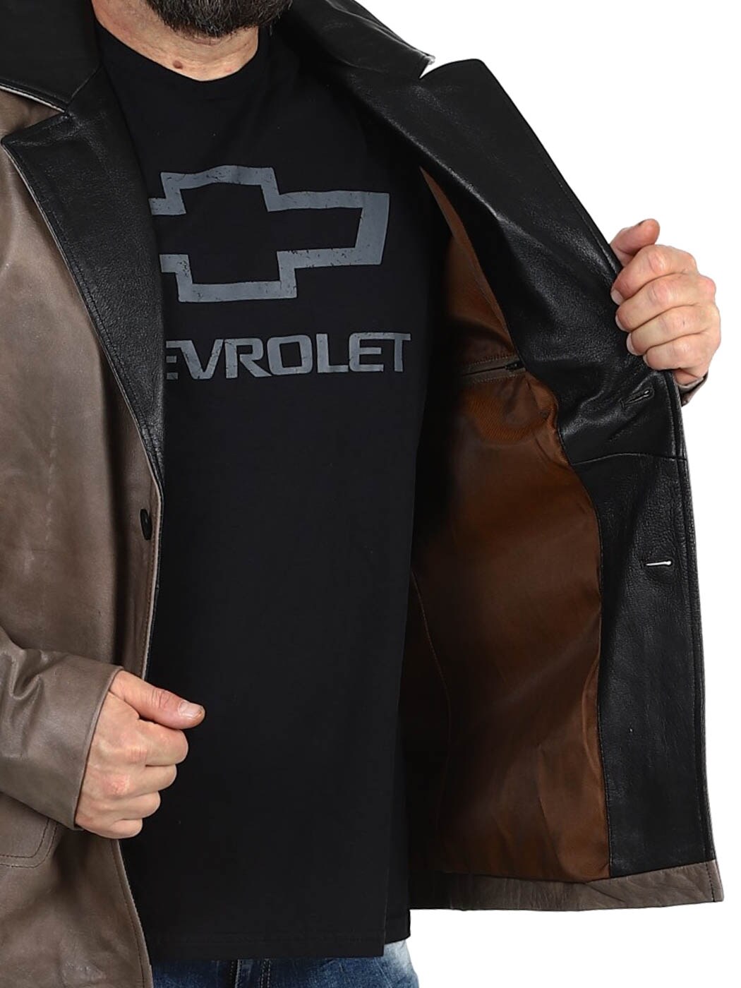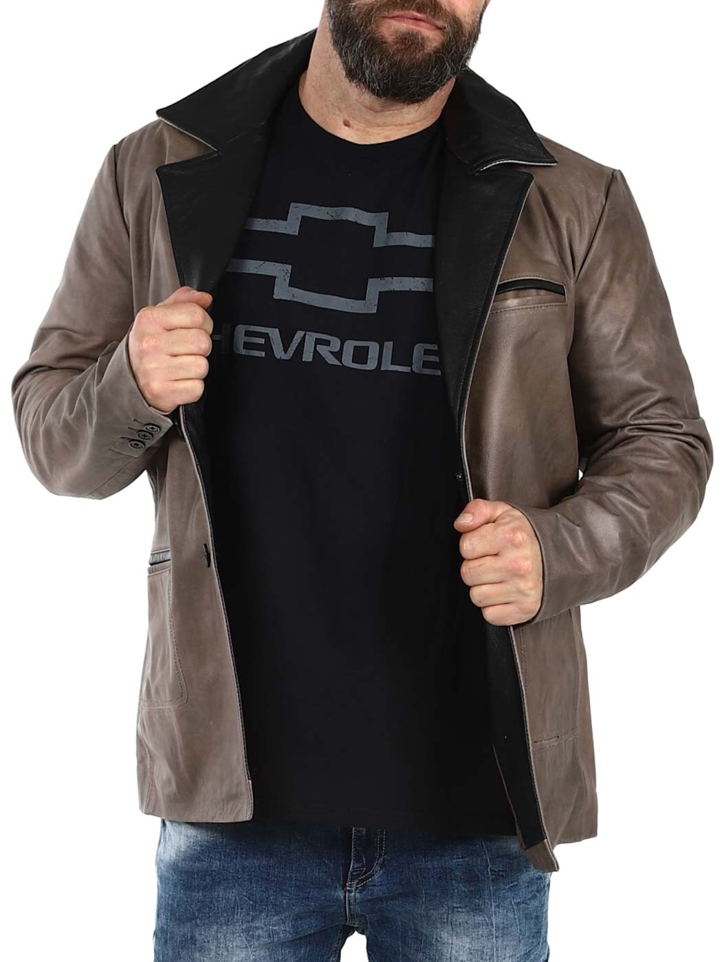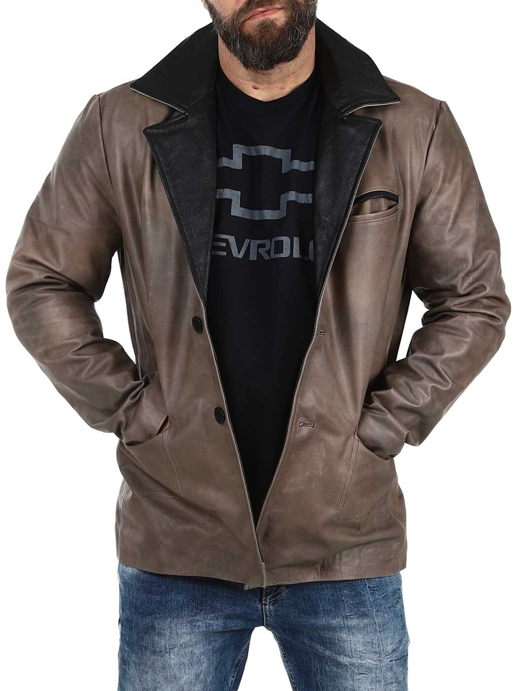 Brun kavaj i slitstarkt läder med vintage look och svarta kontrastdetaljer. Enkelknäppt modell med klassisk krage och tre framfickor samt två innerfickor. Finns endast hos RockDenim!