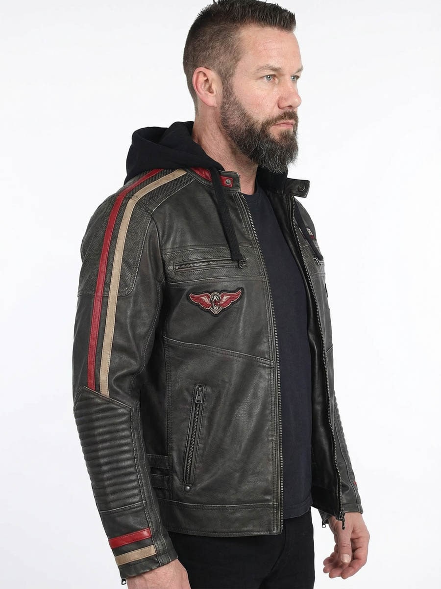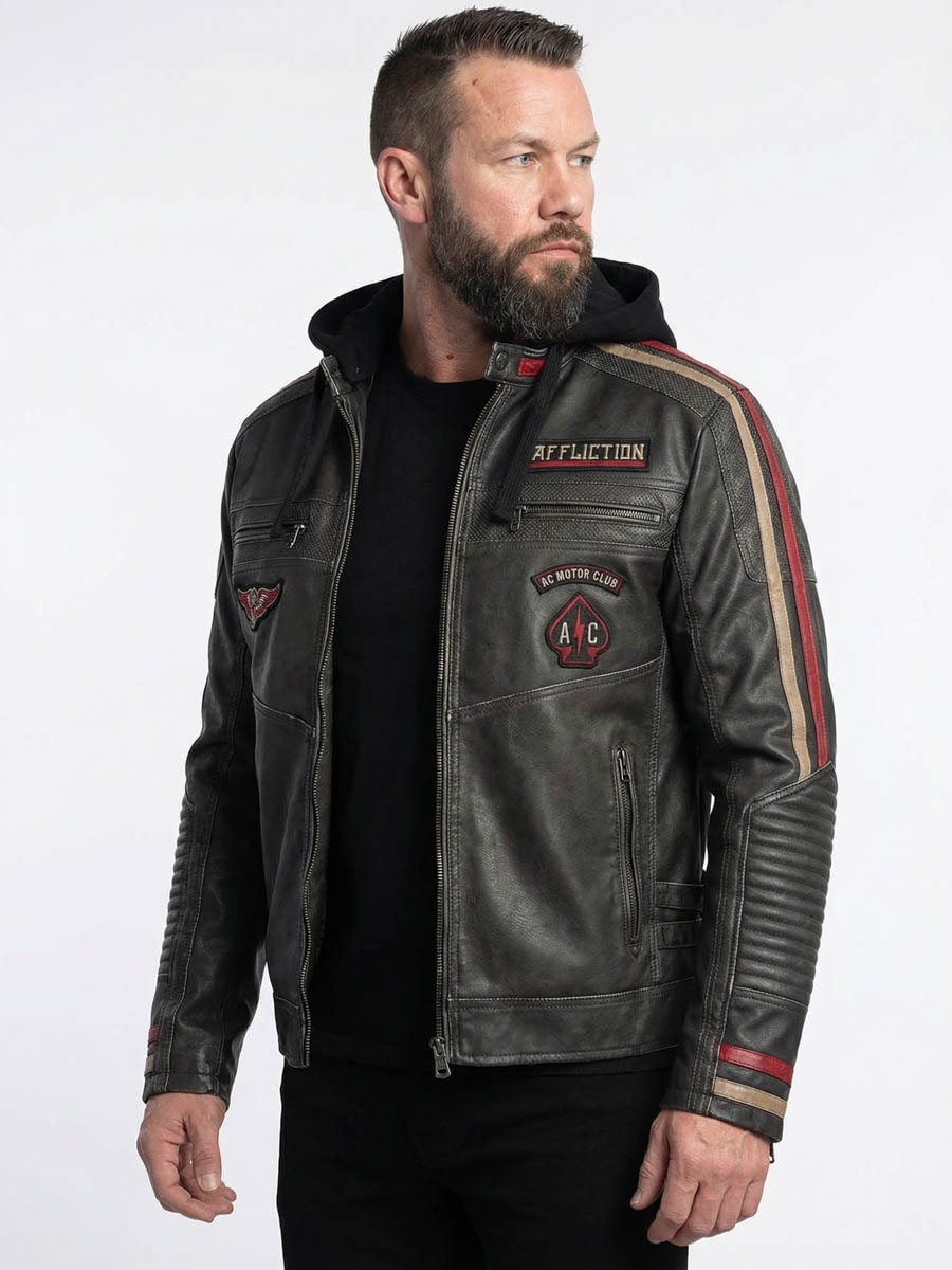 En rockig motorcykelinspirerad jacka med kraftfull attityd och detaljer som sticker ut. Tillverkad i slitstarkt PU-läder med quiltade partier, dekorativa revärer och broderade patches. Baksidan pryds av ett stort ikoniskt Affliction-motiv som ger jackan en rejäl dos karaktär. Jackan är lätt fodrad för extra komfort och värme, och den mjuka huvan går att ta av när du vill byta stil. Perfekt för dig som vill ha en tuff, bekväm och statement-stark jacka i vardagen!