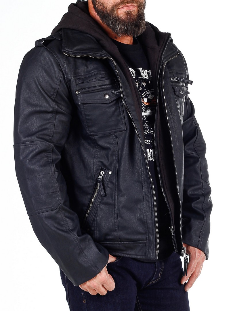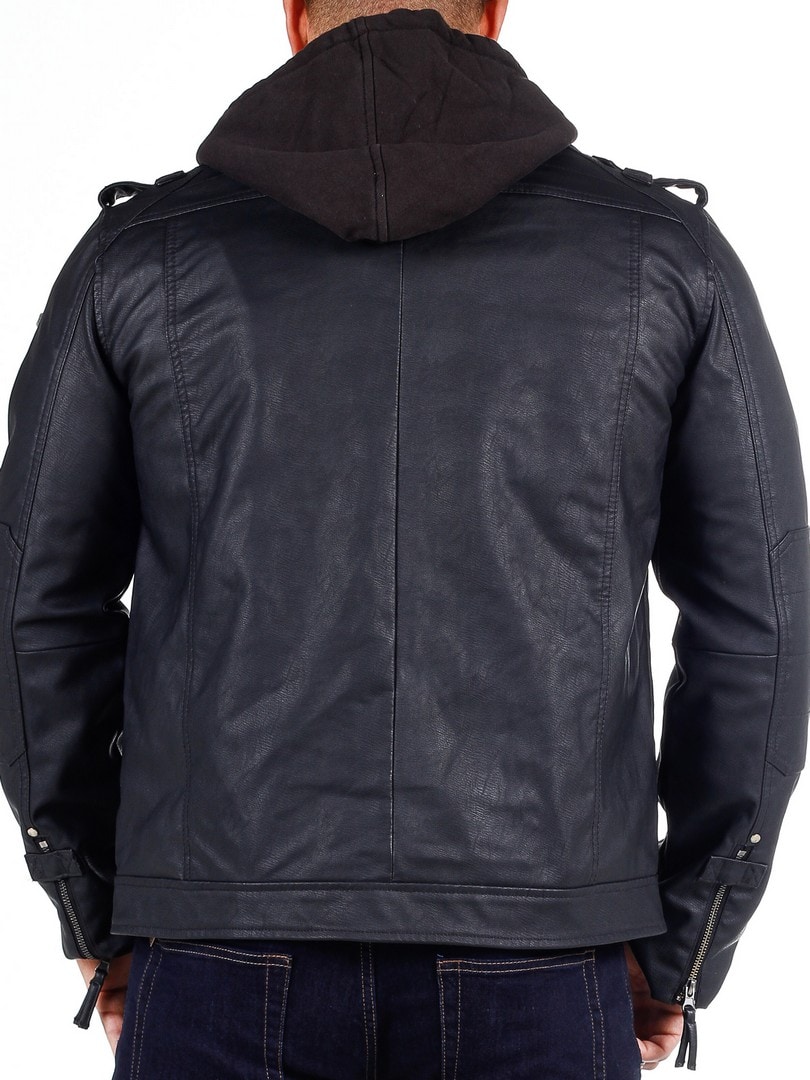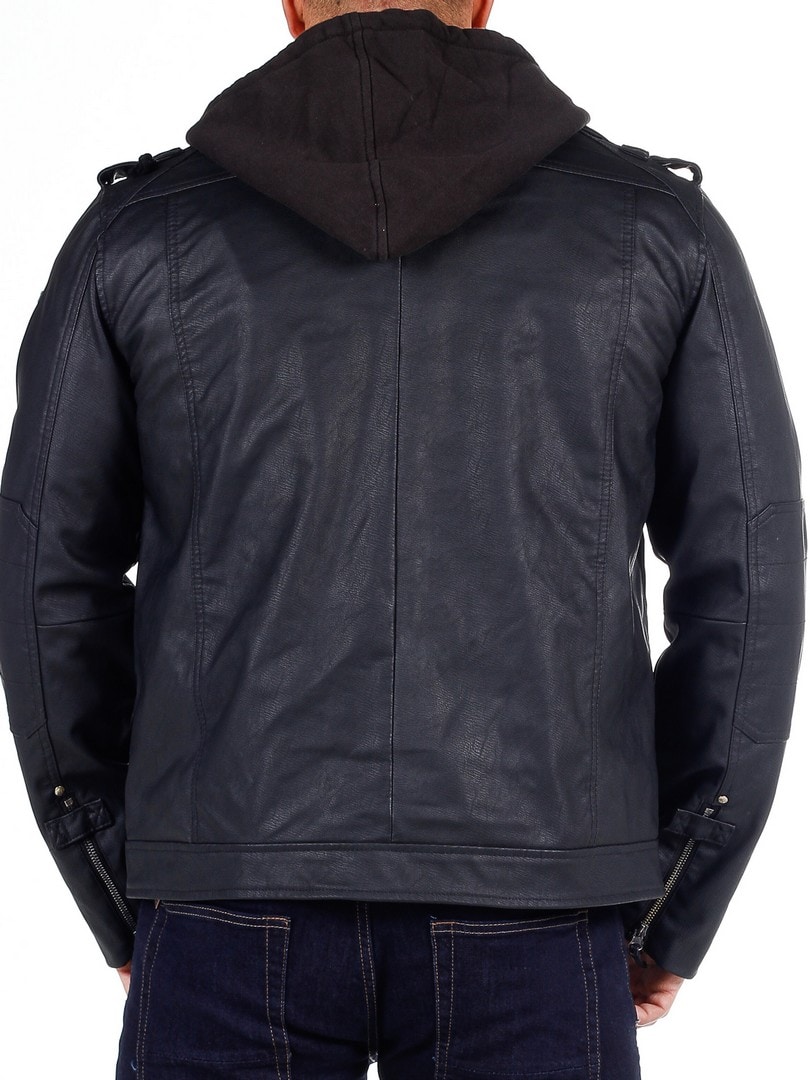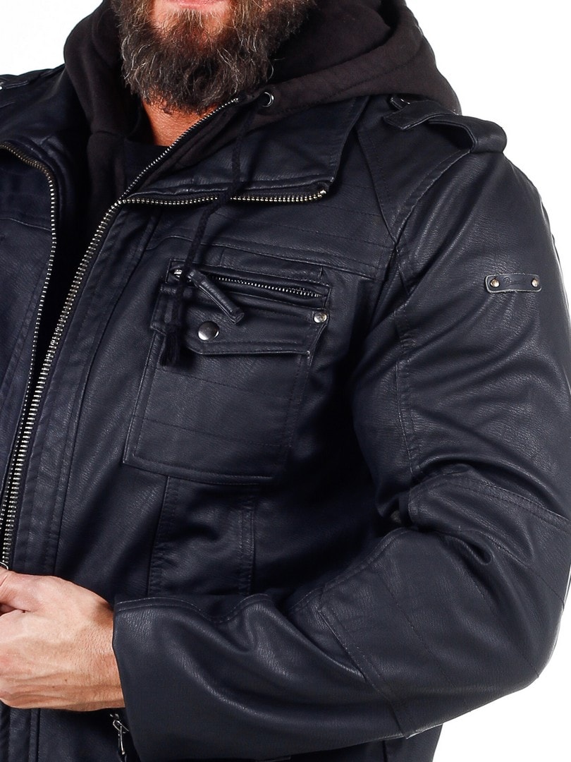 Jacka i svart skinnimitation med huva som enkelt tas av tack vare blixtlåsen. Tre bröstfickor, två stängs med tryckknappar och en med blixtlås och två rymliga fickor på magen. Jackan har en hög krage och stängs med blixtlås i silver. Snygga detaljer som sömmar, påsydda tygpartier på armbågar och hällar på axlarna.