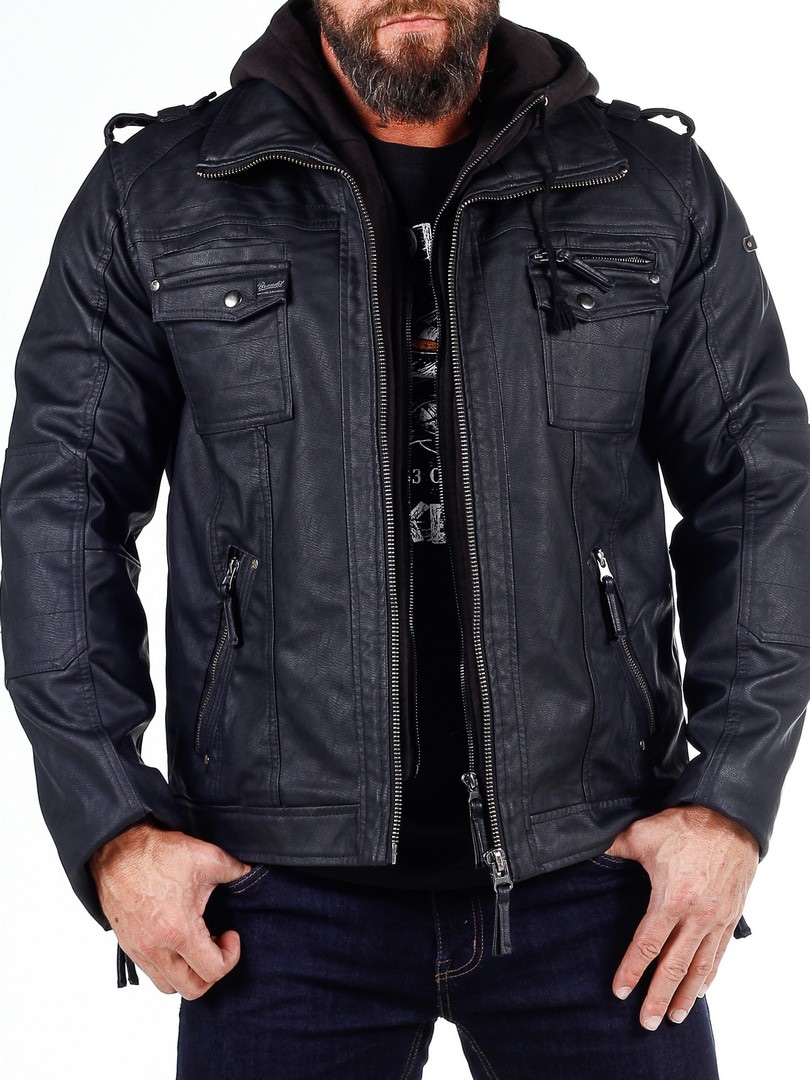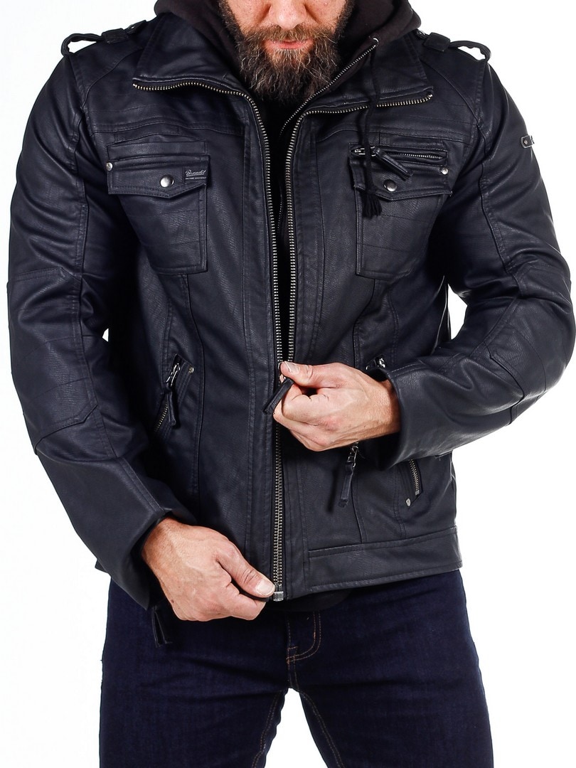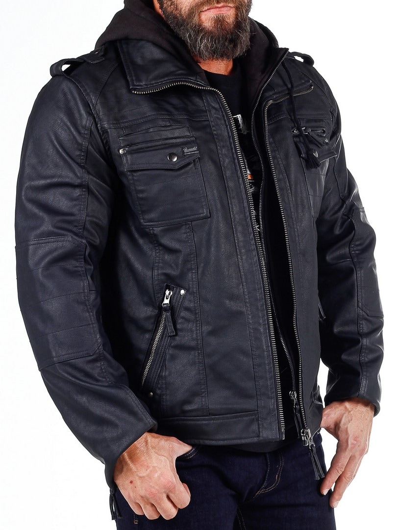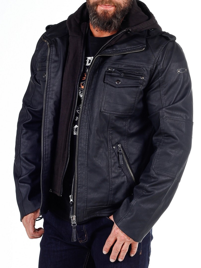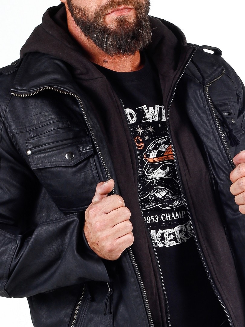 Jacka i svart skinnimitation med huva som enkelt tas av tack vare blixtlåsen. Tre bröstfickor, två stängs med tryckknappar och en med blixtlås och två rymliga fickor på magen. Jackan har en hög krage och stängs med blixtlås i silver. Snygga detaljer som sömmar, påsydda tygpartier på armbågar och hällar på axlarna.
