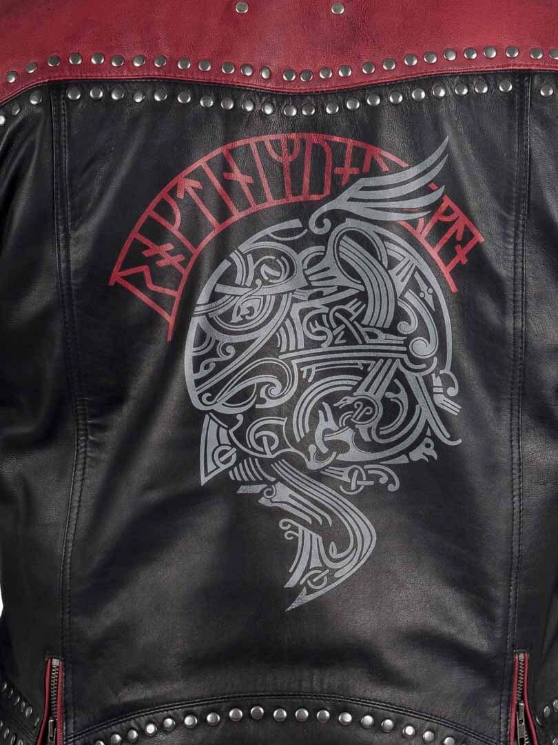 En vadderad jacka i äkta, följsamt läder med kontrasterande röda paneler samt dekorativa nitar som ger ett tufft och distinkt uttryck. På ryggen finns ett stort vikingainspirerat tryck som förstärker den unika looken. Jackan har flera praktiska fickor och reglerbara ärmslut, samt linning. En jacka för dig som vill ha en rockig stil - med premiumkänsla!