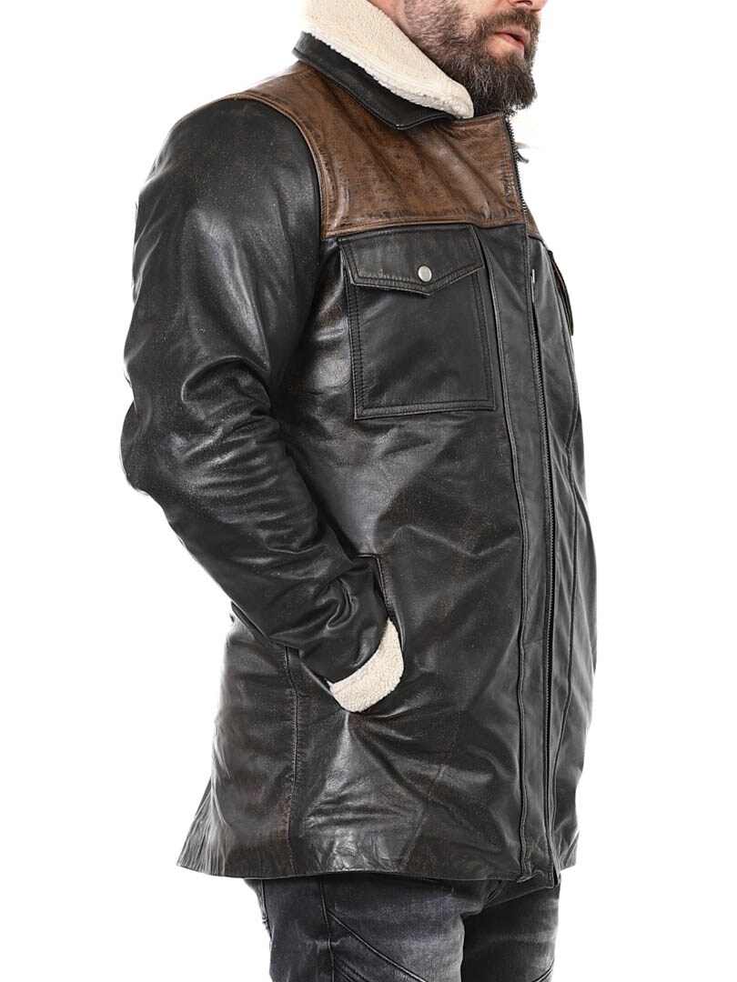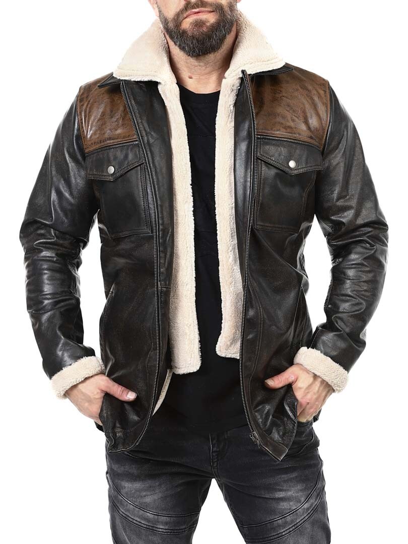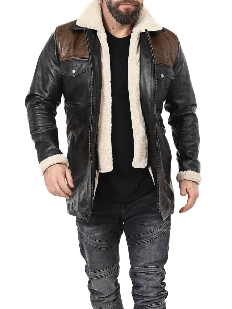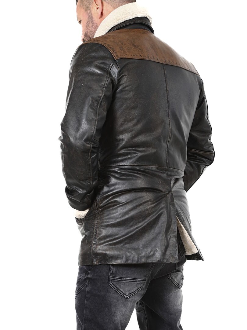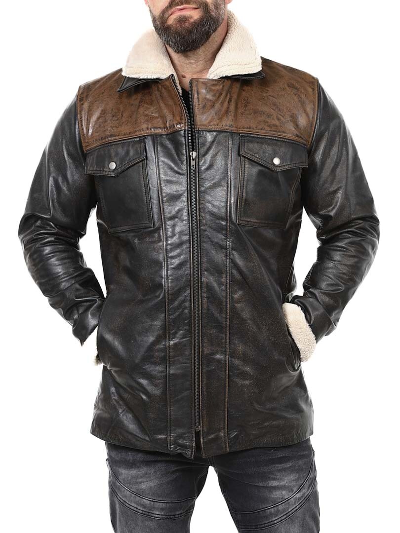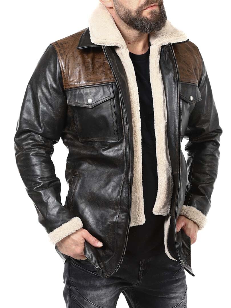 Robust och kraftfull jacka i äkta buffelläder med en design som utstrålar självsäkerhet och attityd. Den kombinerar svart läder med kontrasterande bruna axelpartier för en distinkt look. Insidan är fodrad med varmt teddyfoder som ger komfort och värme under kalla dagar. Jackan har flera fickor och avtagbar teddykrage så att du lätt kan variera din look efter stil och väder. Denna jacka är för mannen som kräver stil, styrka och hållbar kvalitet – exklusivt hos RockDenim!