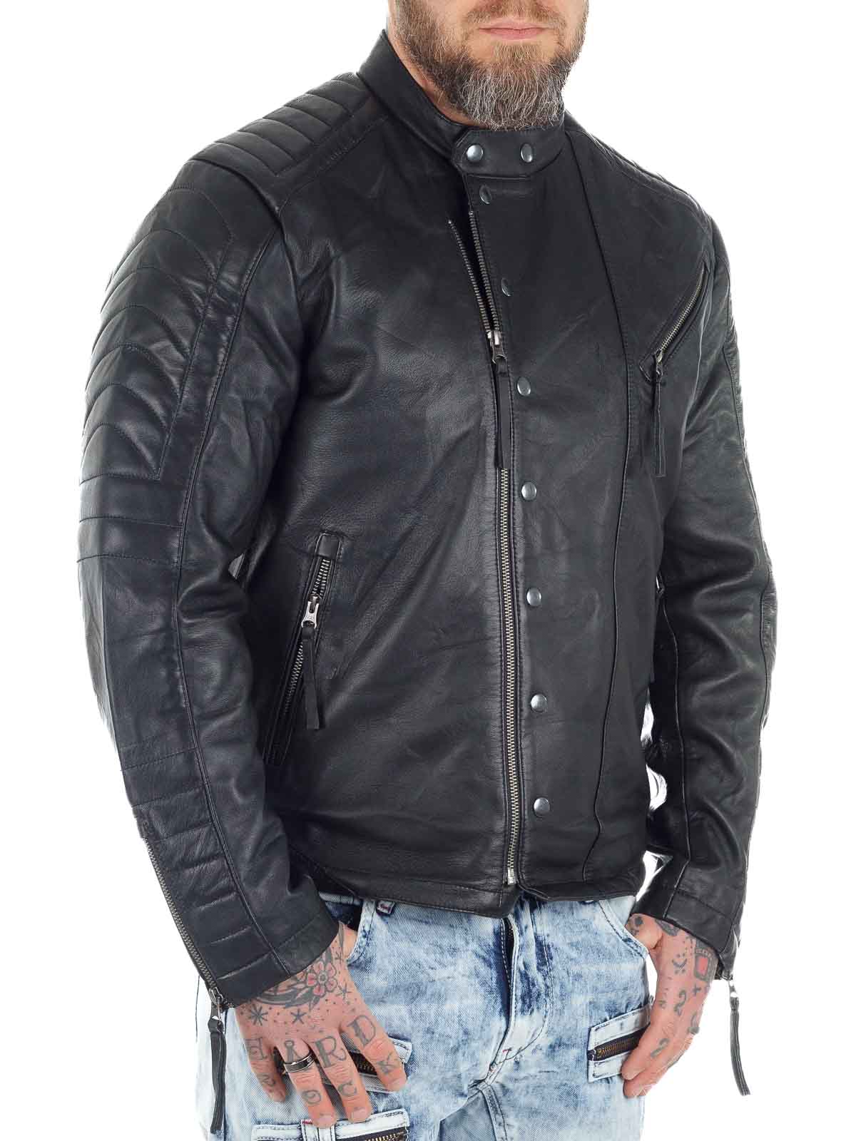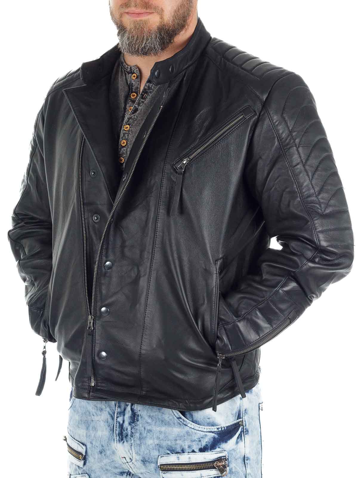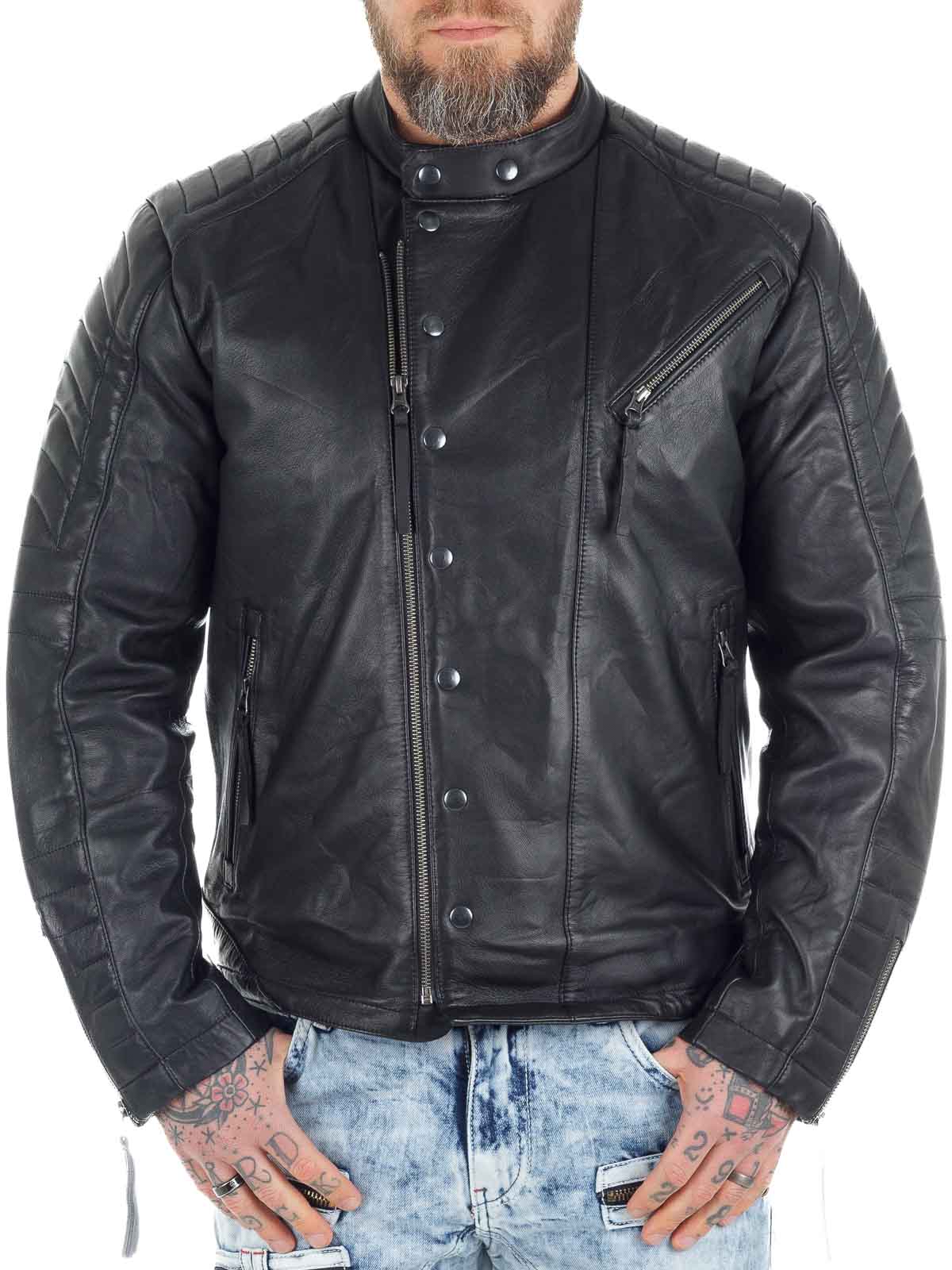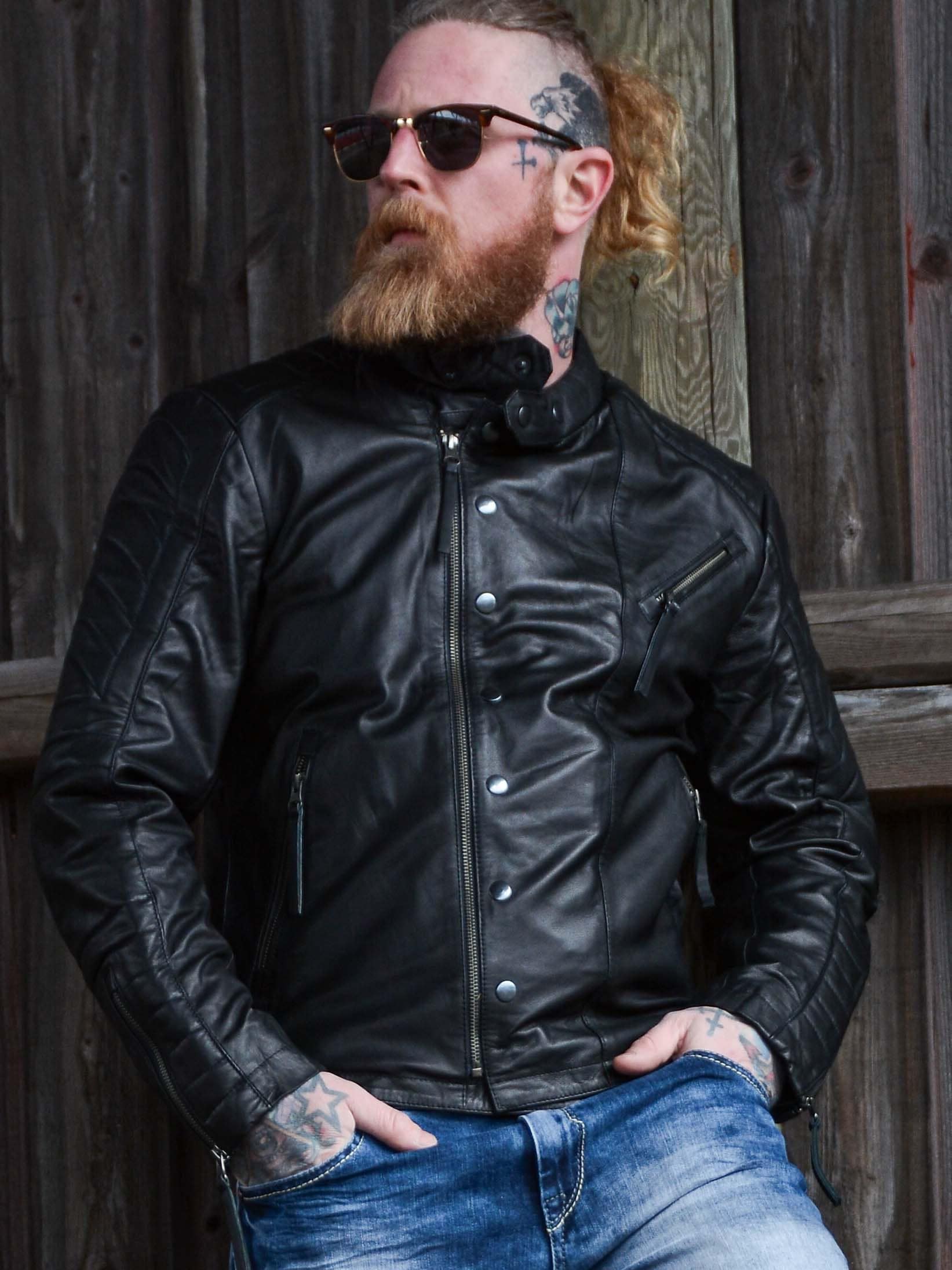 Tuff skinnjacka i mjukt och följsamt fårskinn med markerade detaljer som ger ett kraftfullt uttryck. Modellen har dragkedje- och knappstängning framtill samt vadderade partier på axlar, ärmar och rygg som förstärker den bikerinspirerade looken. Tre praktiska ytterfickor och två innerfickor gör jackan både snygg och funktionell. En exklusiv skinnjacka med attityd som passar perfekt för dig som vill ha både komfort och karaktär!