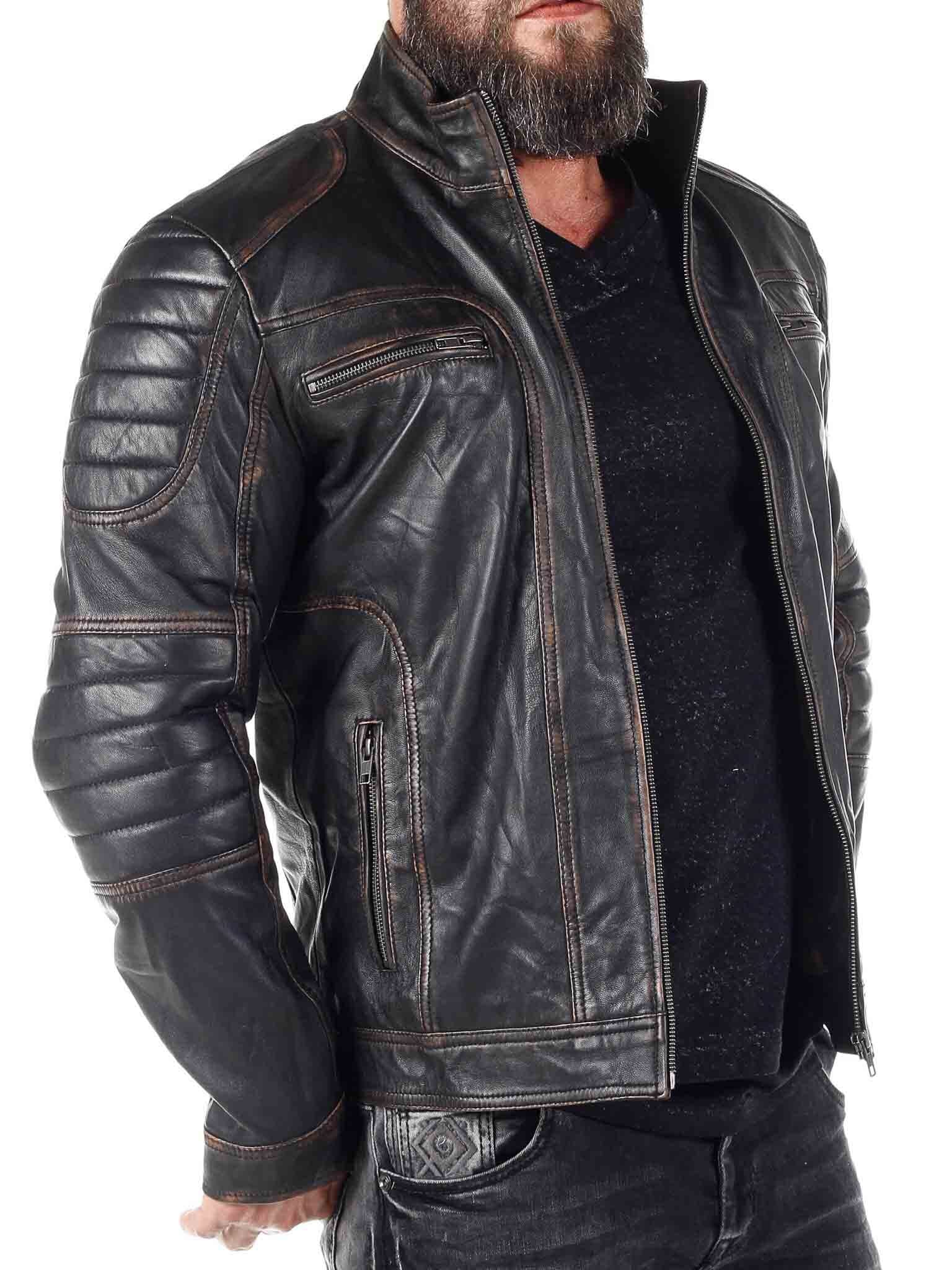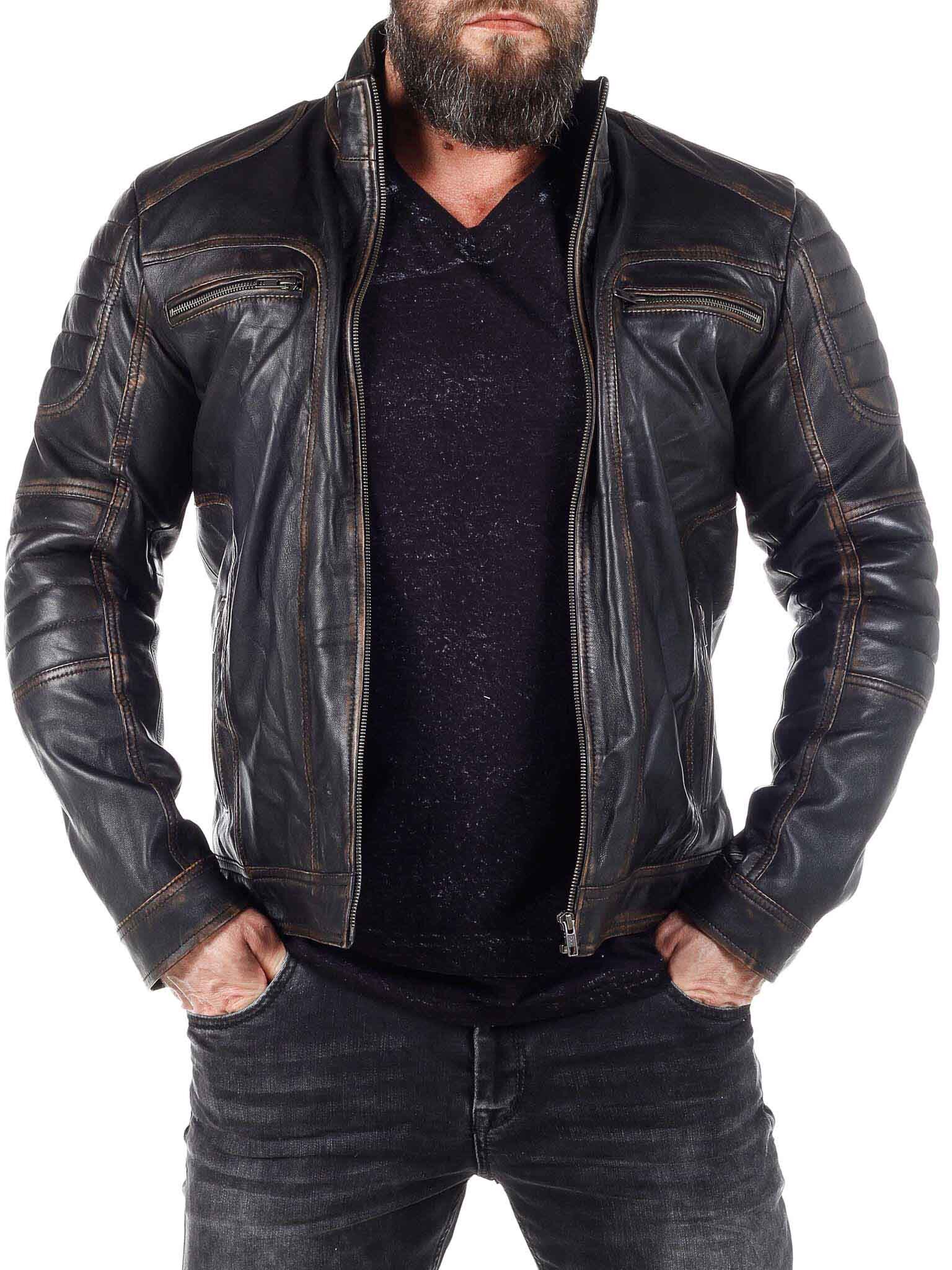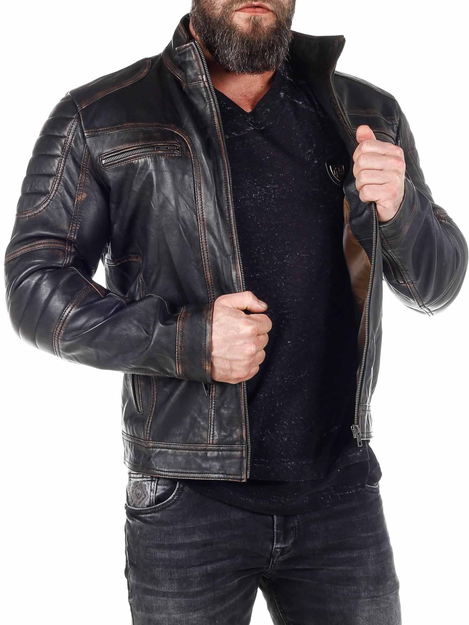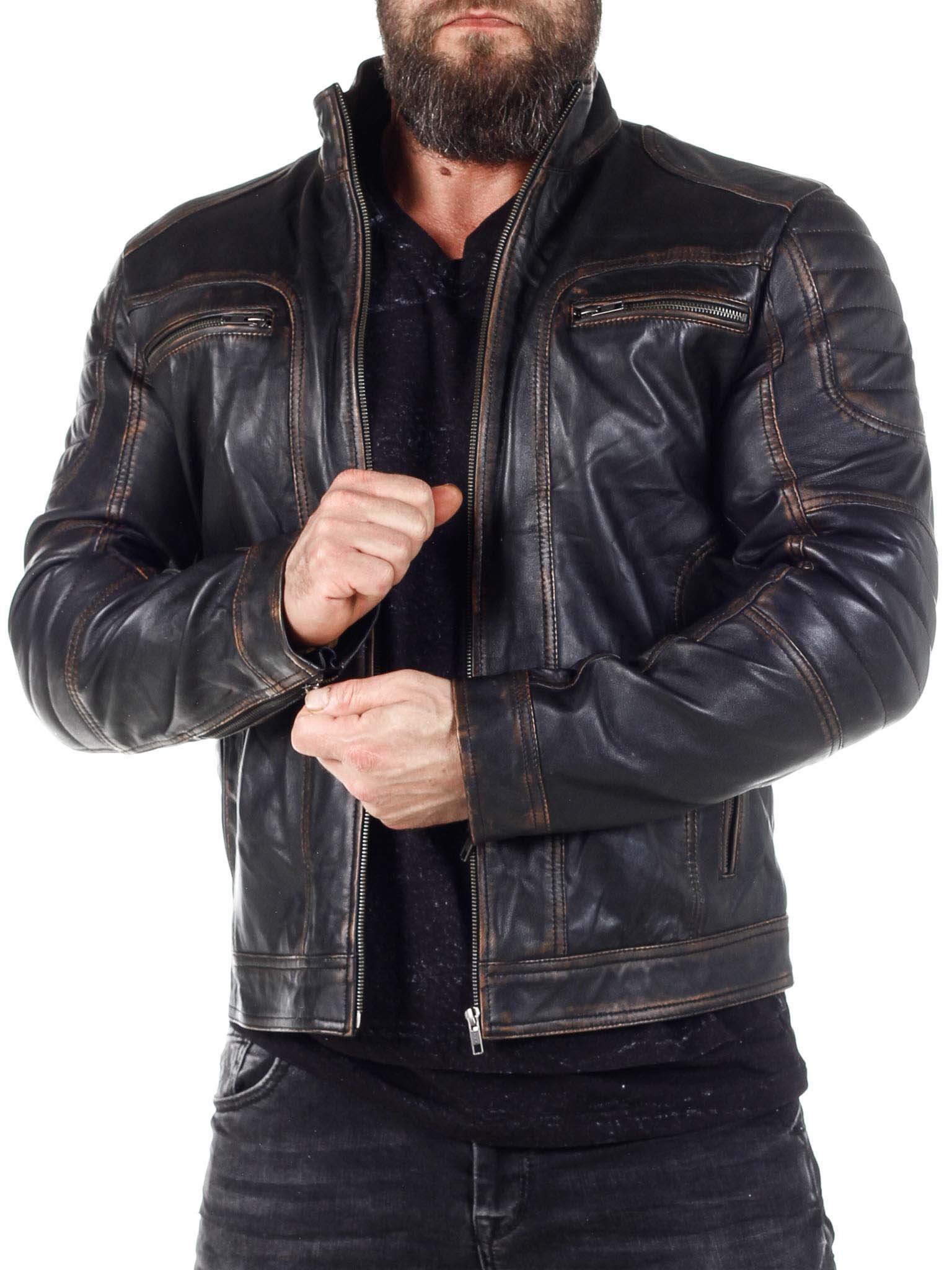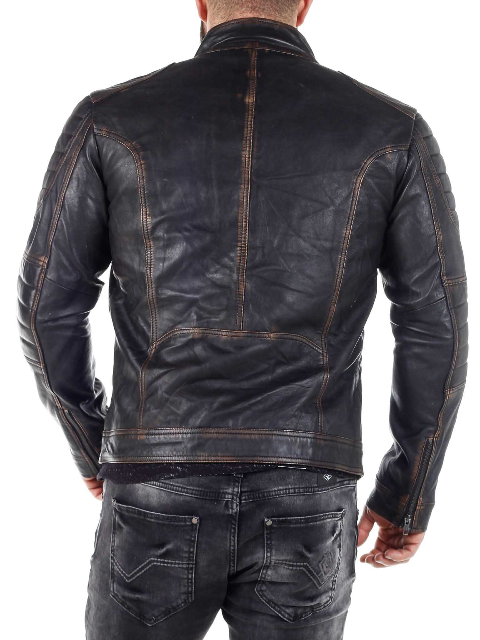 Snygg skinnjacka med ljusare partier som ger en snygg vintagelook. Den är reglerbar i ärmsluten med dragkedja och har vadderade partier. Det finns fyra stängbara framfickor och två innerfickor. Jackan stängs med dragkedja.