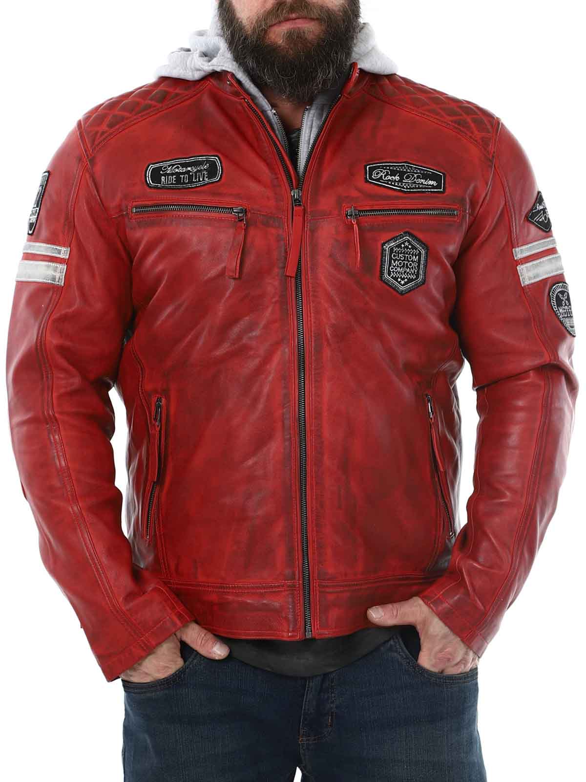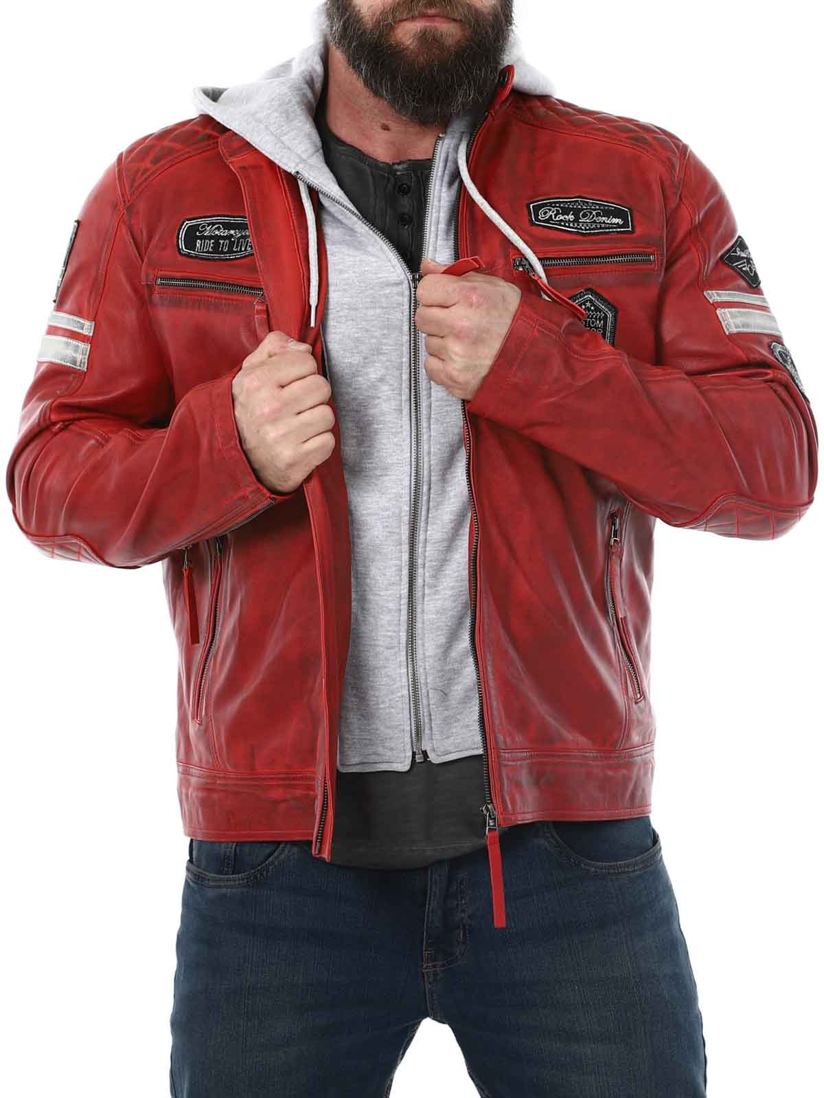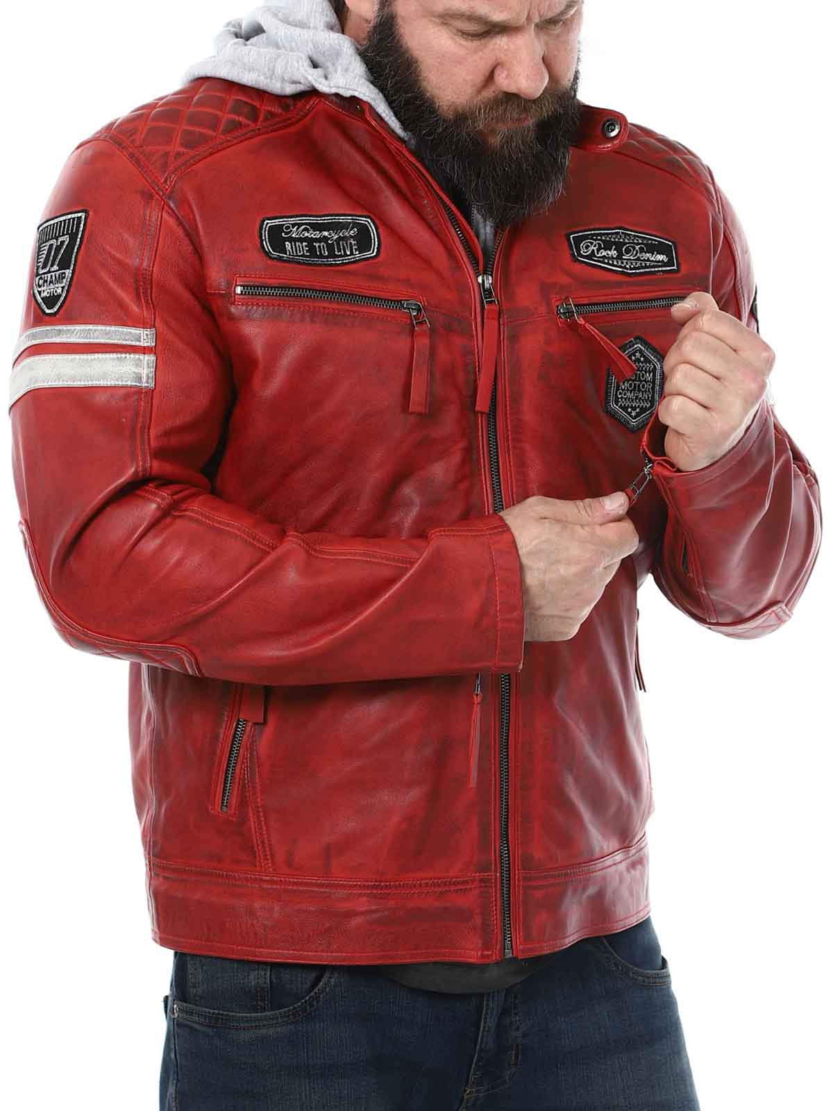 Racing-inspirerad jacka i mjukt och följsamt läder. Designad med tygpatches och avtagbar huva i sweatshirtmaterial. Fyra framfickor med dragkedja, två innerfickor och reglerbara ärmslut. Snygg jacka som endast finns hos RockDenim!