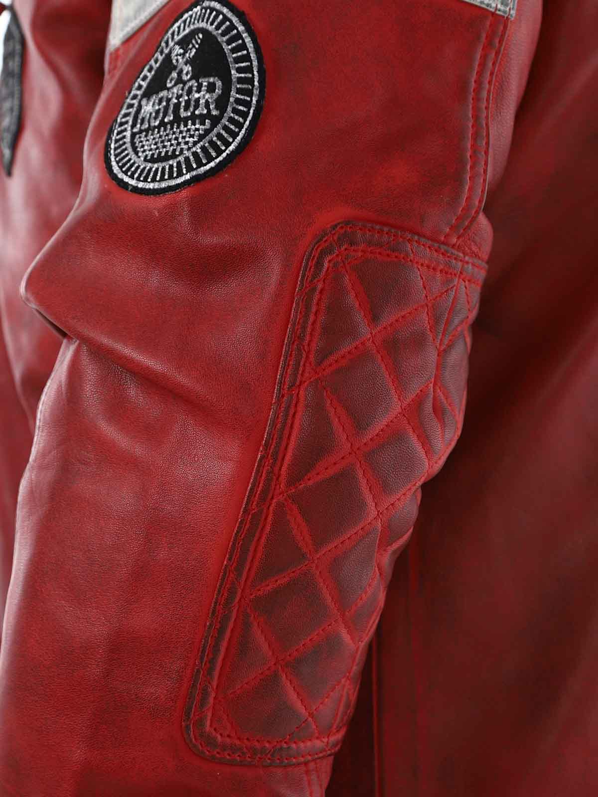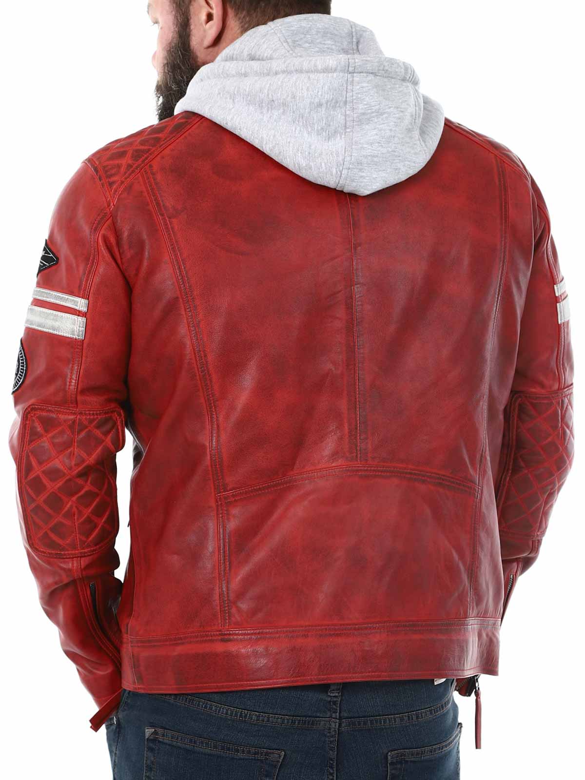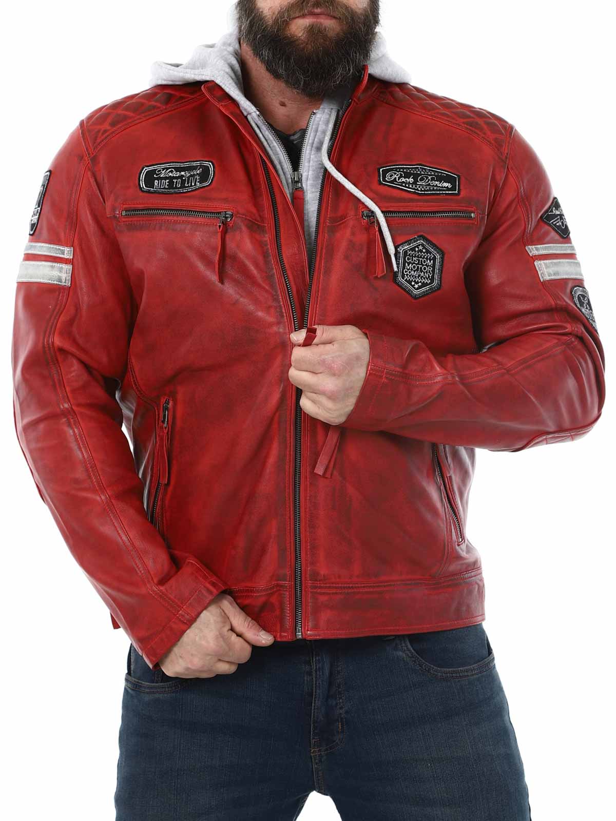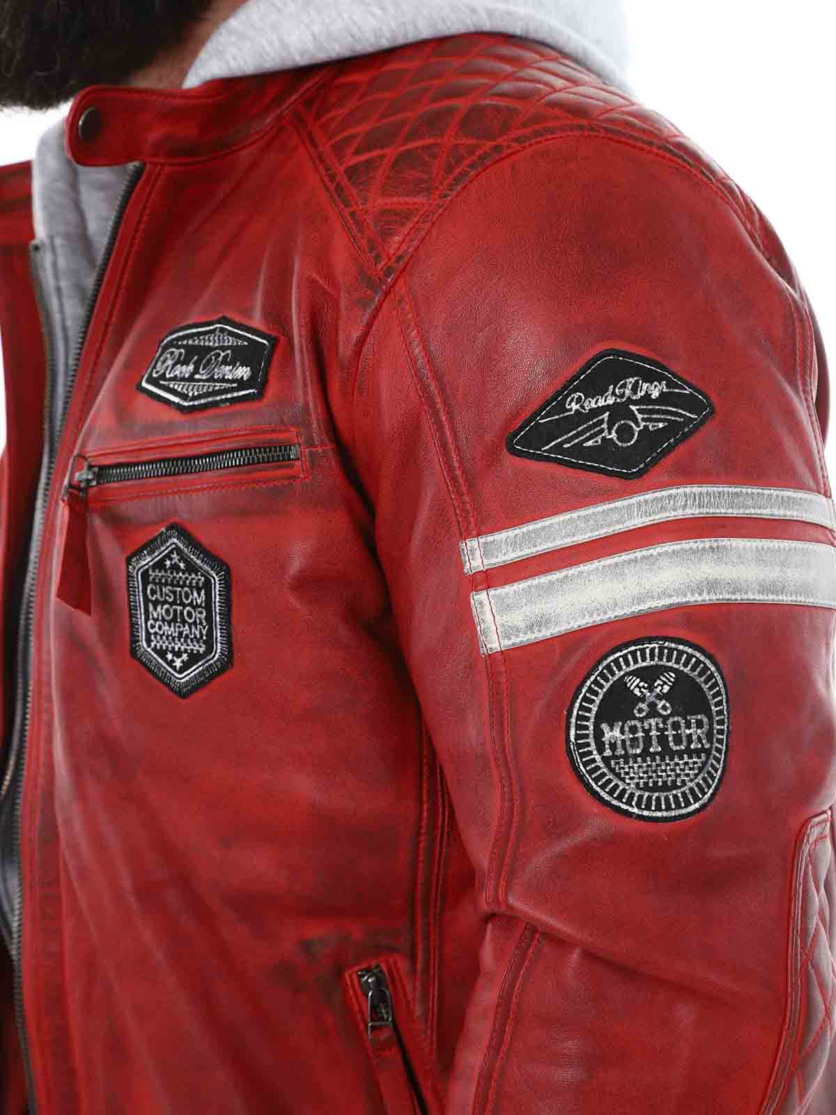 Racing-inspirerad jacka i mjukt och följsamt läder. Designad med tygpatches och avtagbar huva i sweatshirtmaterial. Fyra framfickor med dragkedja, två innerfickor och reglerbara ärmslut. Snygg jacka som endast finns hos RockDenim!