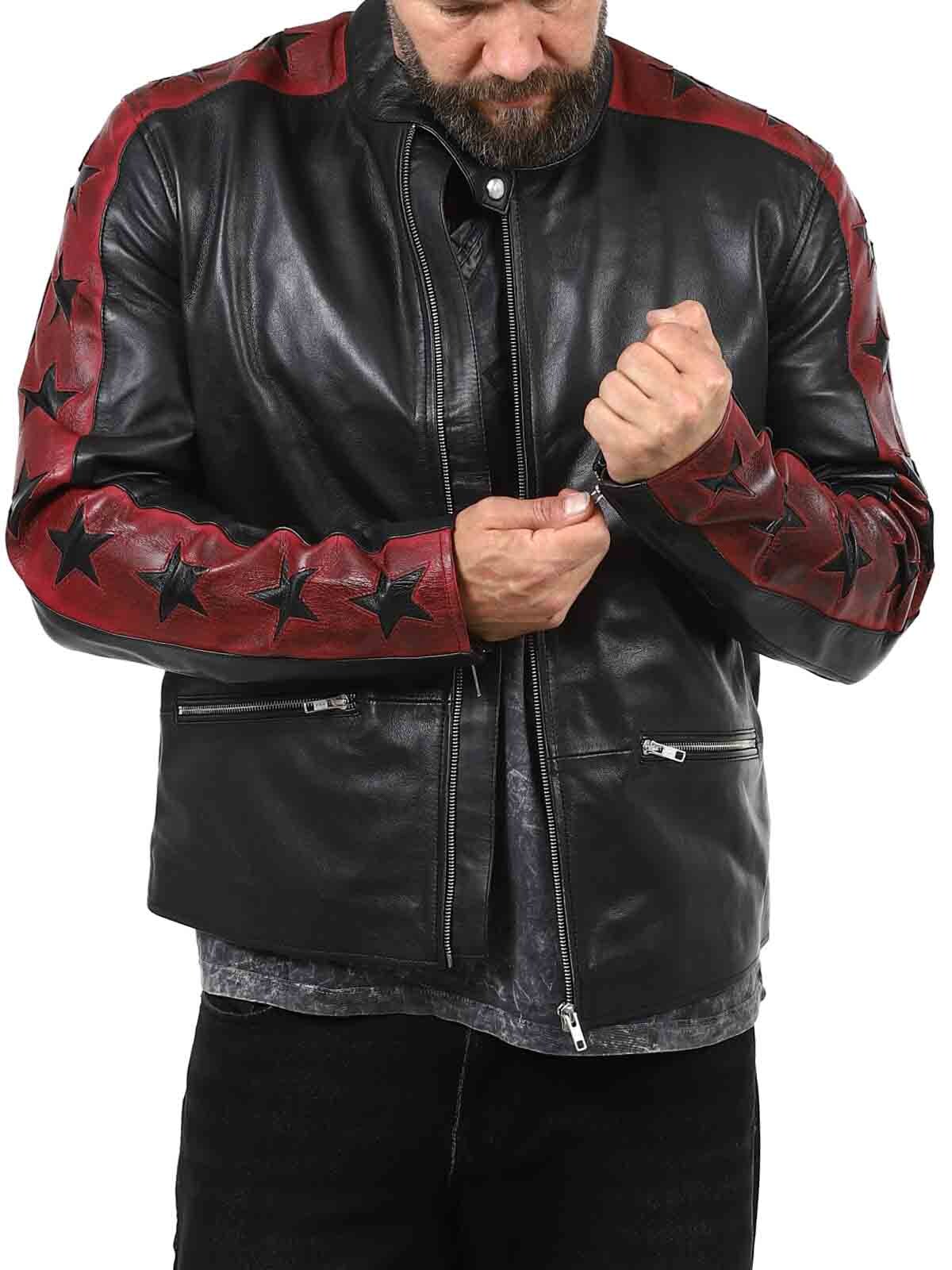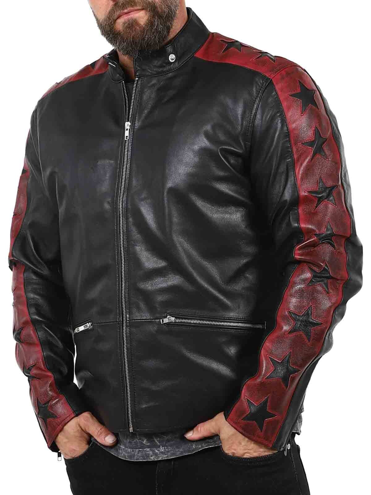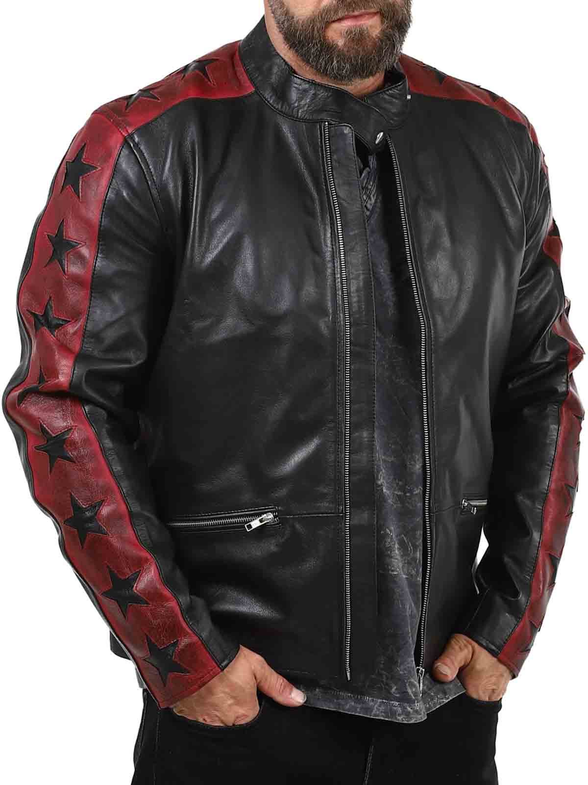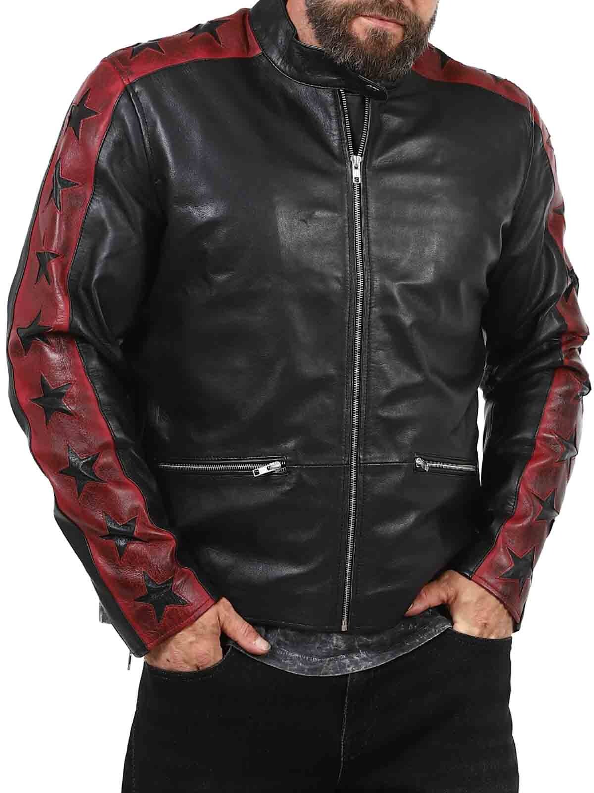 Jacka i äkta, följsamt fårskinn med en rebellisk touch. De kontrasterande ärmarna i mörkrött läder pryds av svarta stjärnor, vilket ger jackan en iögonfallande karaktär. Den har dragkedjor på fickor och ärmslut samt förstärkt ryggslut. Med en stilren ståkrage och en kroppsnära passform är detta ett perfekt val för dig som vill sticka ut med stil!