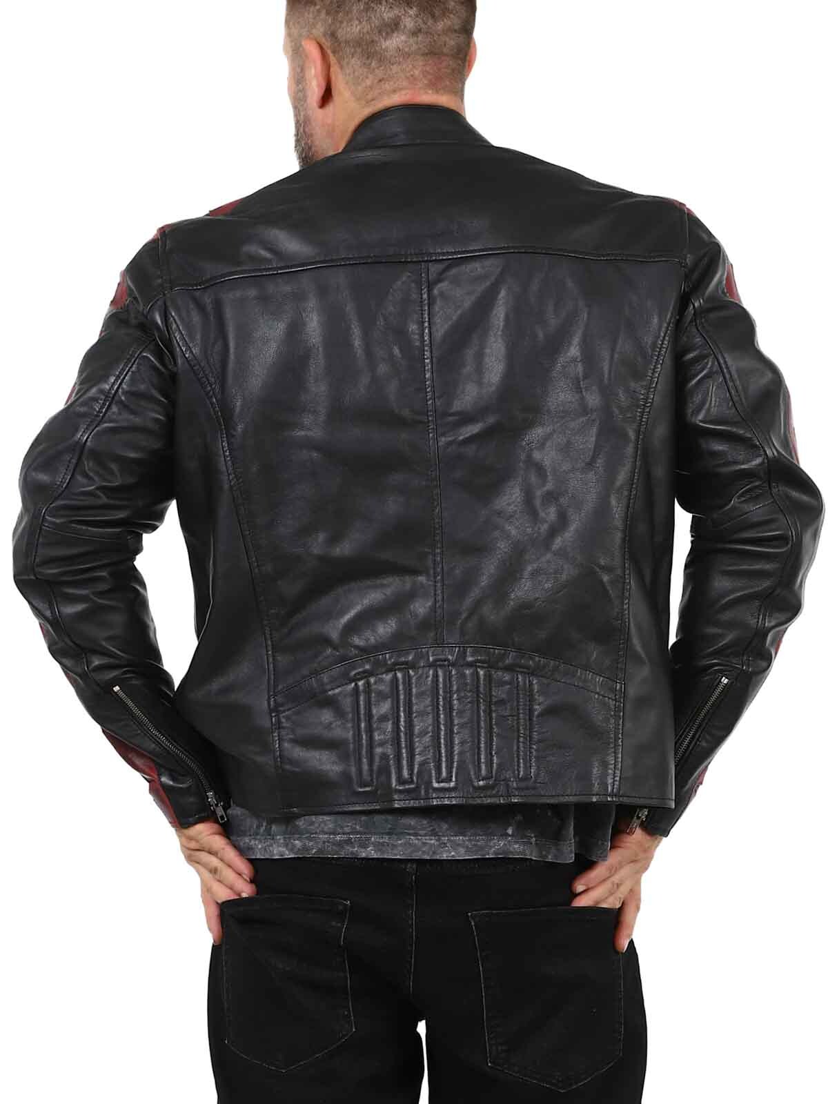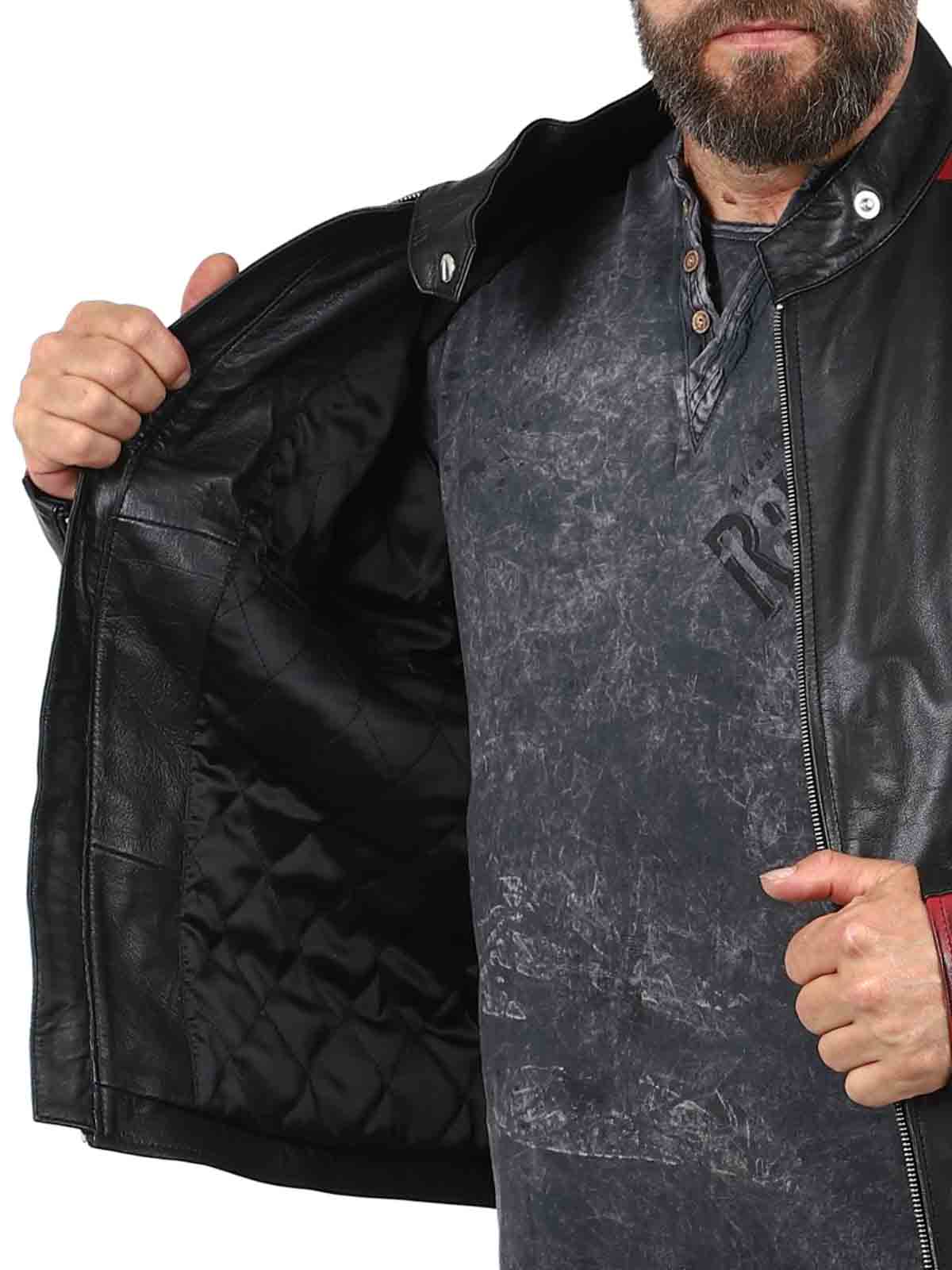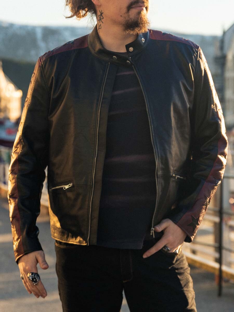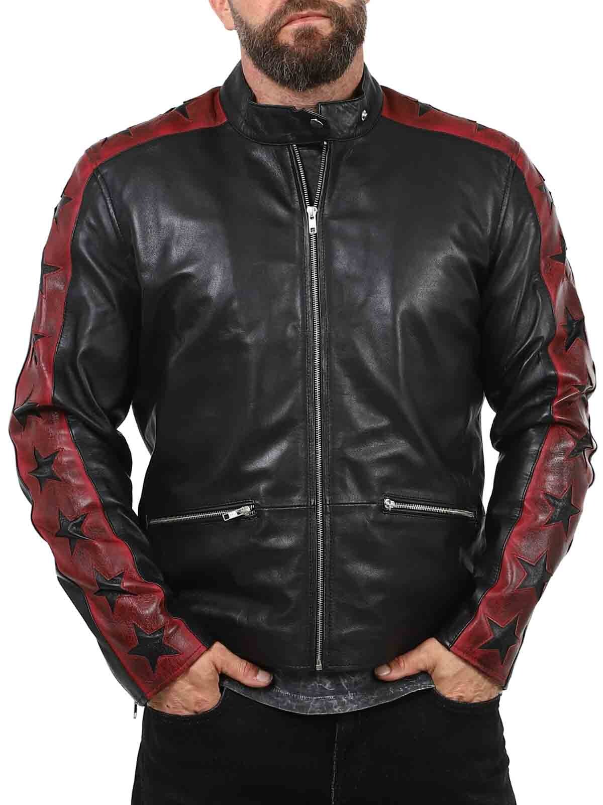 Jacka i äkta, följsamt fårskinn med en rebellisk touch. De kontrasterande ärmarna i mörkrött läder pryds av svarta stjärnor, vilket ger jackan en iögonfallande karaktär. Den har dragkedjor på fickor och ärmslut samt förstärkt ryggslut. Med en stilren ståkrage och en kroppsnära passform är detta ett perfekt val för dig som vill sticka ut med stil!