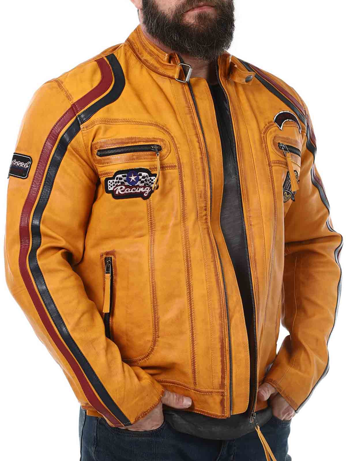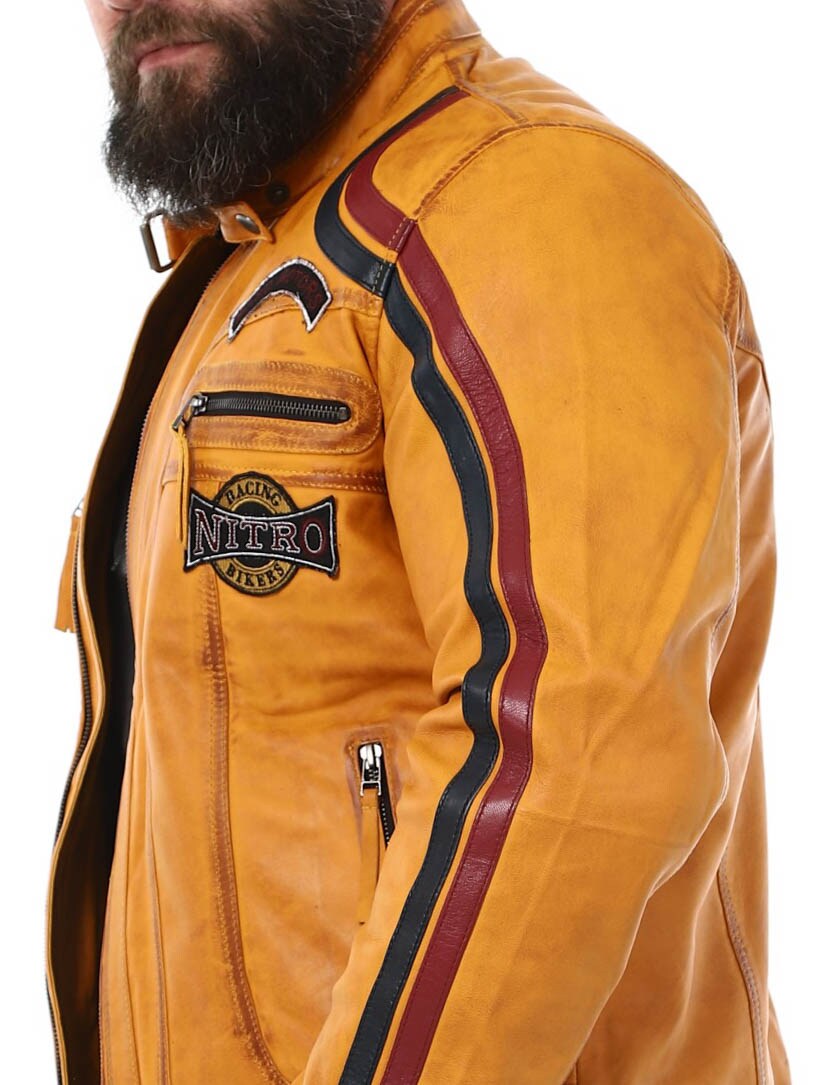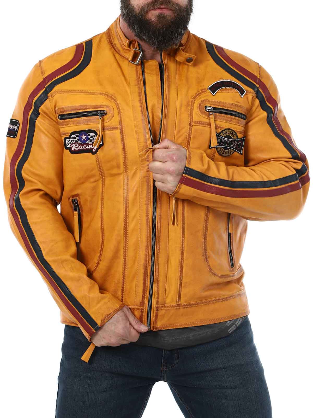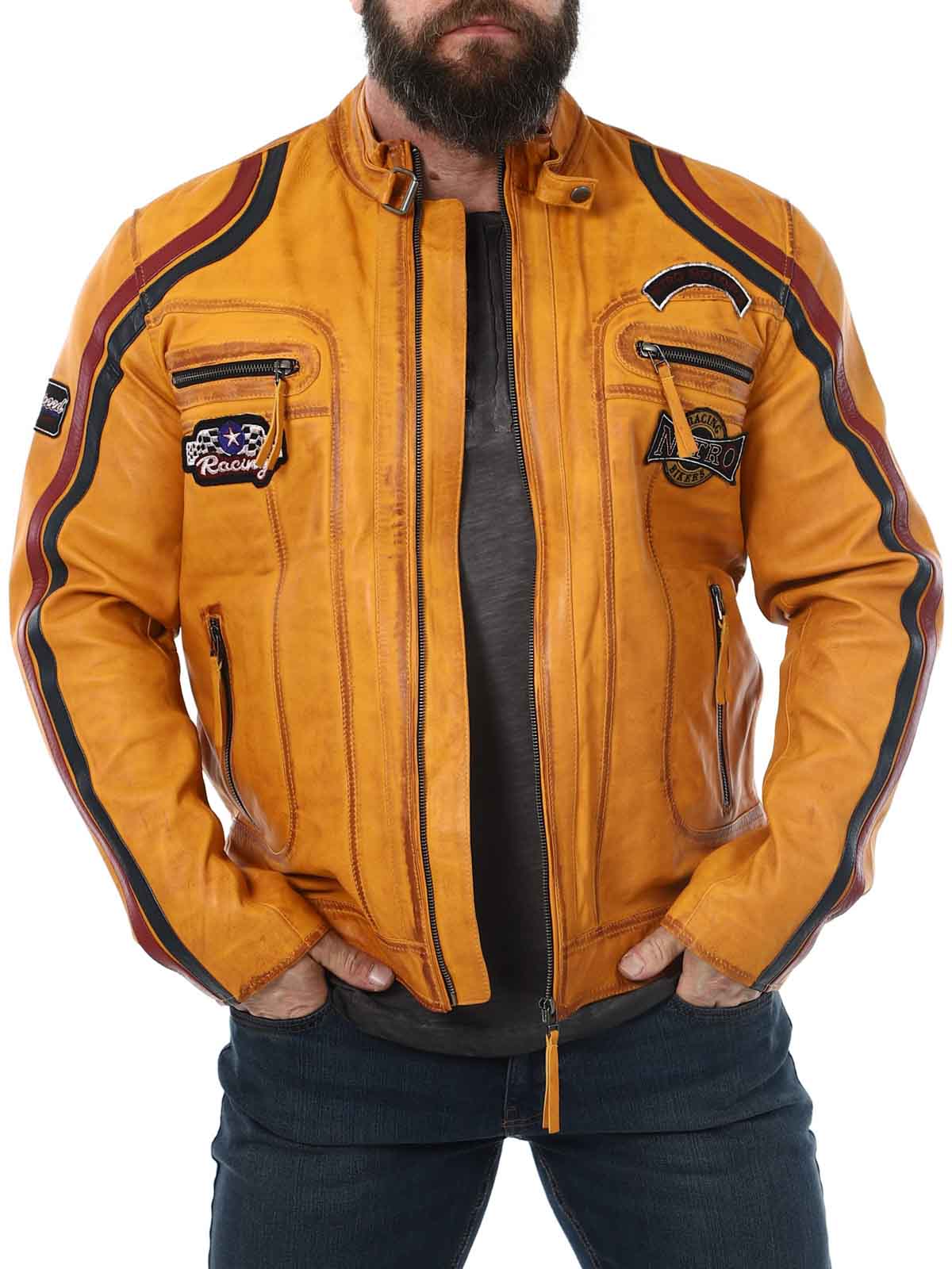 Jacka med tygpatches och stripes som ger en snygg racing-look. Tillverkad i mjukt och följsamt läder. Den har fyra framfickor med dragkedja, två innerfickor och reglerbara ärmslut. Fräck jacka som endast finns hos RockDenim!