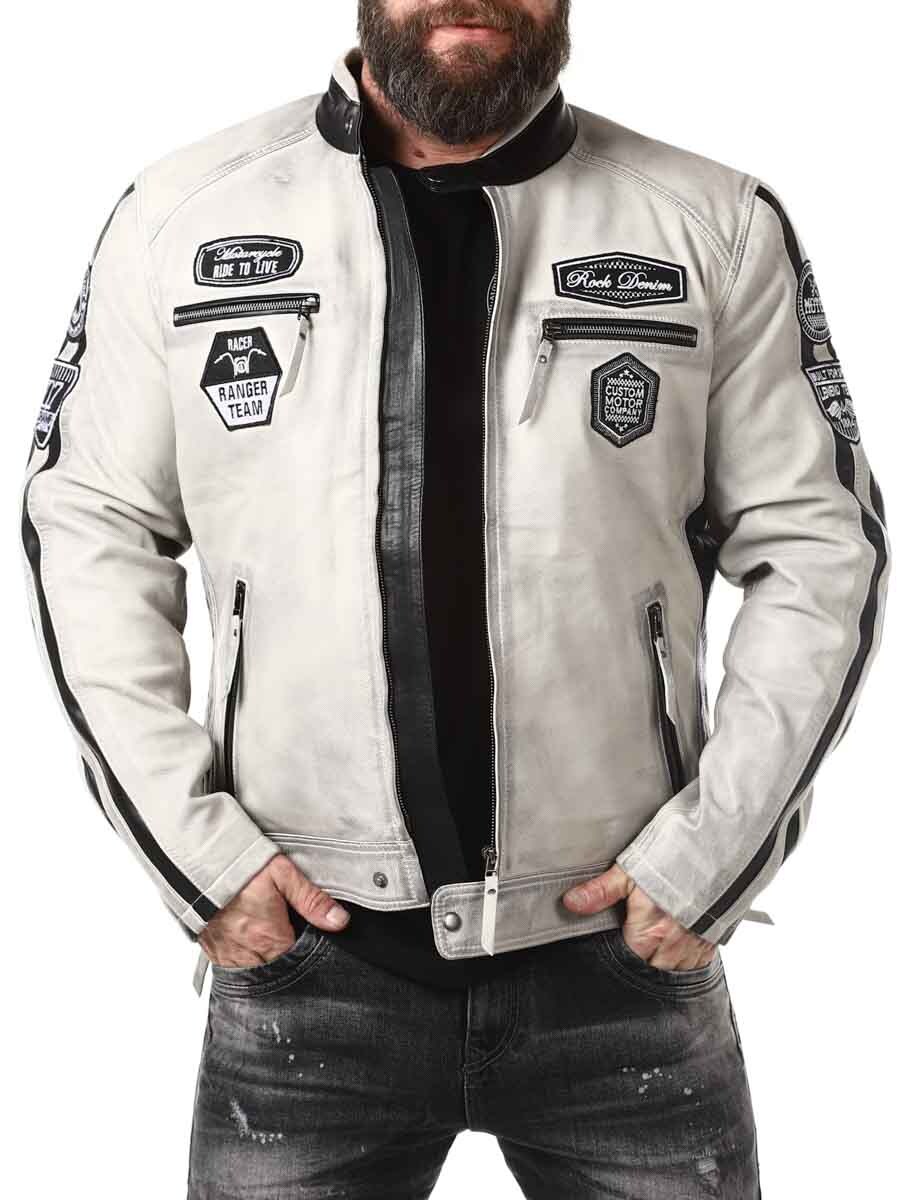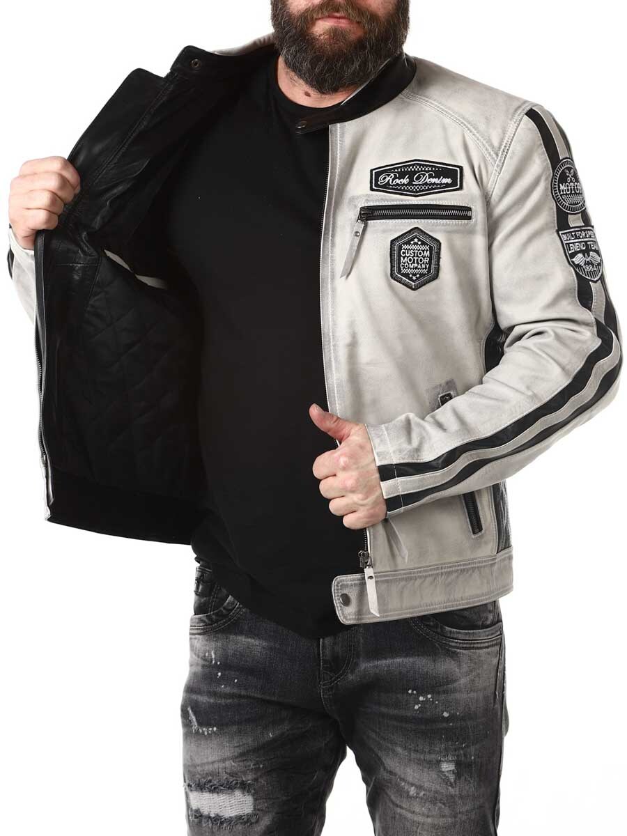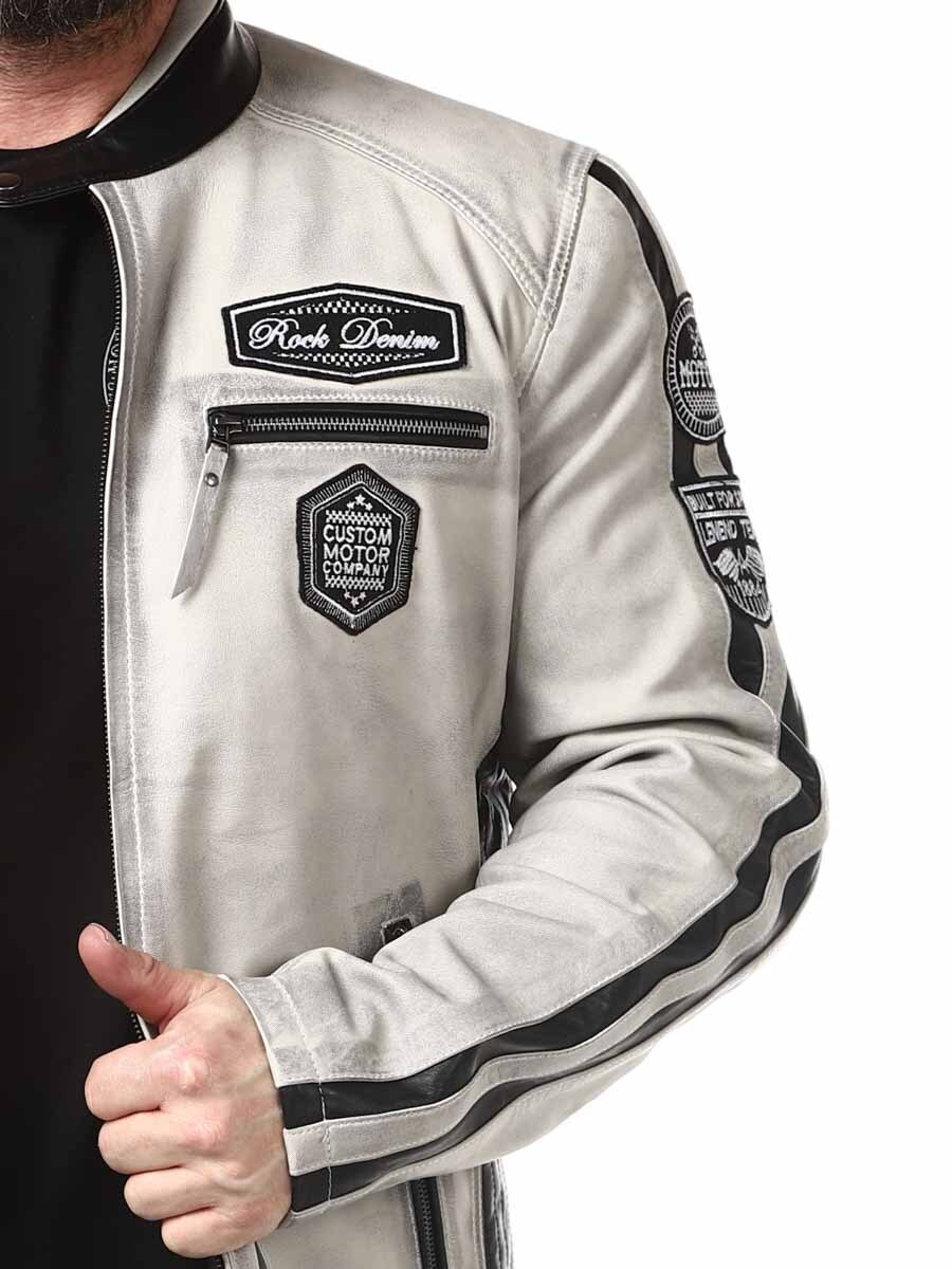 Bekväm skinnjacka i tuff design med patches och svarta ränder. Den stängs med en rejäl dragkedja och kan knäppas med en tryckknapp vid halsen och vid linningen nertill. Fyra fickor med blixtlås sitter fram på jackan och den har även två fickor i det kviltade fodret. Ärmsluten kan vidgas!