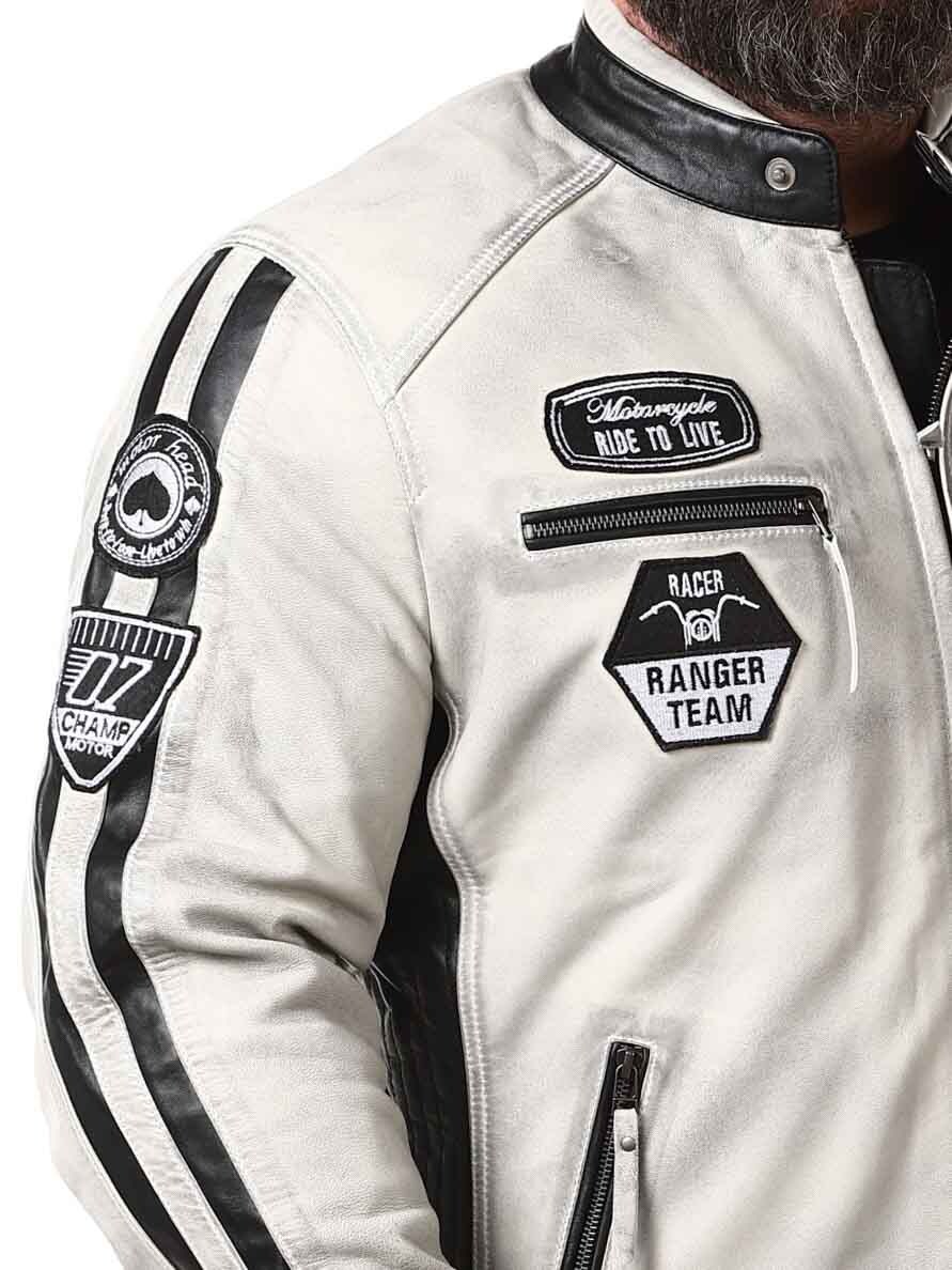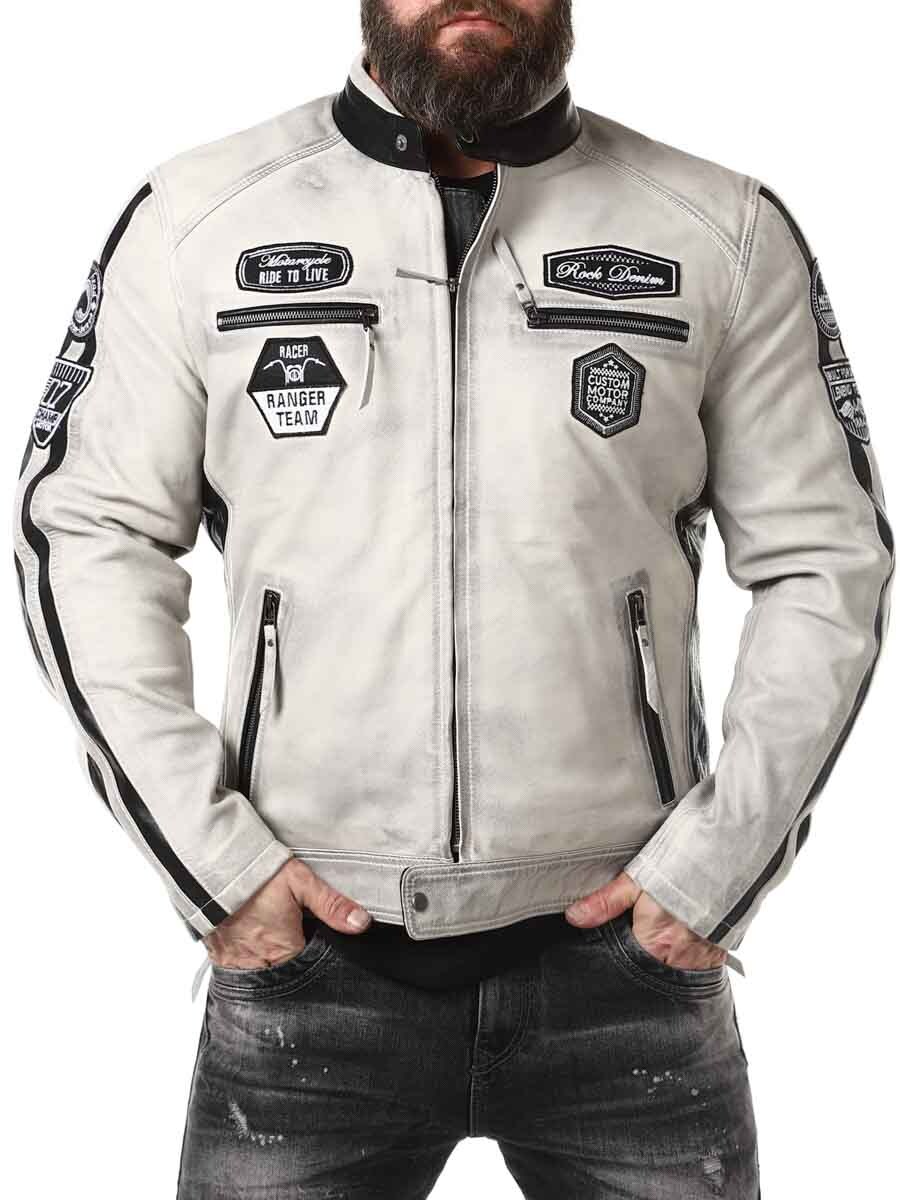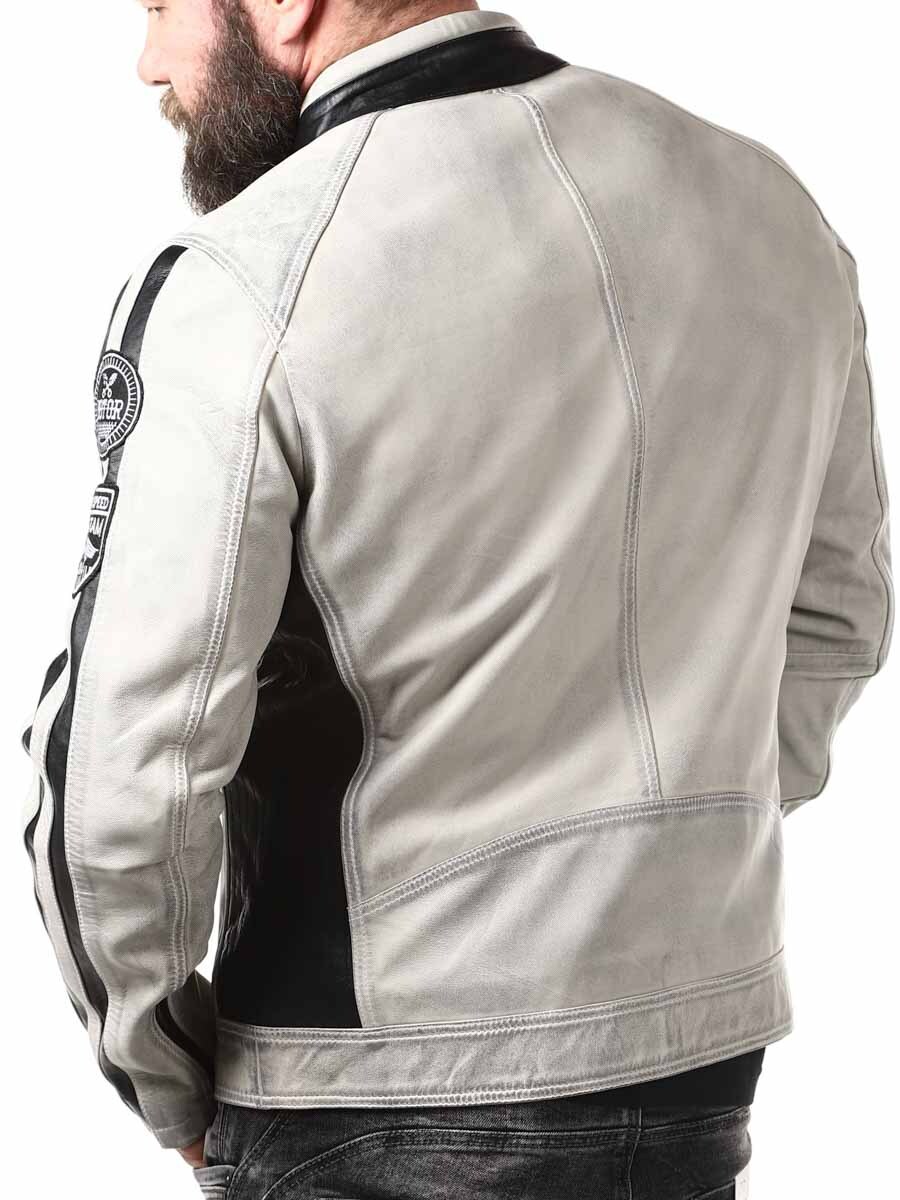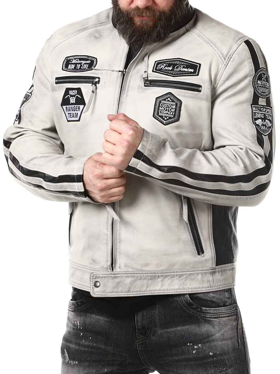 Bekväm skinnjacka i tuff design med patches och svarta ränder. Den stängs med en rejäl dragkedja och kan knäppas med en tryckknapp vid halsen och vid linningen nertill. Fyra fickor med blixtlås sitter fram på jackan och den har även två fickor i det kviltade fodret. Ärmsluten kan vidgas!