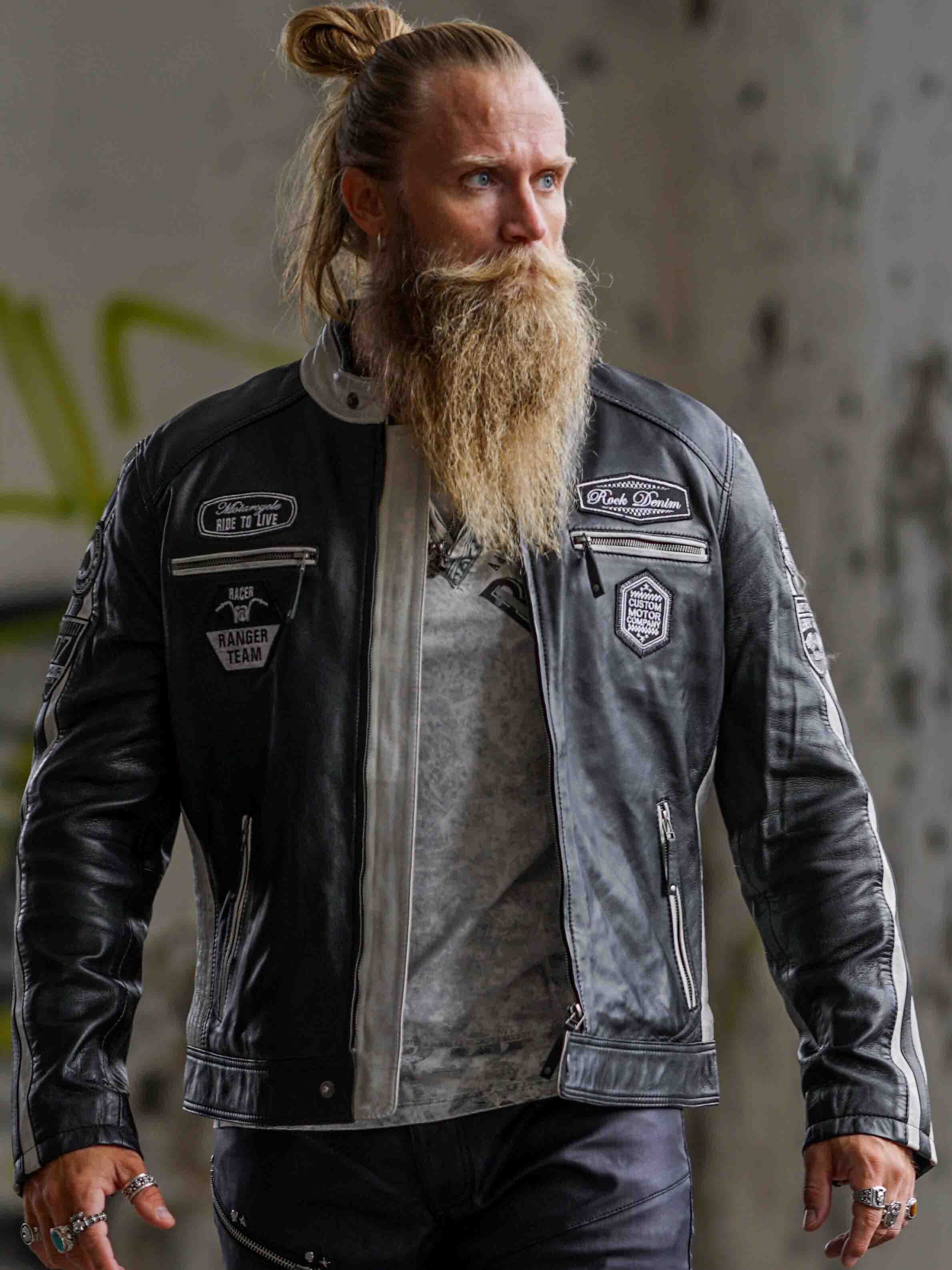 Bekväm skinnjacka i tuff design med patches och vita ränder. Den stängs med en rejäl dragkedja och kan knäppas med en tryckknapp vid halsen och vid linningen nertill. Fyra fickor med blixtlås sitter fram på jackan och den har även två fickor i det kviltade fodret. Ärmsluten kan vidgas!