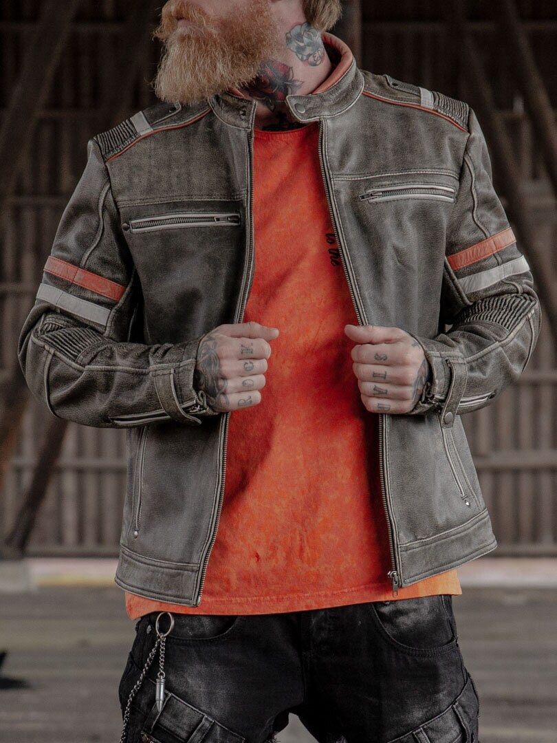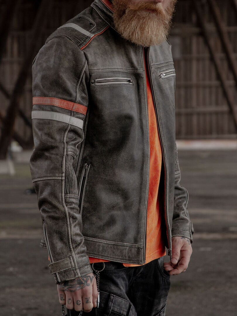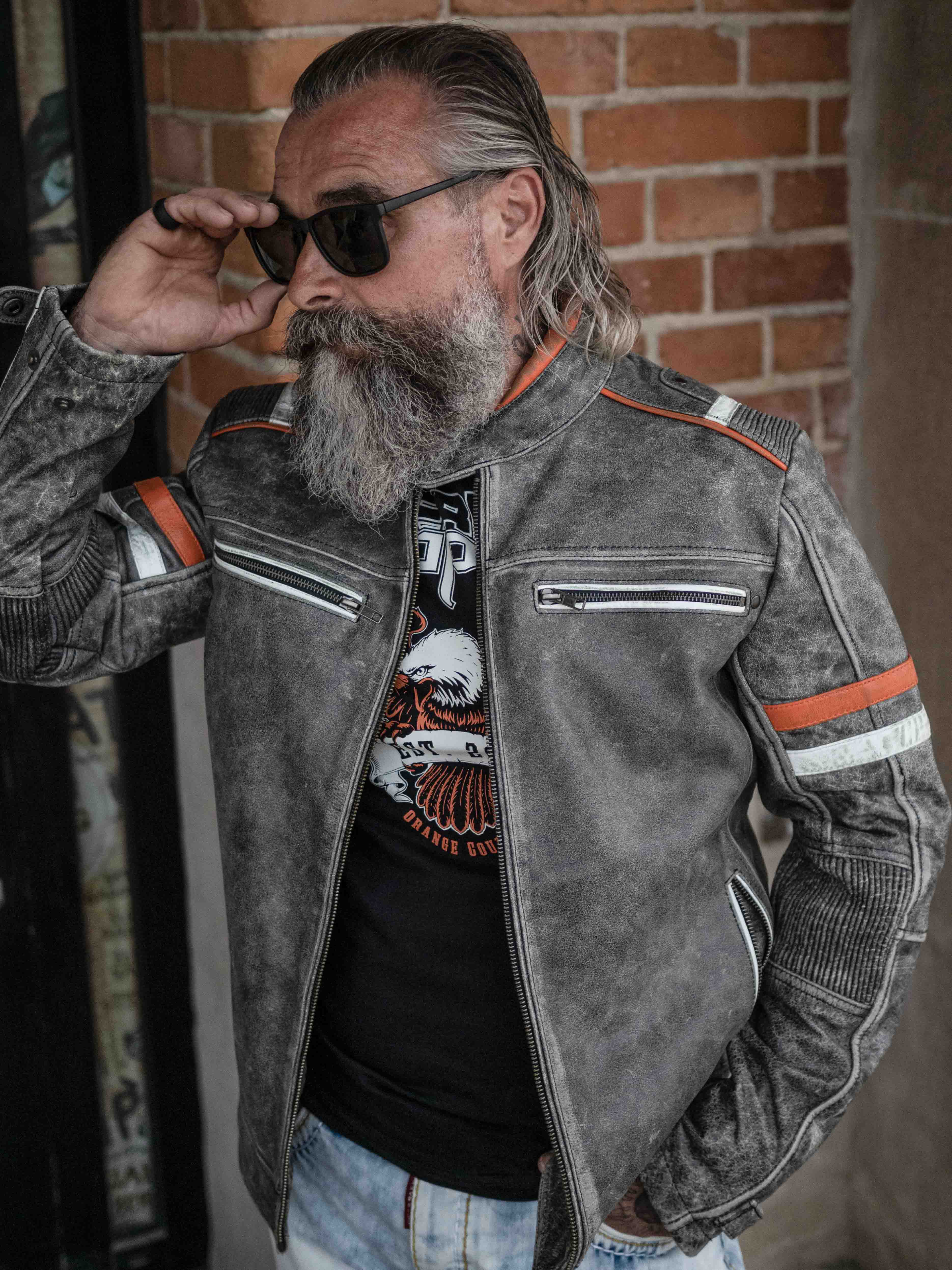 Jacka i vintage look med stripes och detaljer i ljusgrått och orange. Vadderad nederdel på baksidan, reglerbara ärmslut, fyra stängbara framfickor och två öppna innerfickor. Denna unika skinnjacka är tillverkad i kvalitetsläder och designad av Rockdenim med inspiration från motorsporten.
