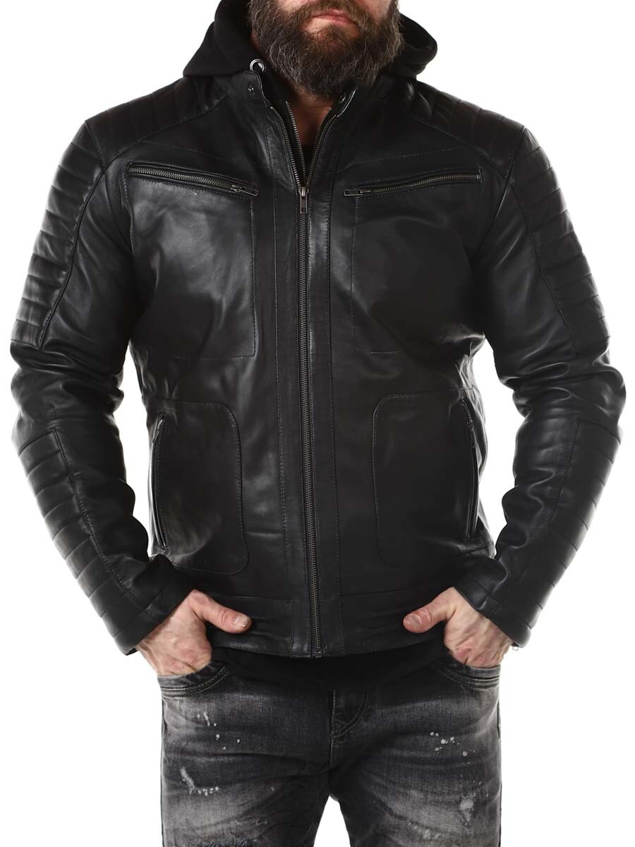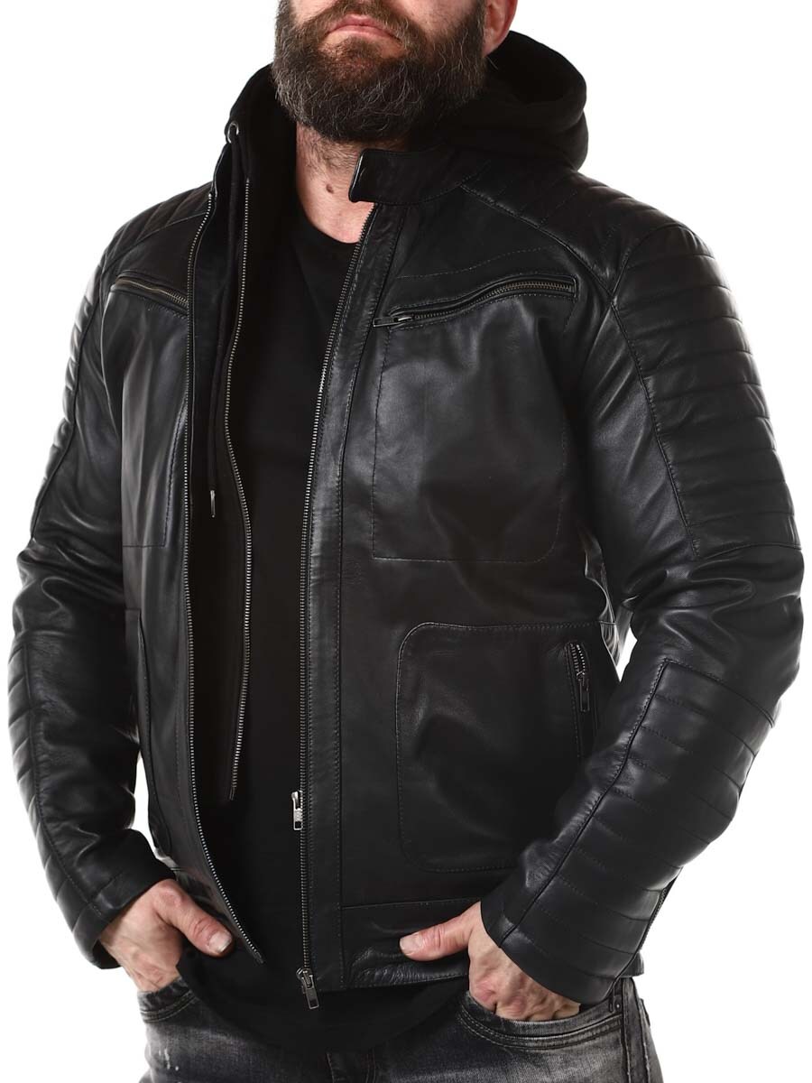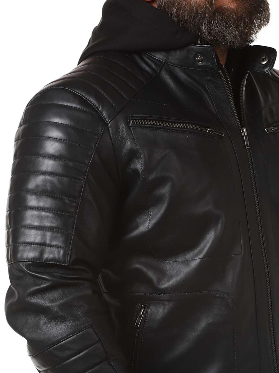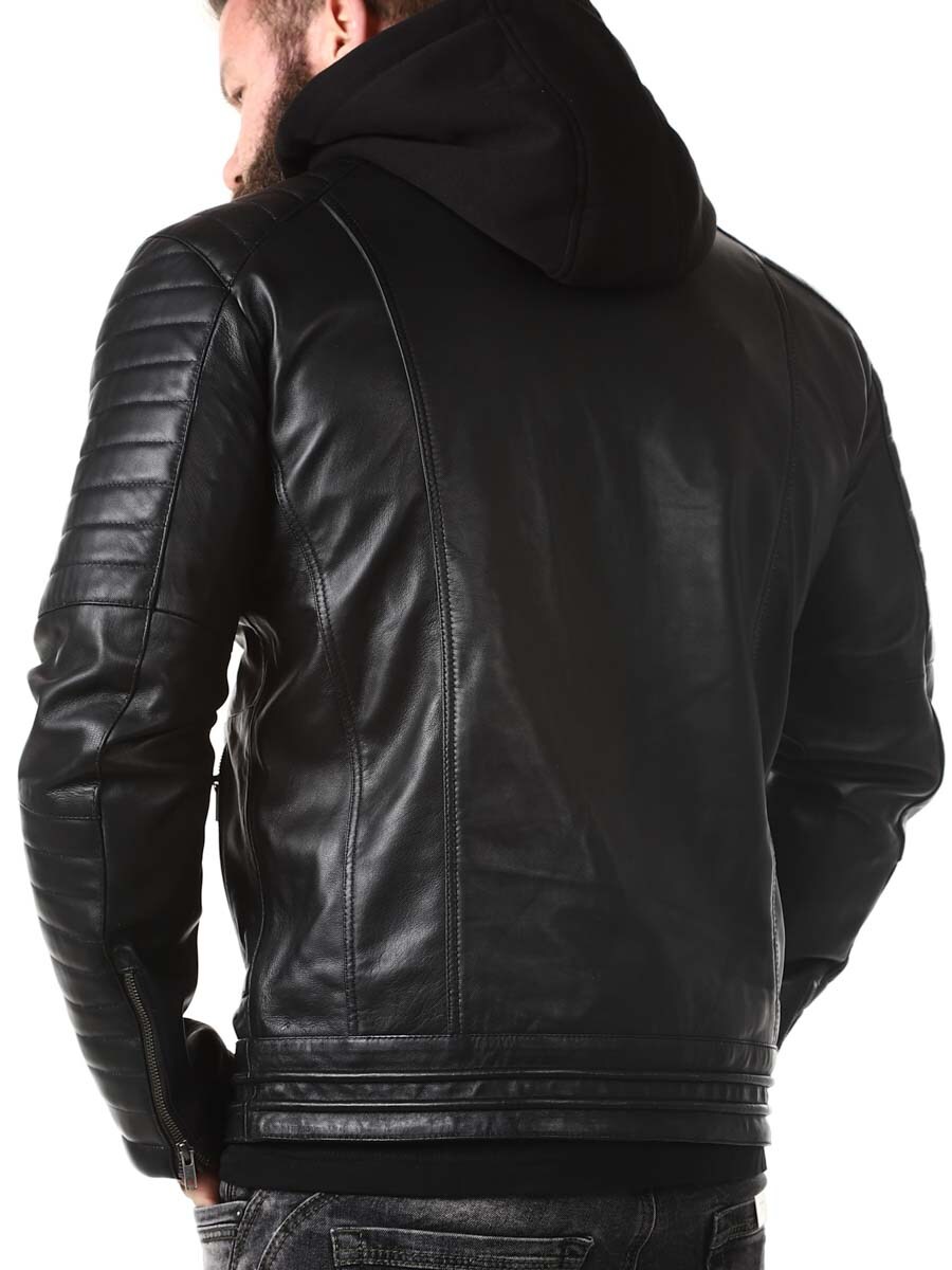 Svart jacka i äkta läder. Den har avtagbar huva i mjukt sweatshirtmaterial som är synlig längs hela jacköppningen. Vadderat parti på ärmar och fyra stängbara framfickor, samt två innerfickor. Kraftigt material gör att den hänger snyggt på kroppen.