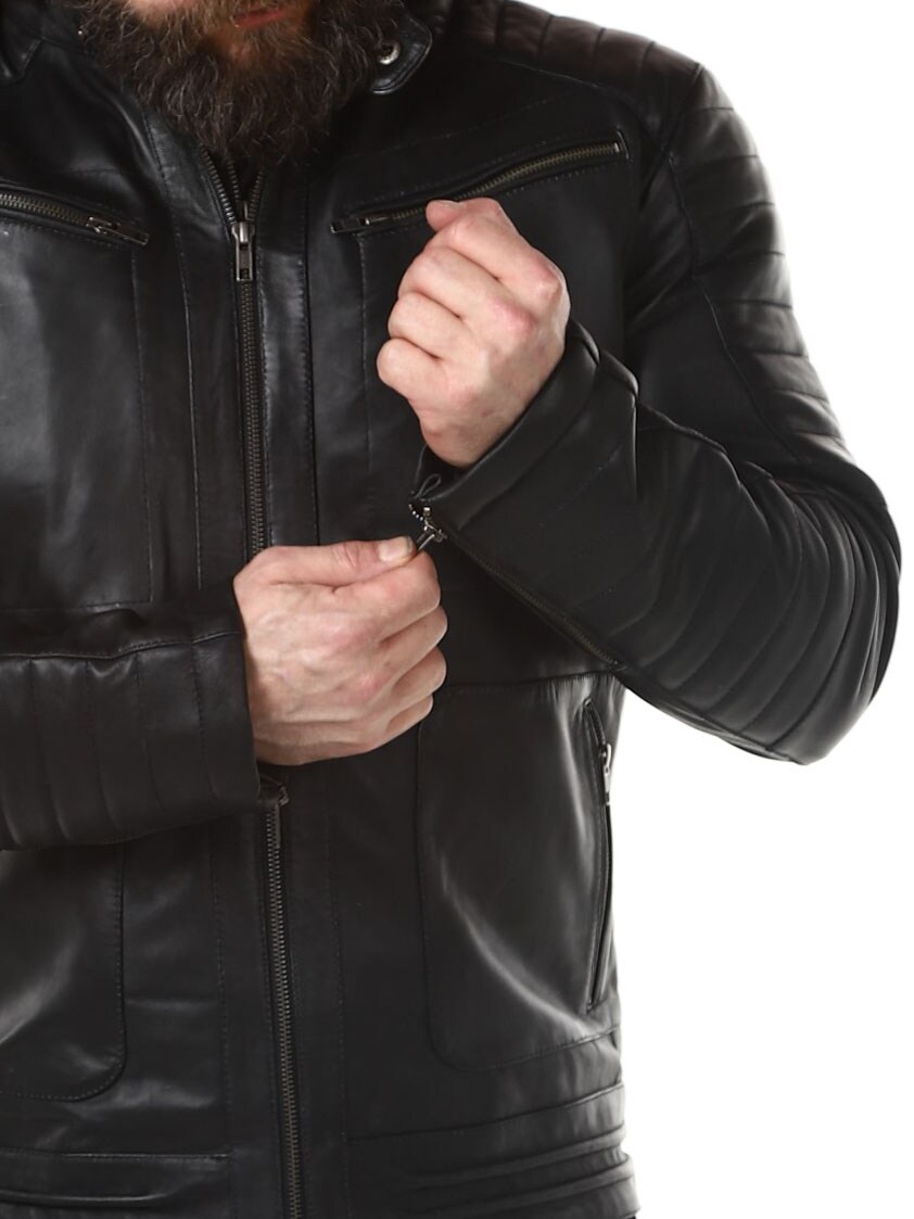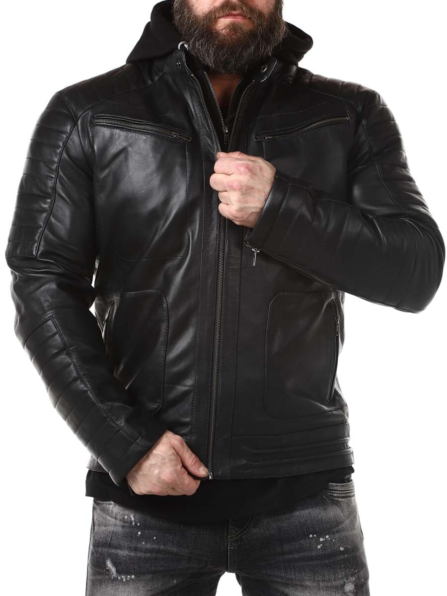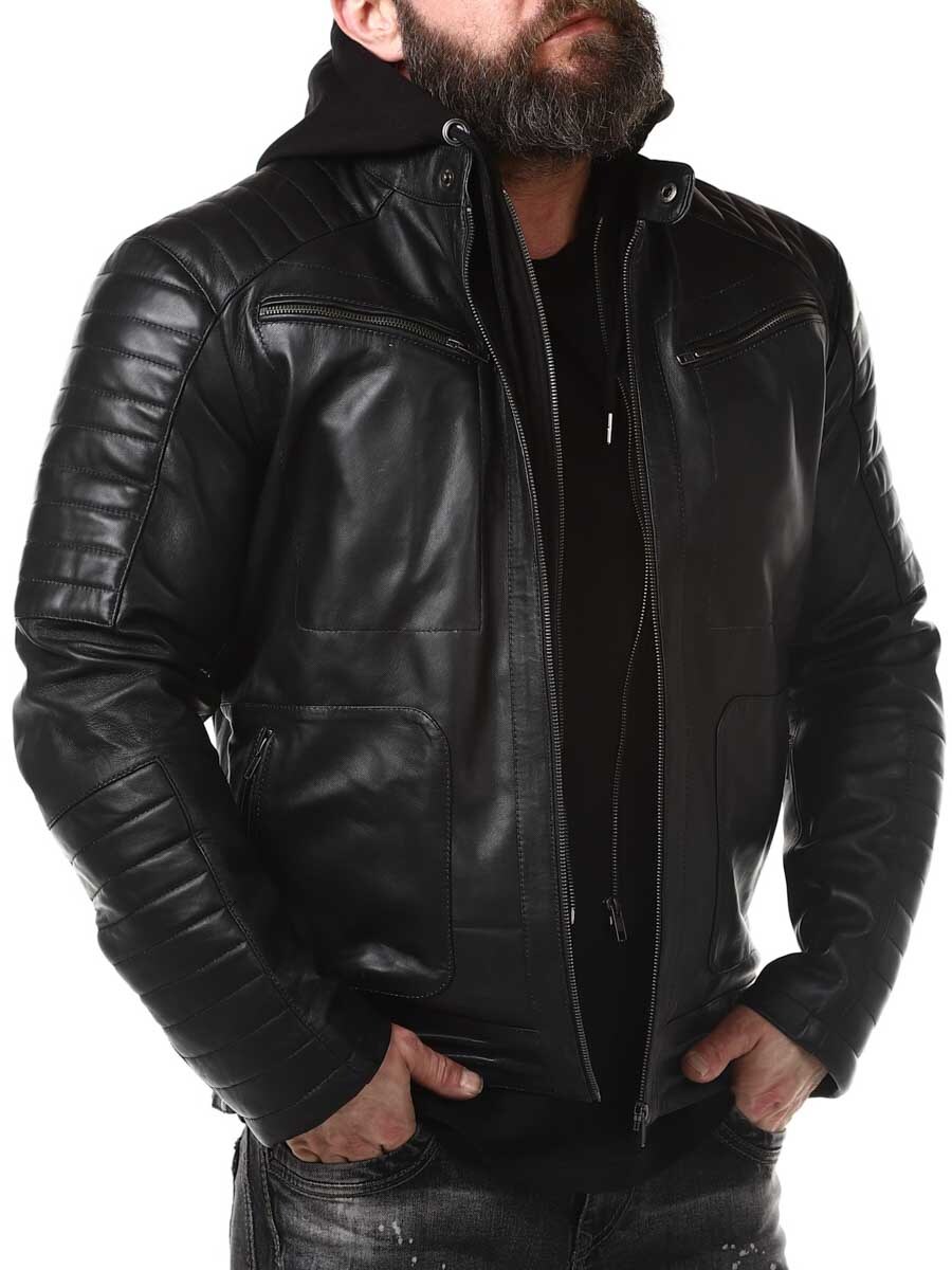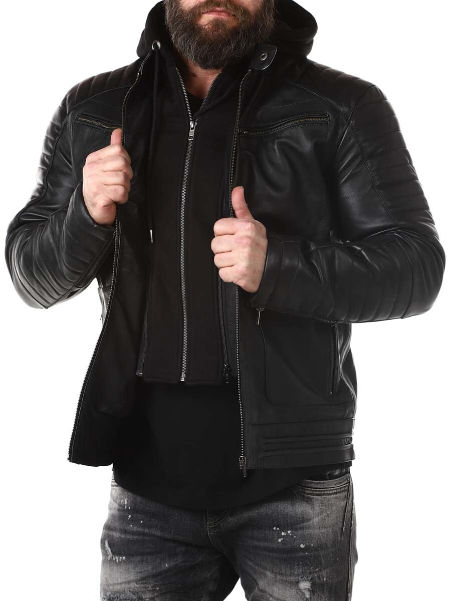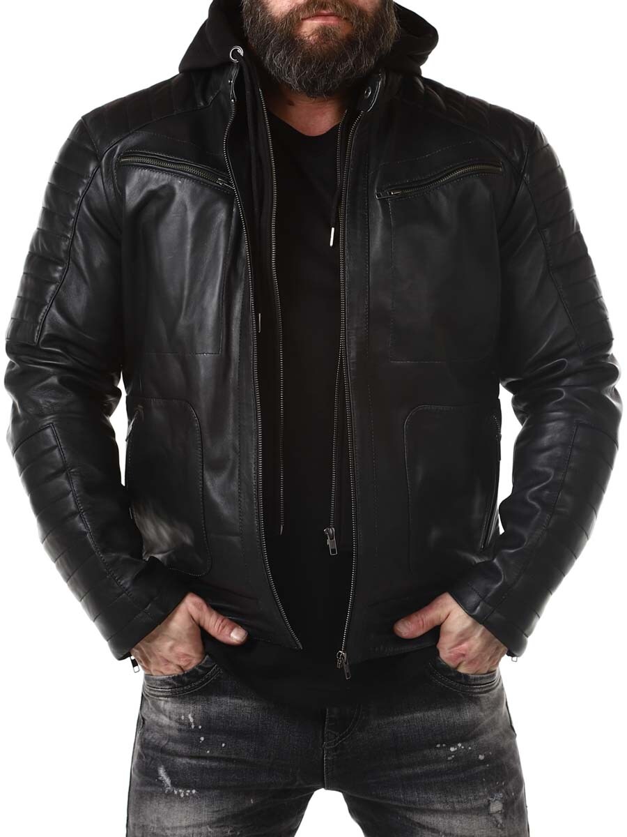 Svart jacka i äkta läder. Den har avtagbar huva i mjukt sweatshirtmaterial som är synlig längs hela jacköppningen. Vadderat parti på ärmar och fyra stängbara framfickor, samt två innerfickor. Kraftigt material gör att den hänger snyggt på kroppen.