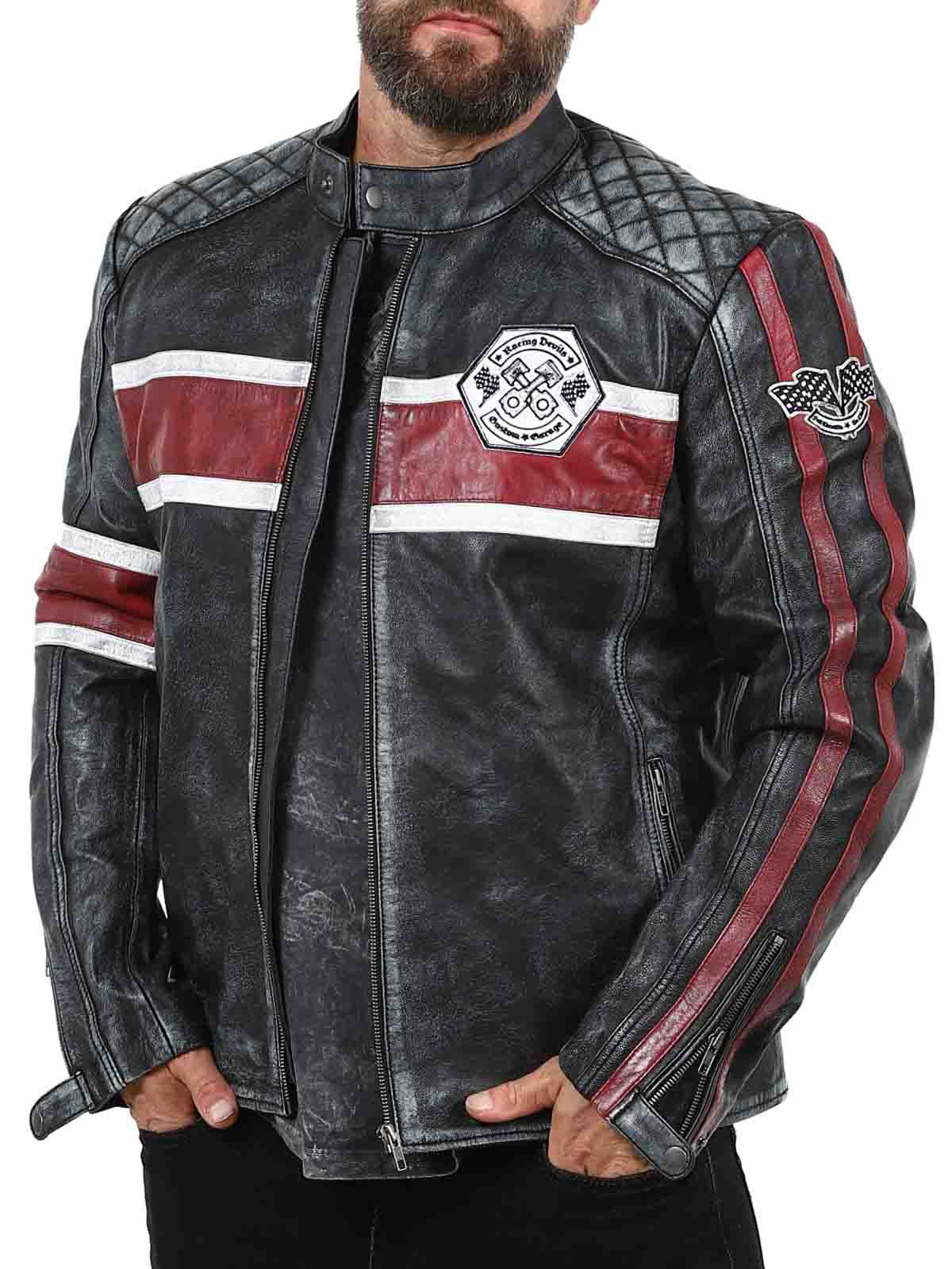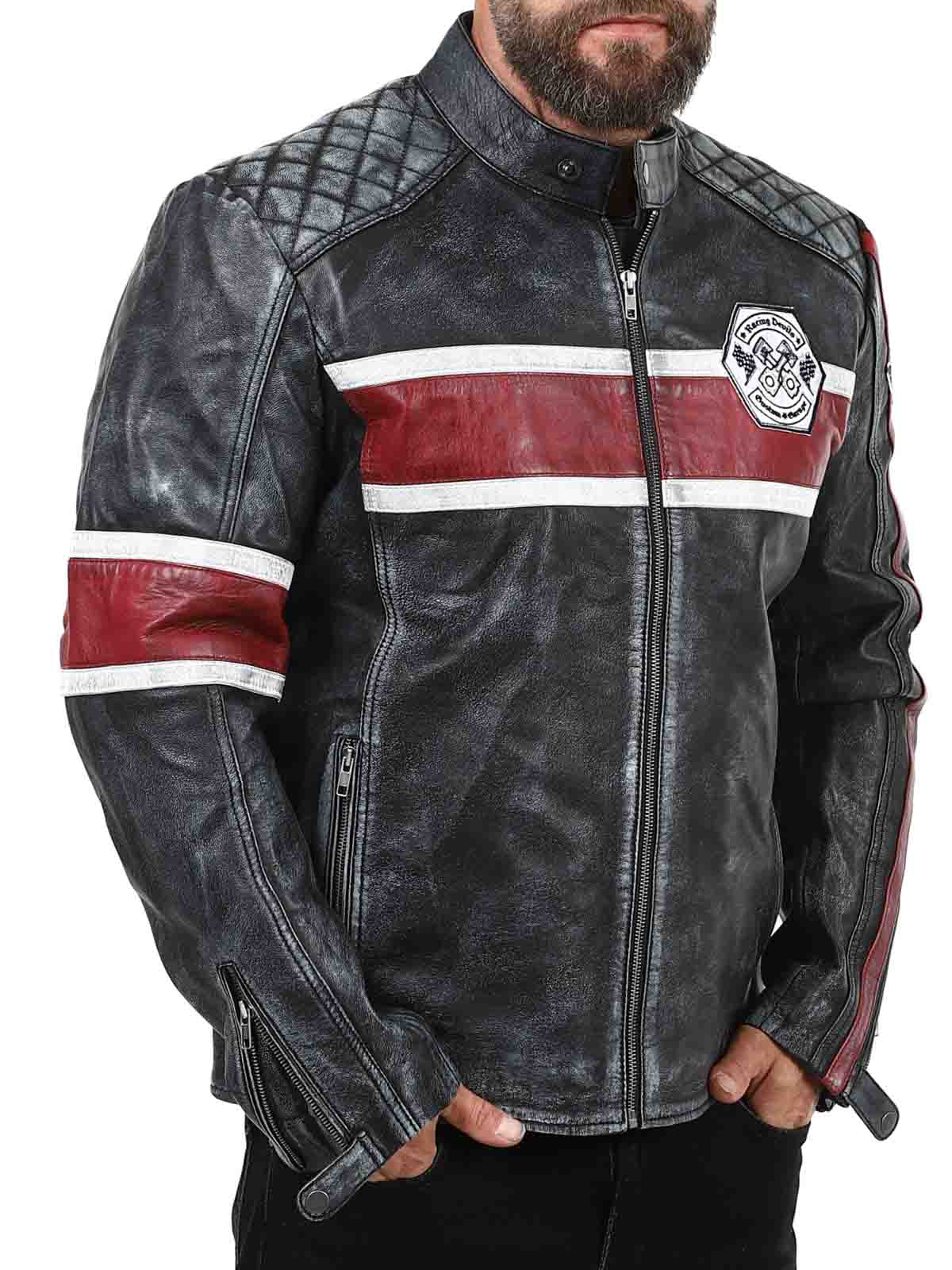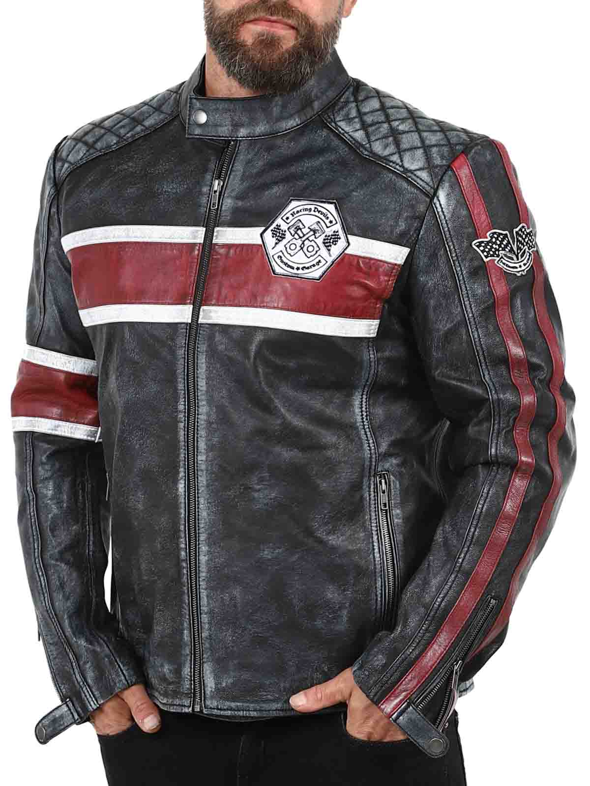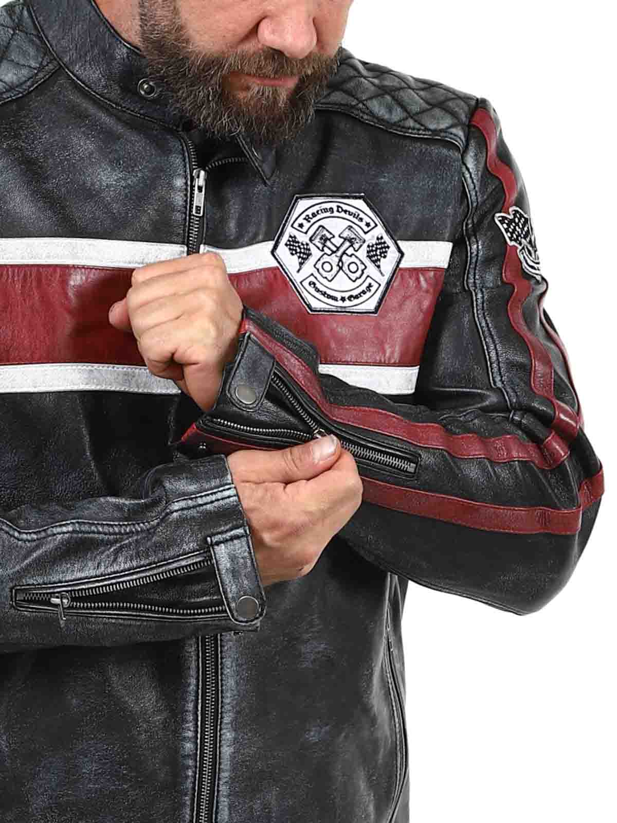Den här jackan i äkta fårskinn har en rå och vintageinspirerad look som fångar ögat. De distinkta ränderna i rött och vitt ger en sportig känsla, medan den slitna finishen förstärker jackans karaktär. Med detaljer som tygpatches, robusta dragkedjor och förstärkta partier är detta den perfekta jackan för dig som vill kombinera klassisk biker-stil med en cool twist!