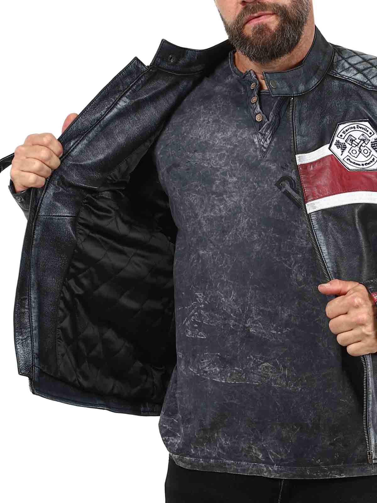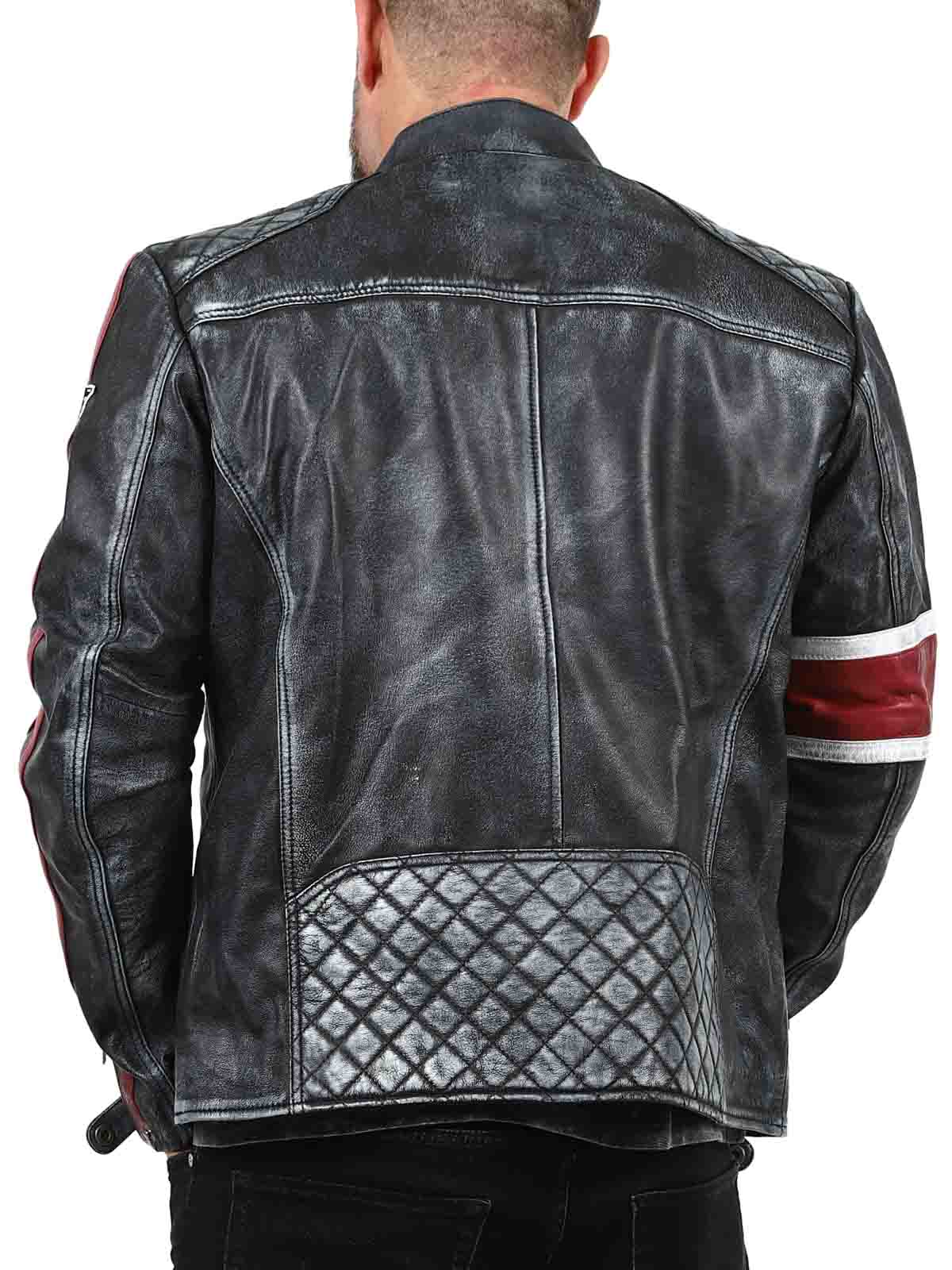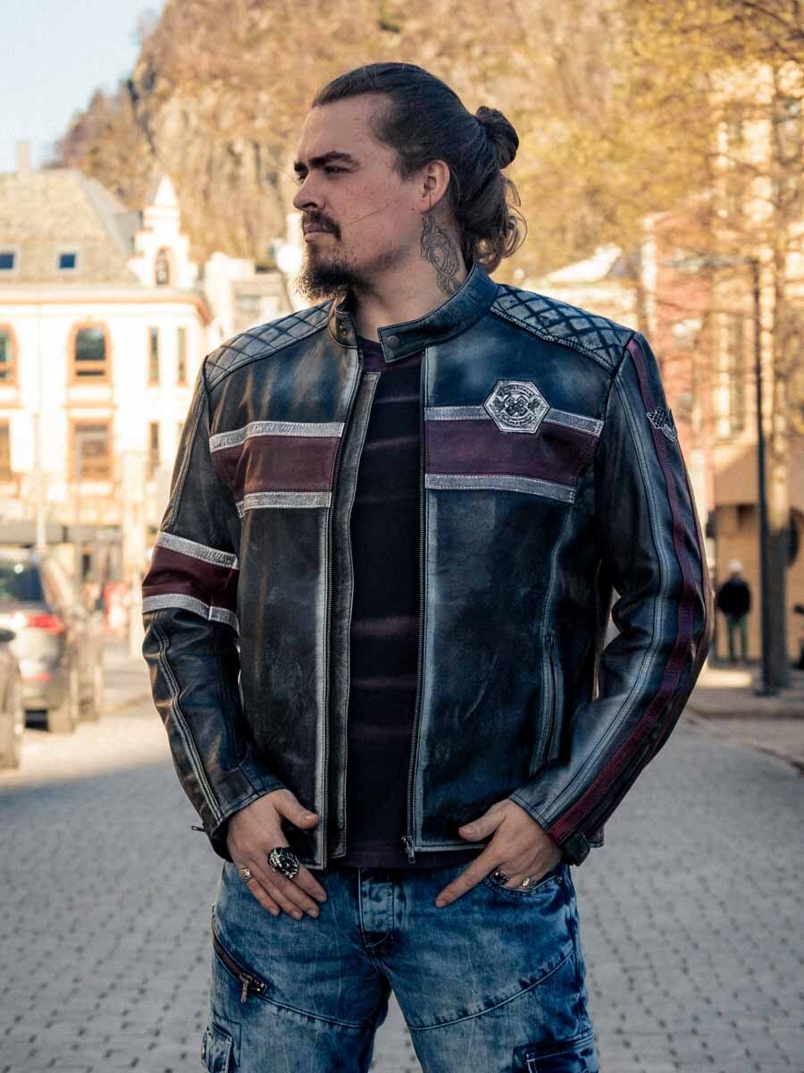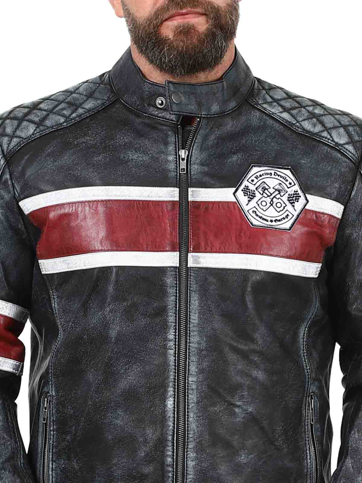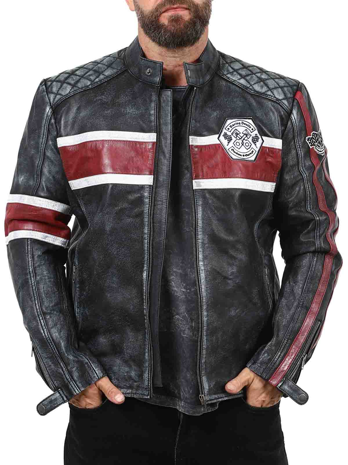 Den här jackan i äkta fårskinn har en rå och vintageinspirerad look som fångar ögat. De distinkta ränderna i rött och vitt ger en sportig känsla, medan den slitna finishen förstärker jackans karaktär. Med detaljer som tygpatches, robusta dragkedjor och förstärkta partier är detta den perfekta jackan för dig som vill kombinera klassisk biker-stil med en cool twist!