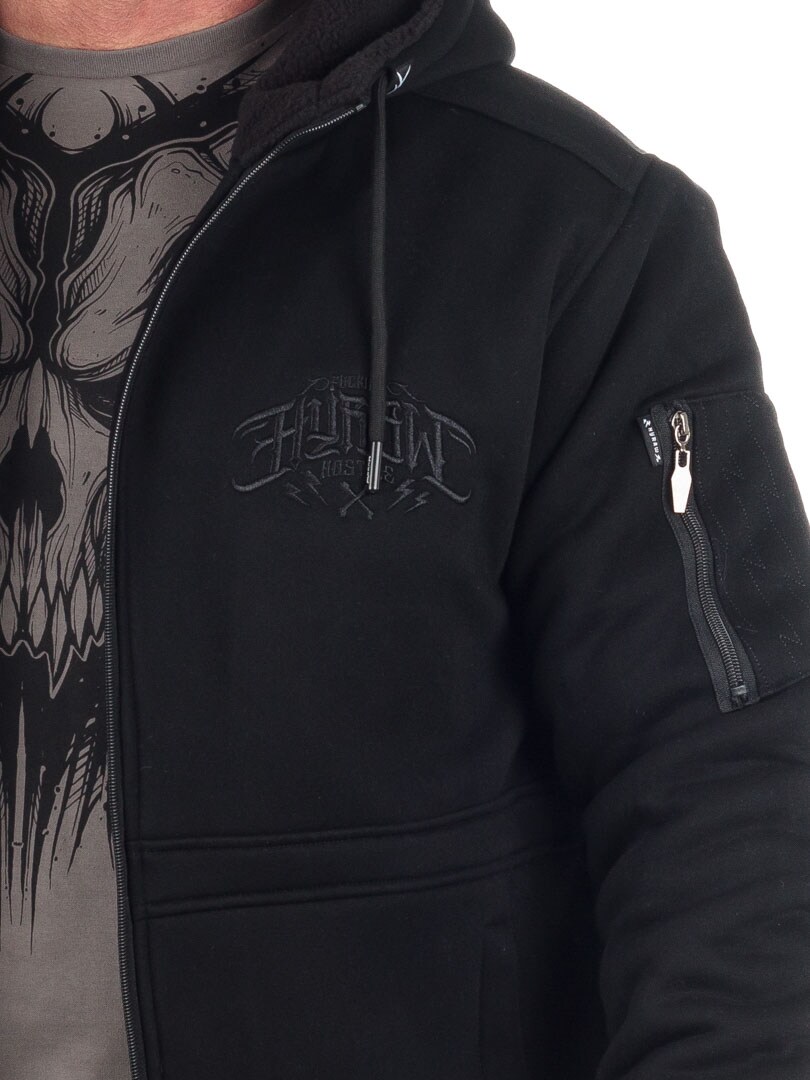 Svart jacka med värmande teddyfoder på insidan. Den är utrustad med två framfickor och en bröstficka med dragkedja, en påsydd ärmficka med dragkedja samt en praktisk innerficka. Jackan är designad med skräddat tryck och logga på både framsidan, baksidan och ena ärmen. Perfekt för dig som vill ha en värmande jacka med genomtänkta detaljer.
