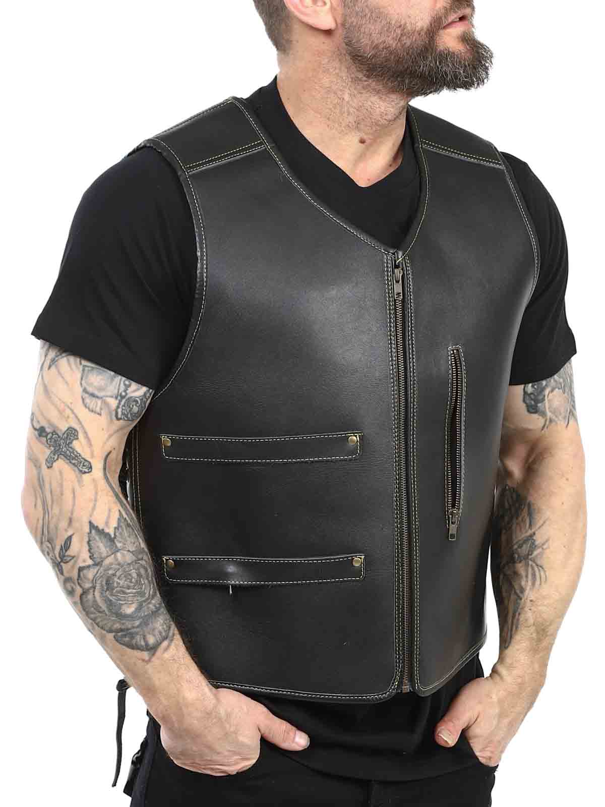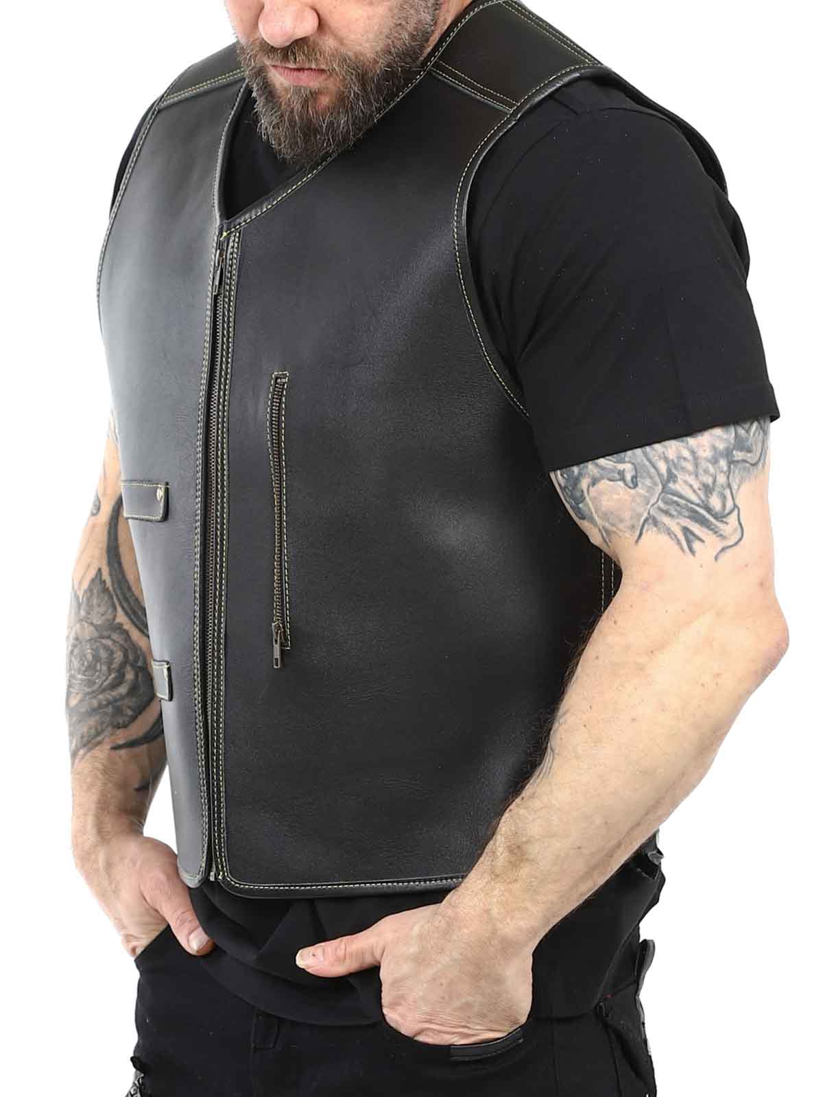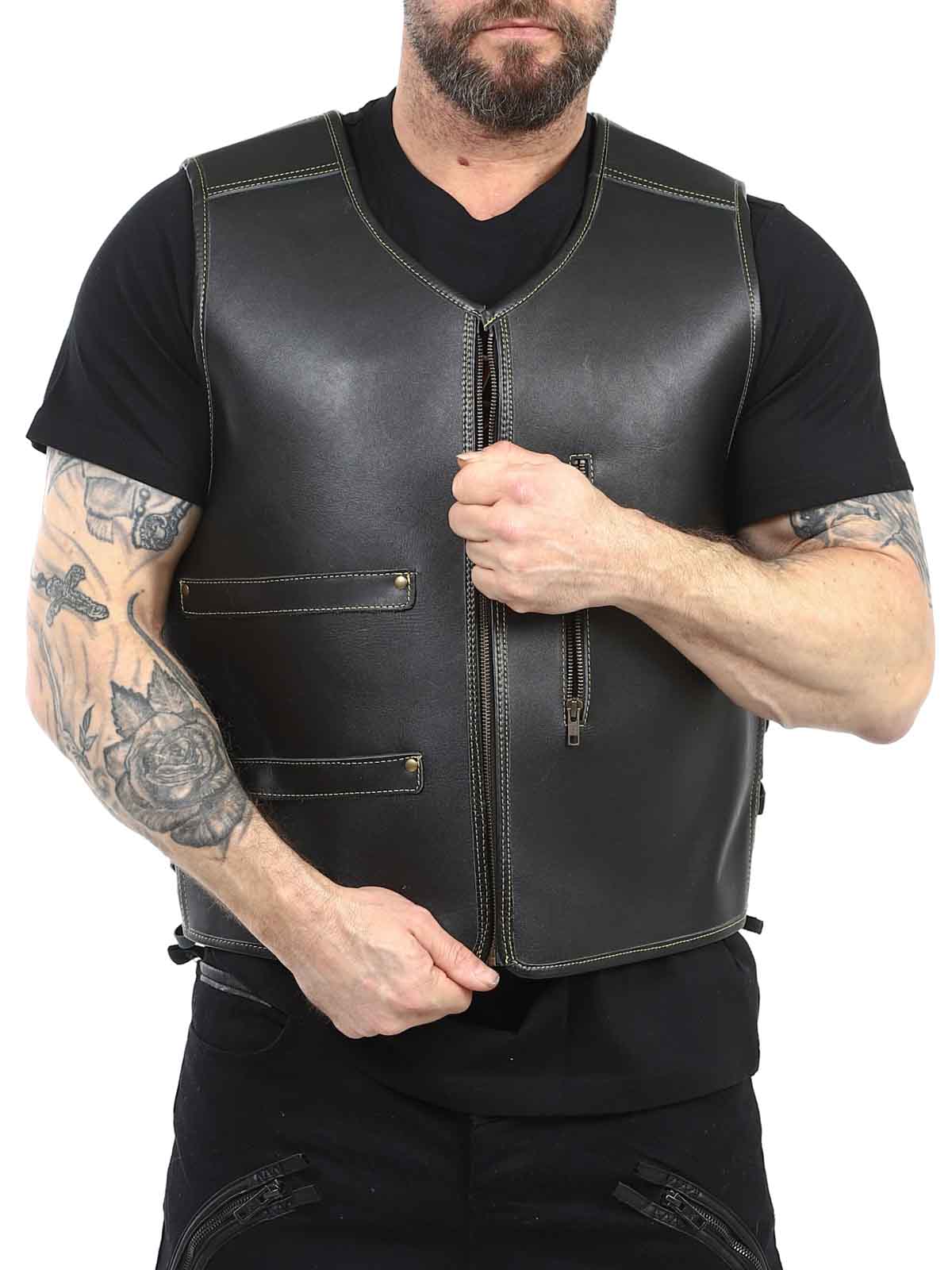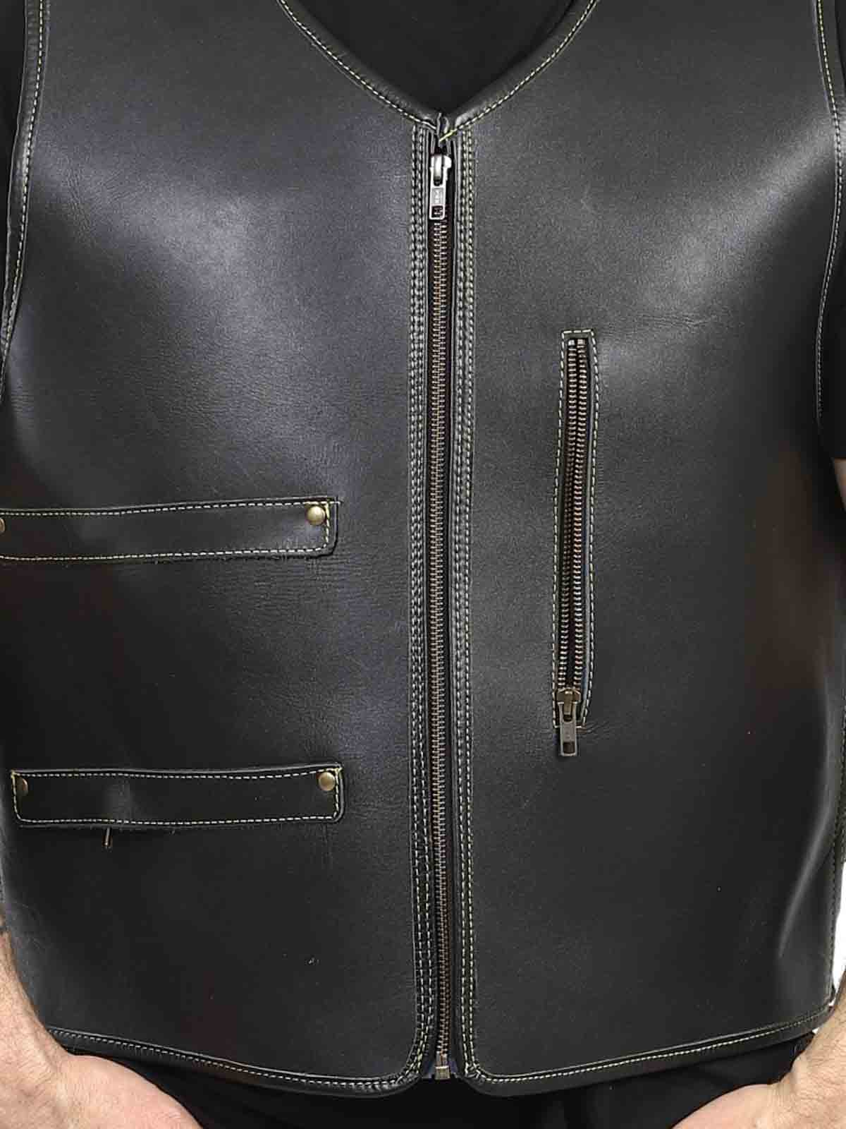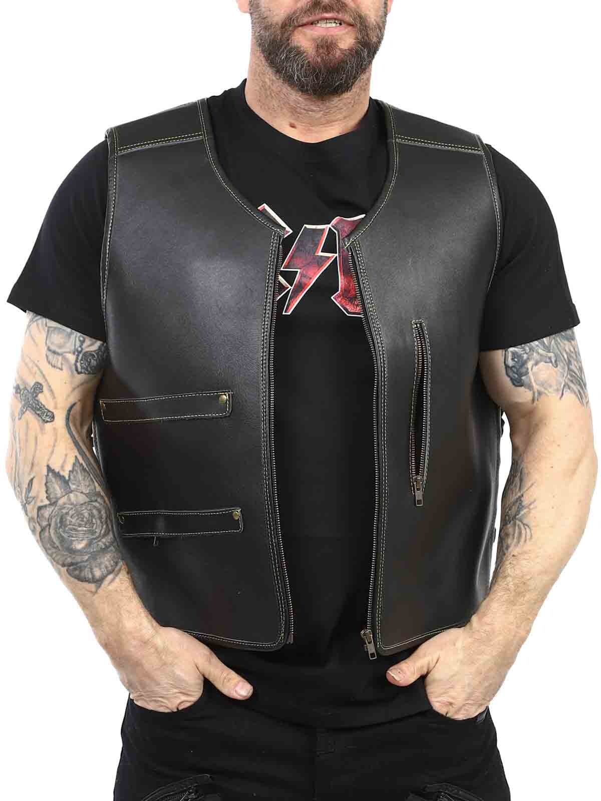 Robust väst i buffelskinn med markerande sömmar. Den har tre framfickor och tre innerfickor, alla med dragkedja för säker förvaring. Sidoknytning för justerbar passform och en snygg touch. Med sin slitstarka design och högkvalitativa detaljer passar västen lika bra på vägen som till dig som vill lägga till ett rejält statement-plagg i garderoben!
