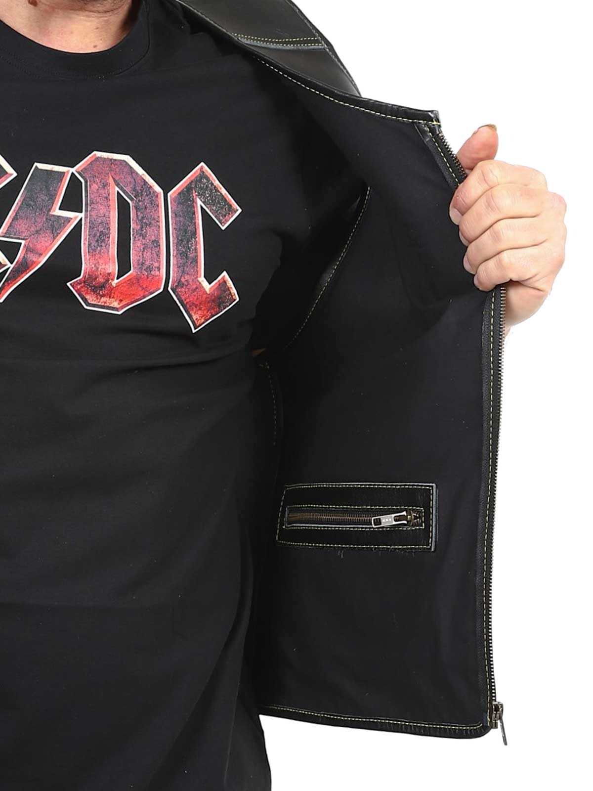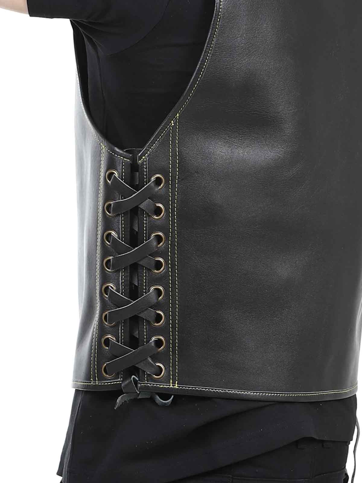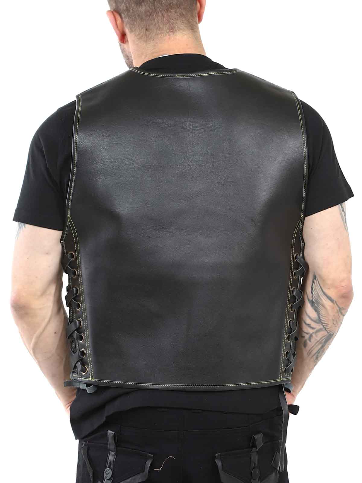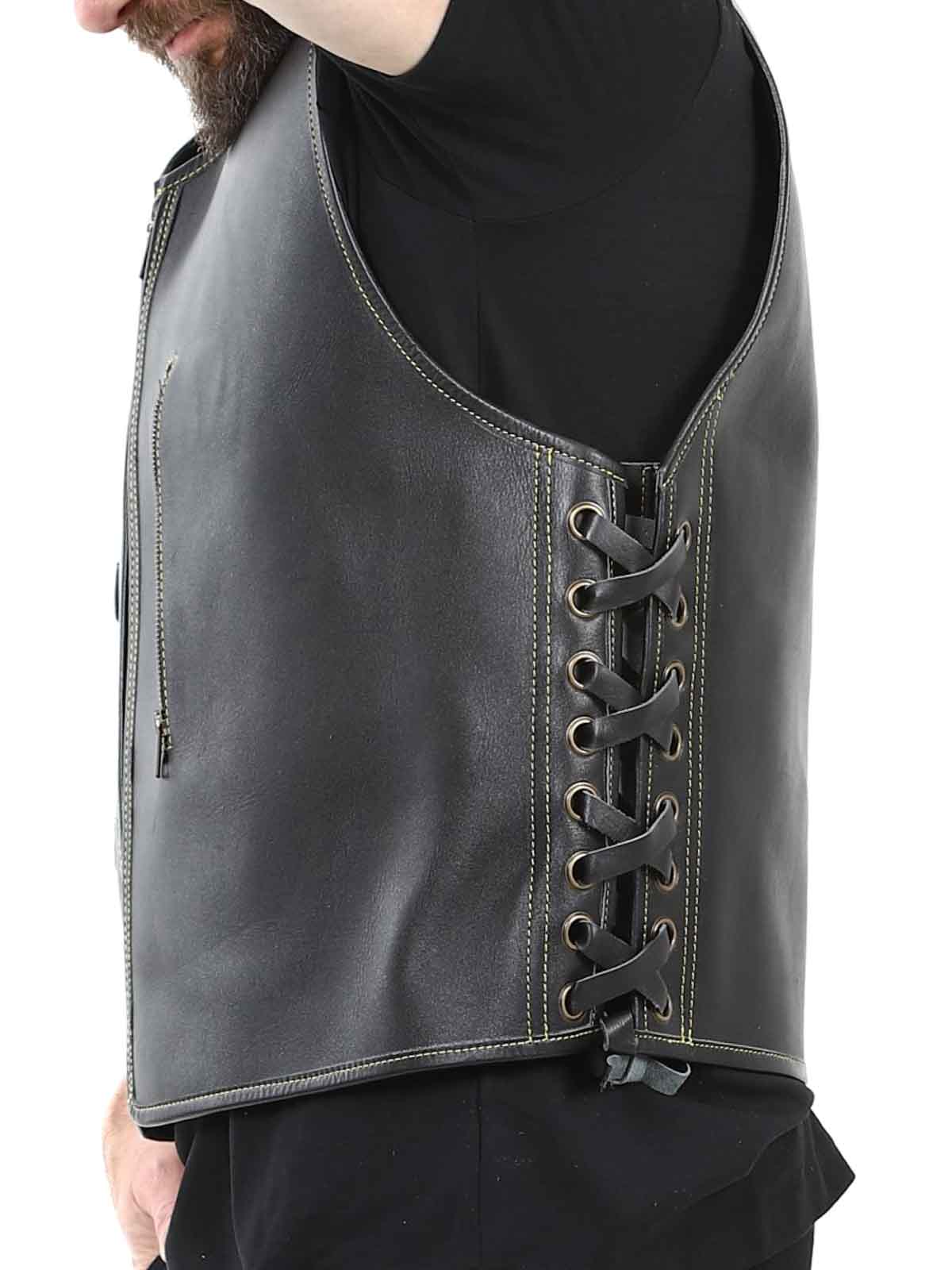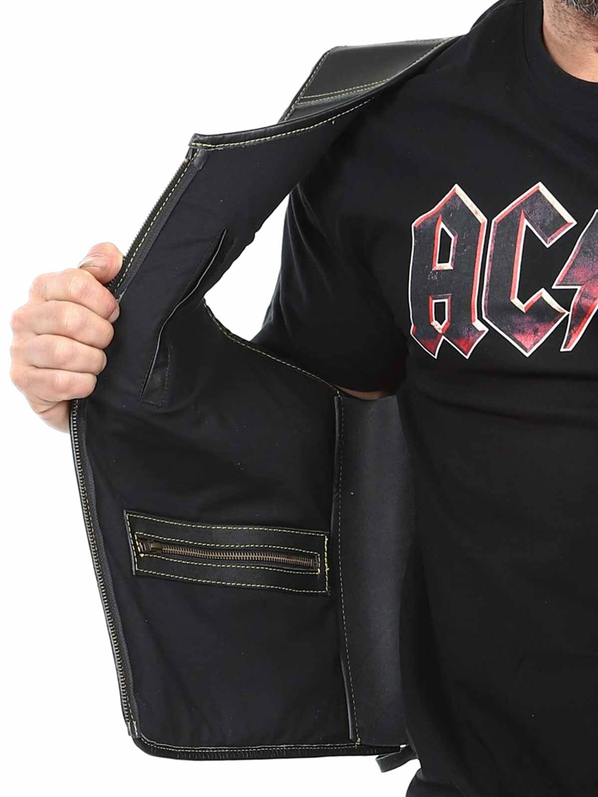Robust väst i buffelskinn med markerande sömmar. Den har tre framfickor och tre innerfickor, alla med dragkedja för säker förvaring. Sidoknytning för justerbar passform och en snygg touch. Med sin slitstarka design och högkvalitativa detaljer passar västen lika bra på vägen som till dig som vill lägga till ett rejält statement-plagg i garderoben!