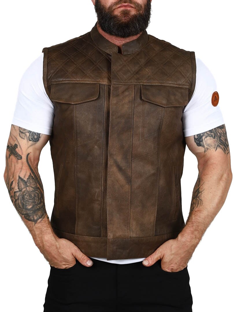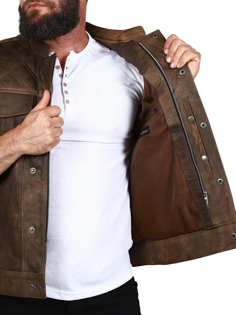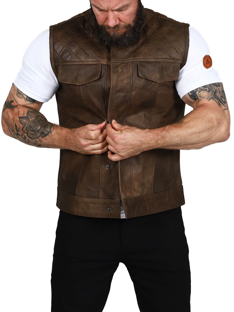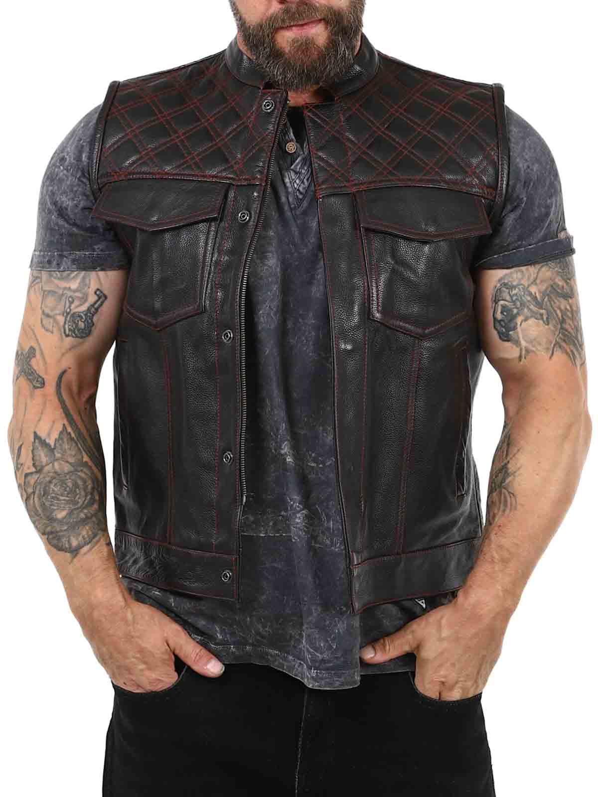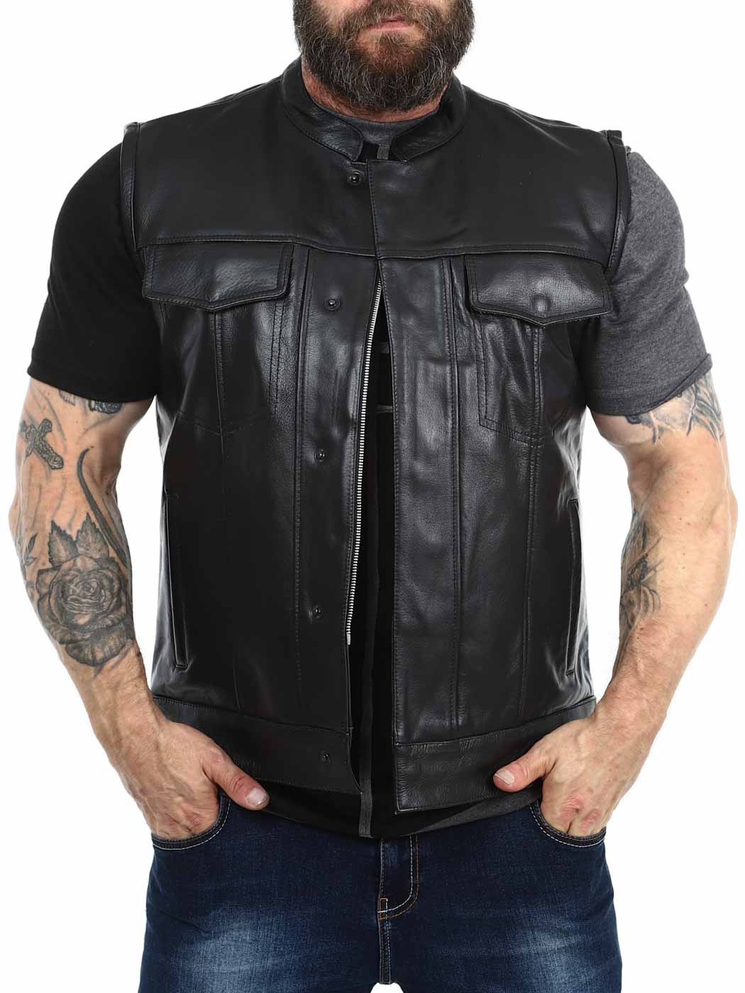 Rejäl skinnväst i äkta läder med låg krage. Det finns två stängbara bröstfickor, två öppna fickor på magen och två öppna innerfickor. Västen stängs med både dragkedja och knappar. Denna väst hittar du endast hos Rockdenim!