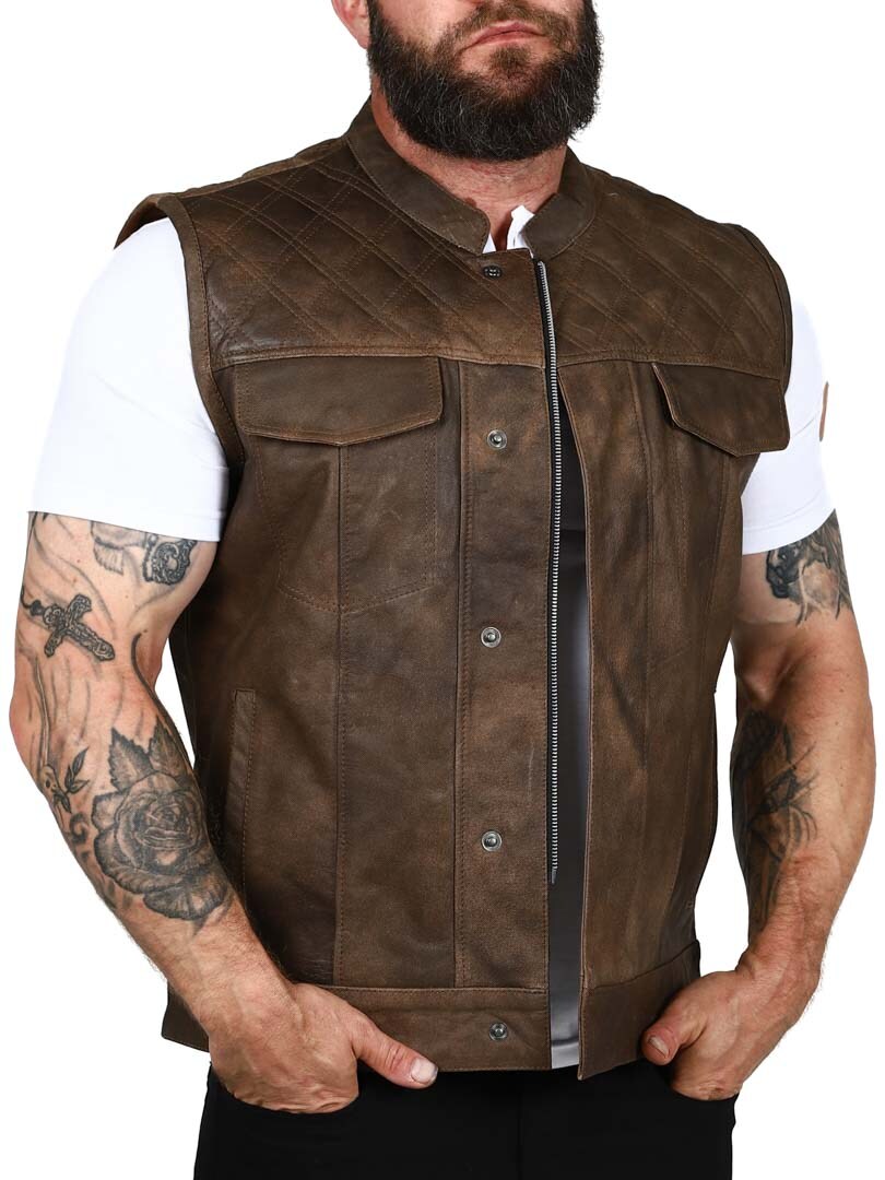 Rejäl skinnväst i äkta läder med låg krage. Det finns två stängbara bröstfickor, två öppna fickor på magen och två öppna innerfickor. Västen stängs med både dragkedja och knappar. Denna väst hittar du endast hos Rockdenim!