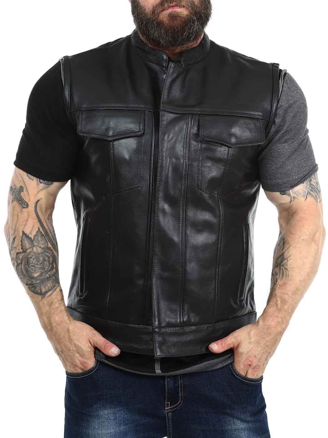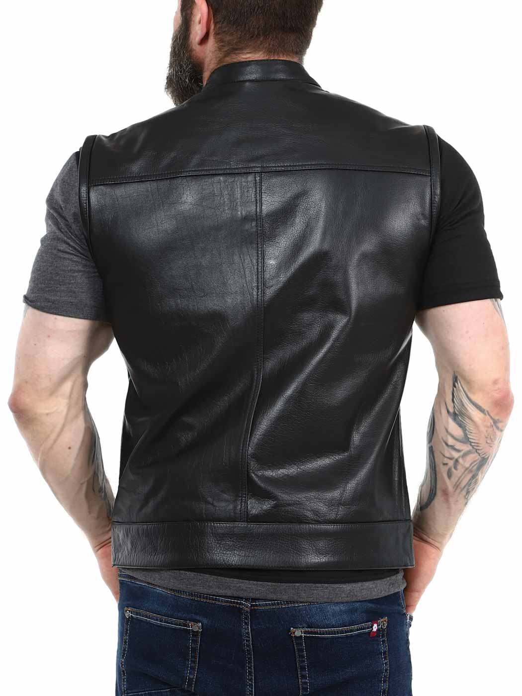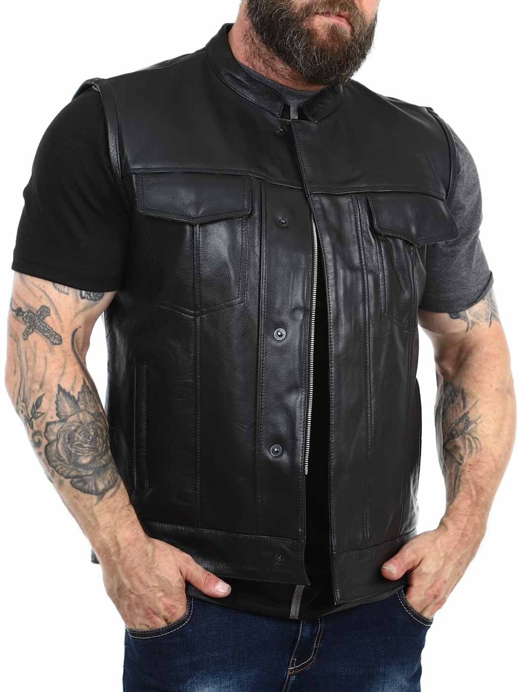 Rejäl skinnväst i äkta läder med låg krage. Det finns två stängbara bröstfickor, två öppna fickor på magen och två öppna innerfickor. Västen stängs med både dragkedja och knappar. Denna väst hittar du endast hos Rockdenim!