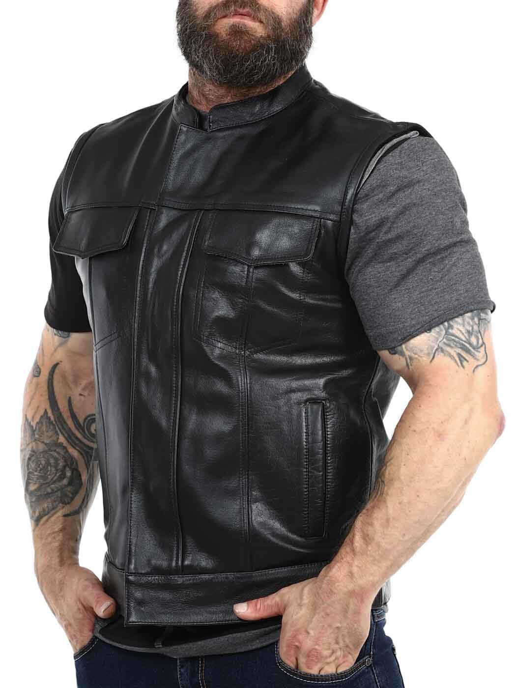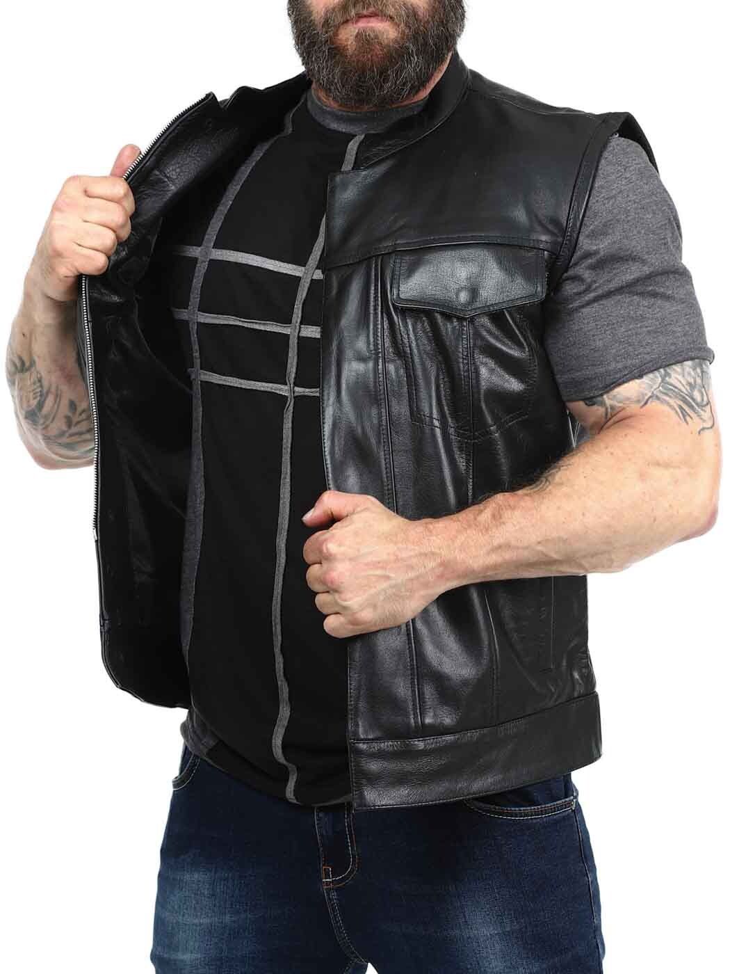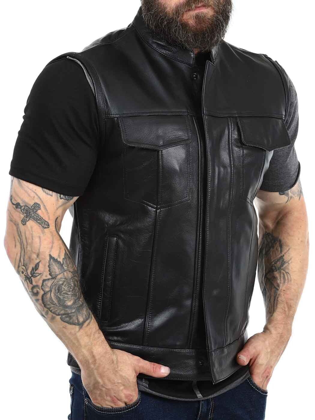 Rejäl skinnväst i äkta läder med låg krage. Det finns två stängbara bröstfickor, två öppna fickor på magen och två öppna innerfickor. Västen stängs med både dragkedja och knappar. Denna väst hittar du endast hos Rockdenim!
