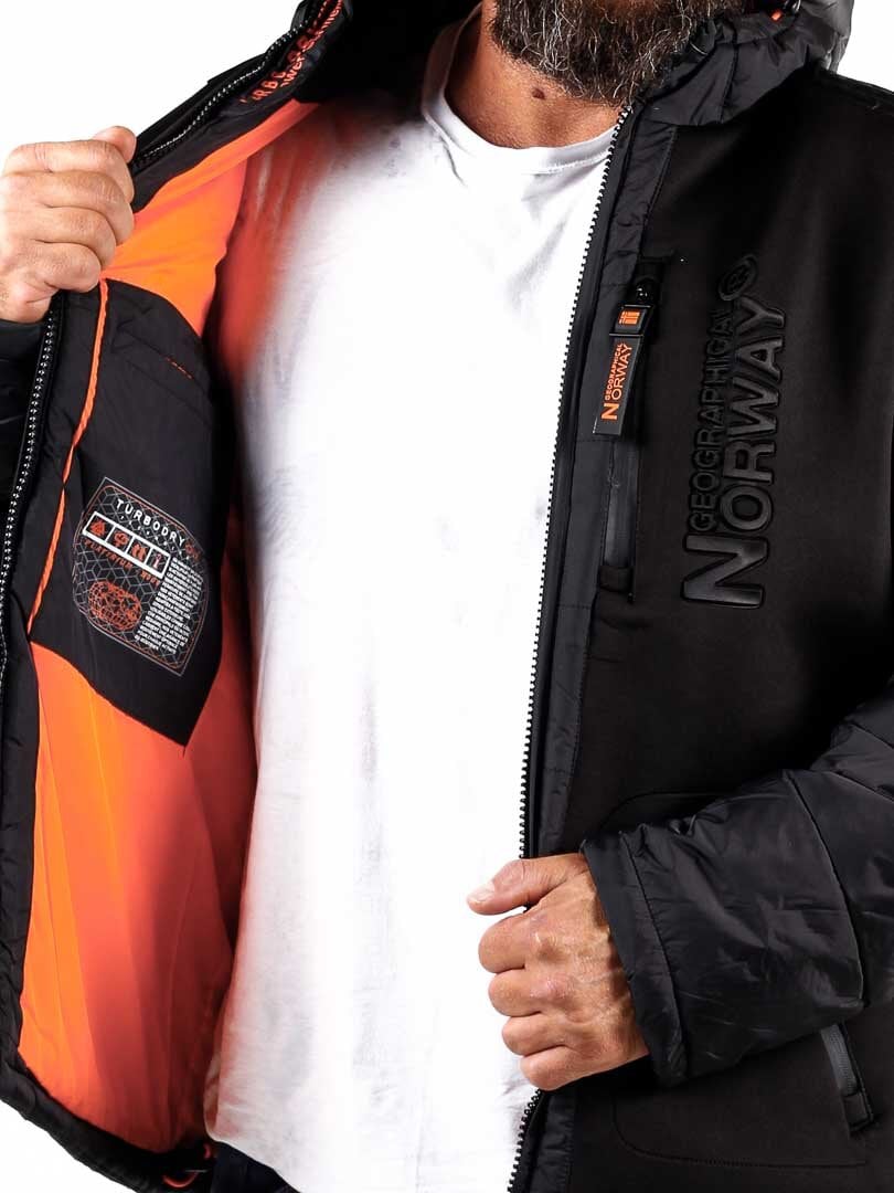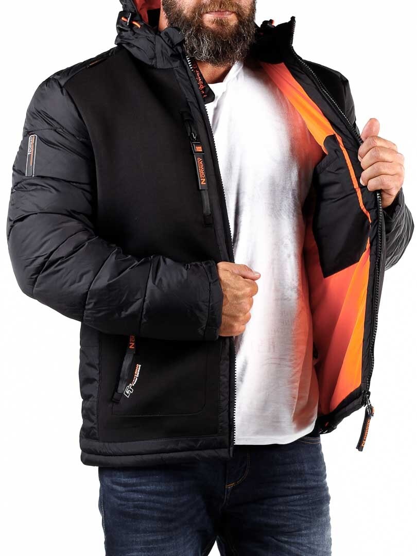 Fodrad jacka som är vind- och vattenavisande. Den har fyra framfickor med dragkedja, samt två öppna innerfickor. Dragsko i huvan och linningen nertill.
